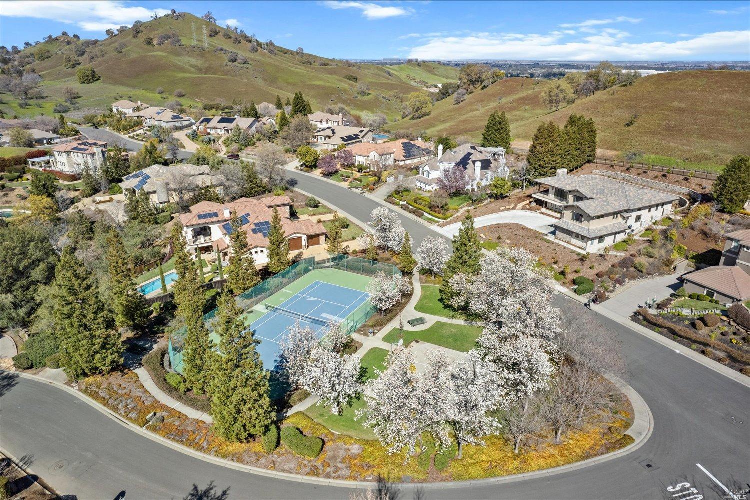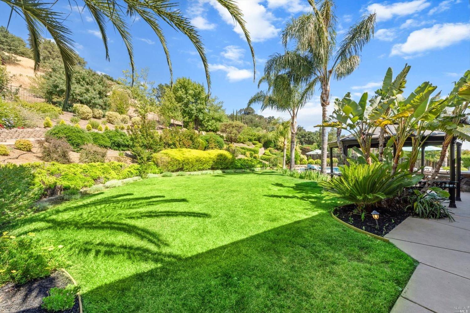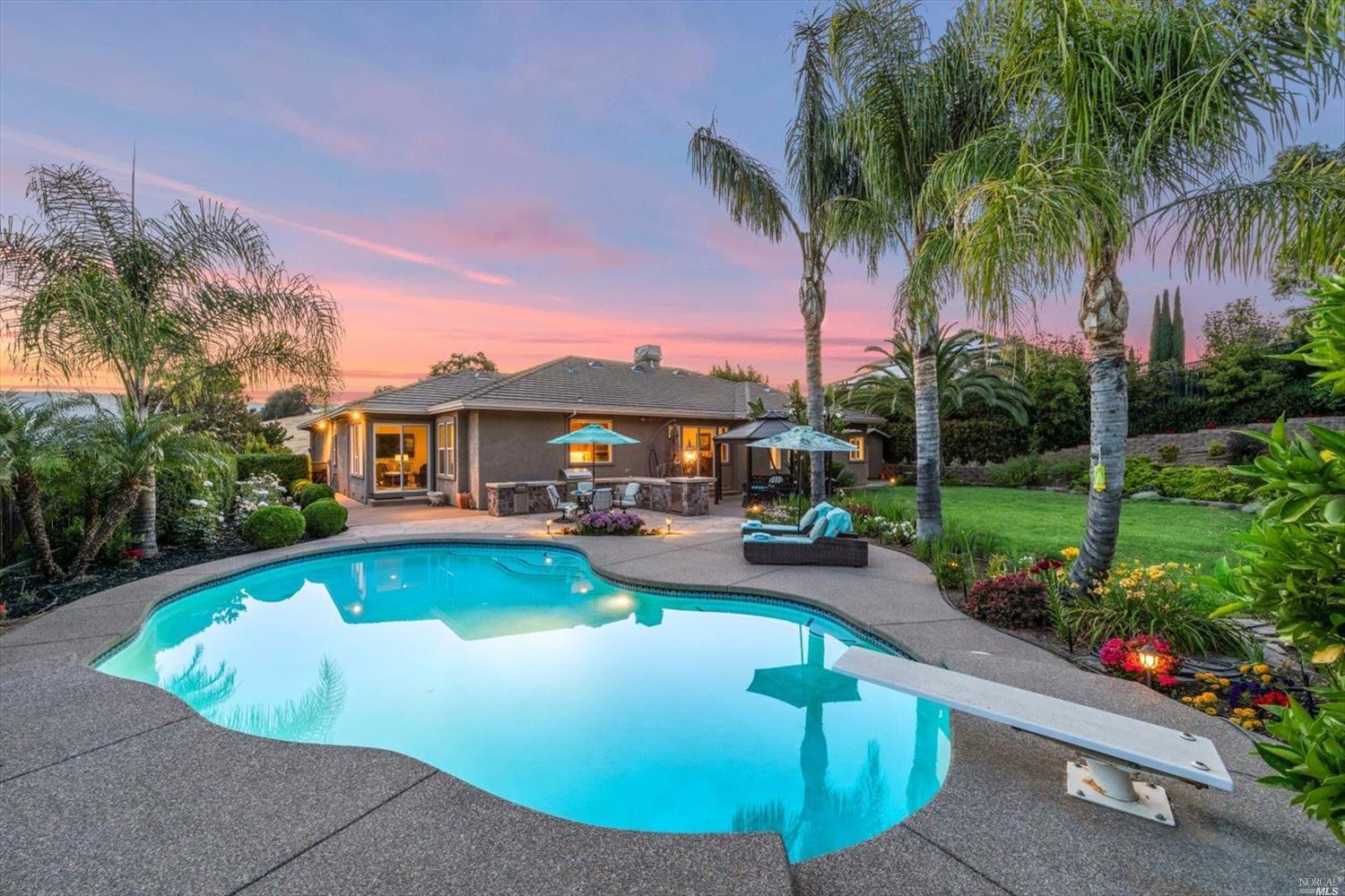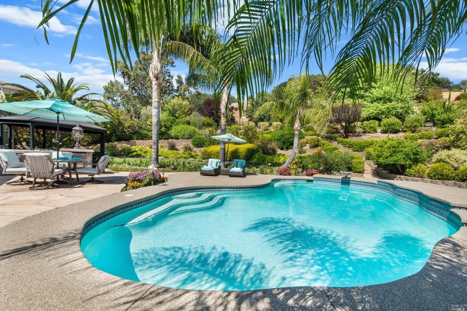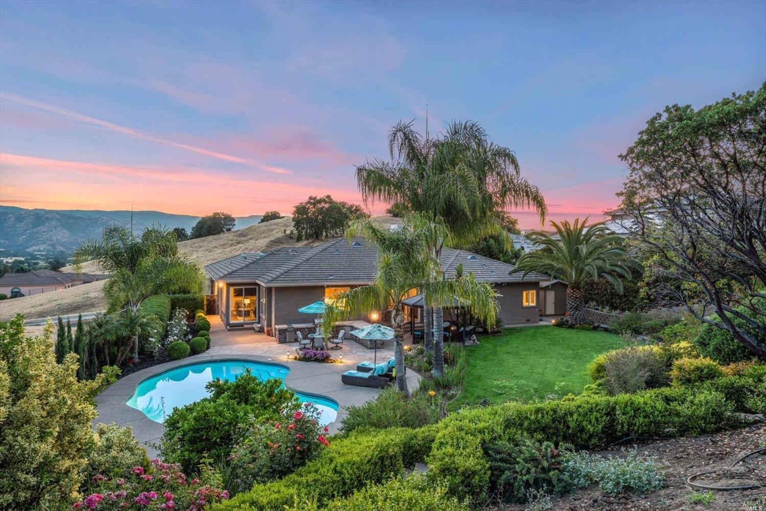 This exclusive custom single-story home located in the affluent gated North Vine Estates community offers a luxurious, tranquil living experience with unbeatable outdoor amenities. Spanning .72 acres of stunning land, this property features a gorgeous sparkling pool, breathtaking views and a 3-car garage. Residence showcases a meticulously designed backyard with a custom outdoor kitchen, lush landscaping, gardens, various fruit trees, lighting, irrigation, retaining walls, concrete walkways, terraced patio, gazebo and shed. As you enter through marvelous wrought-iron front entry door, you'll notice the home's countless elegant finishes including crown molding throughout the 10 ft ceilings, rich oak wood flooring, recessed lighting, sconces, ceiling fans and custom-designed gas fireplace. The gourmet kitchen is a masterpiece with its solid walnut cabinetry and boasts an oversized window with a fabulous view, high-end appliances, cabinet faced/built-in refrigerator and compactor that blend seamlessly, new dishwasher and spacious island with bar seating. Primary suite presents a bay window, marble bathroom with a huge shower, dual sinks and large walk-in closet. This elegant home has no rear neighbors, providing ultimate privacy and is conveniently located near downtown Vacaville.