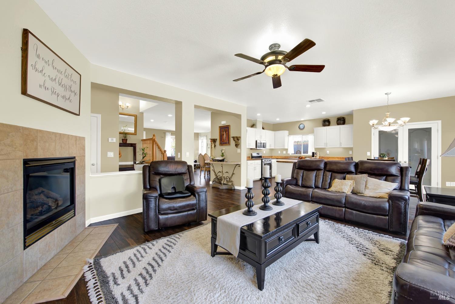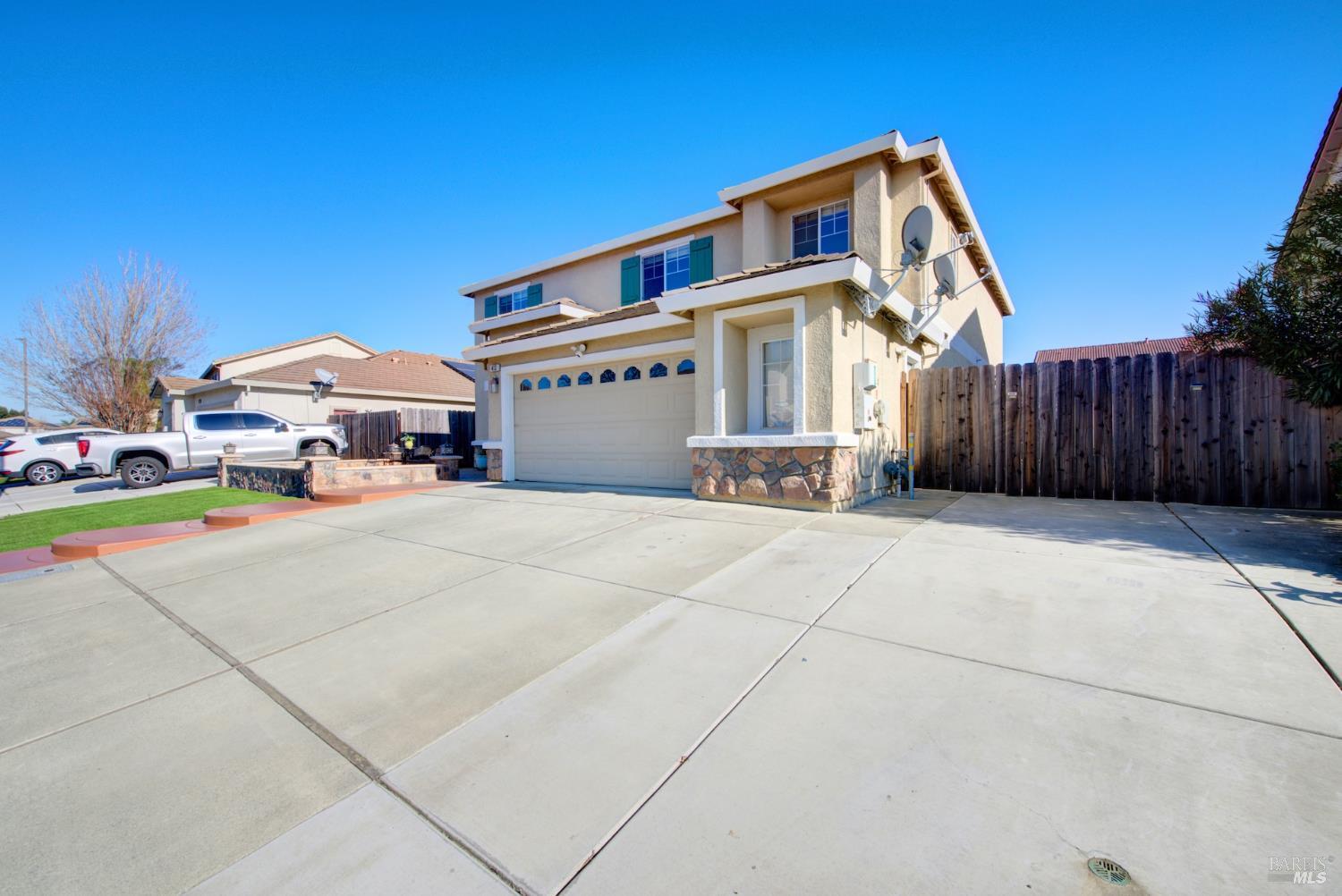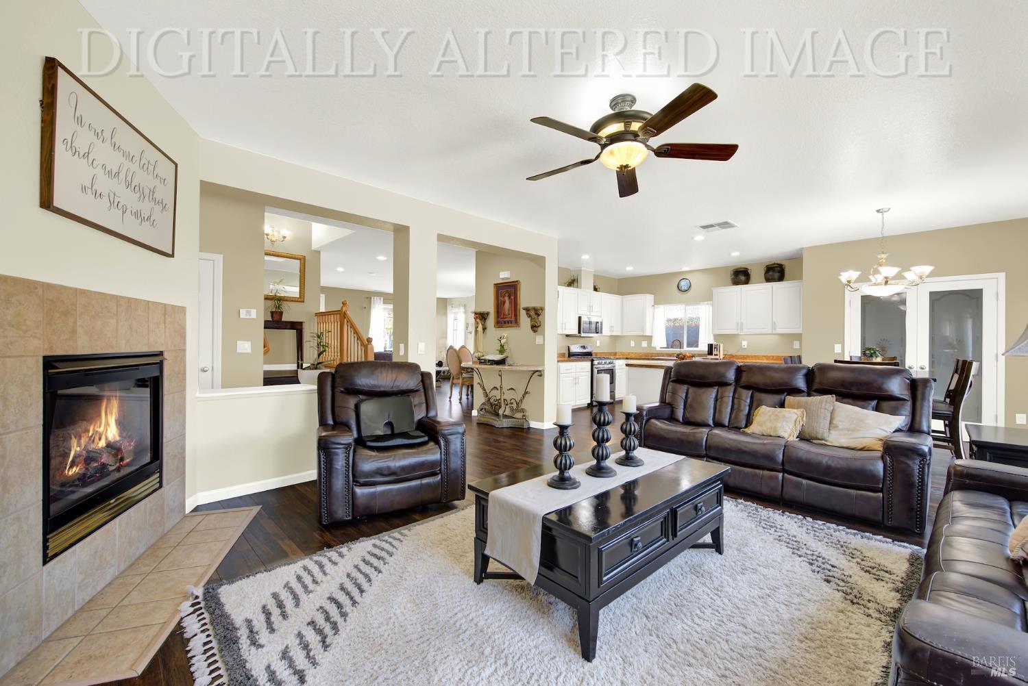 Welcome to this incredible 5 bedroom, 3 bath home with loft, where curb appeal meets functional elegance. The beautifully landscaped front yard features a tiered patio area perfect for welcoming guests and lovely walkway that leads you to the entry. Step inside to discover rich wood flooring and soaring high ceilings that define the living and dining room combination, creating an immediate sense of space and sophistication. The heart of the home flows seamlessly into the great room, where a cozy fireplace sets the scene for gathering with loved ones. This inviting space opens directly to the updated kitchen, a chef's dream featuring crisp white cabinets, a convenient closet pantry, and a generous island ideal for meal prep and casual dining. The kitchen also boasts a sizable dining area, making it easy to entertain while cooking. Designed with versatility in mind, this home includes a full bedroom and bath on the main floor perfect for multigenerational living, guests, or a home office. The low-maintenance landscaping continues in the backyard, where you'll find practical turf grass, multiple patio areas for outdoor entertaining, and a large storage shed. Speaking of storage, the oversized 2-car garage provides plenty of room for vehicles, tools, and all your extras, and the expansive driveway offers excellent RV parking potential. This thoughtfully designed home offers the perfect blend of style, space, and functionality for modern living.