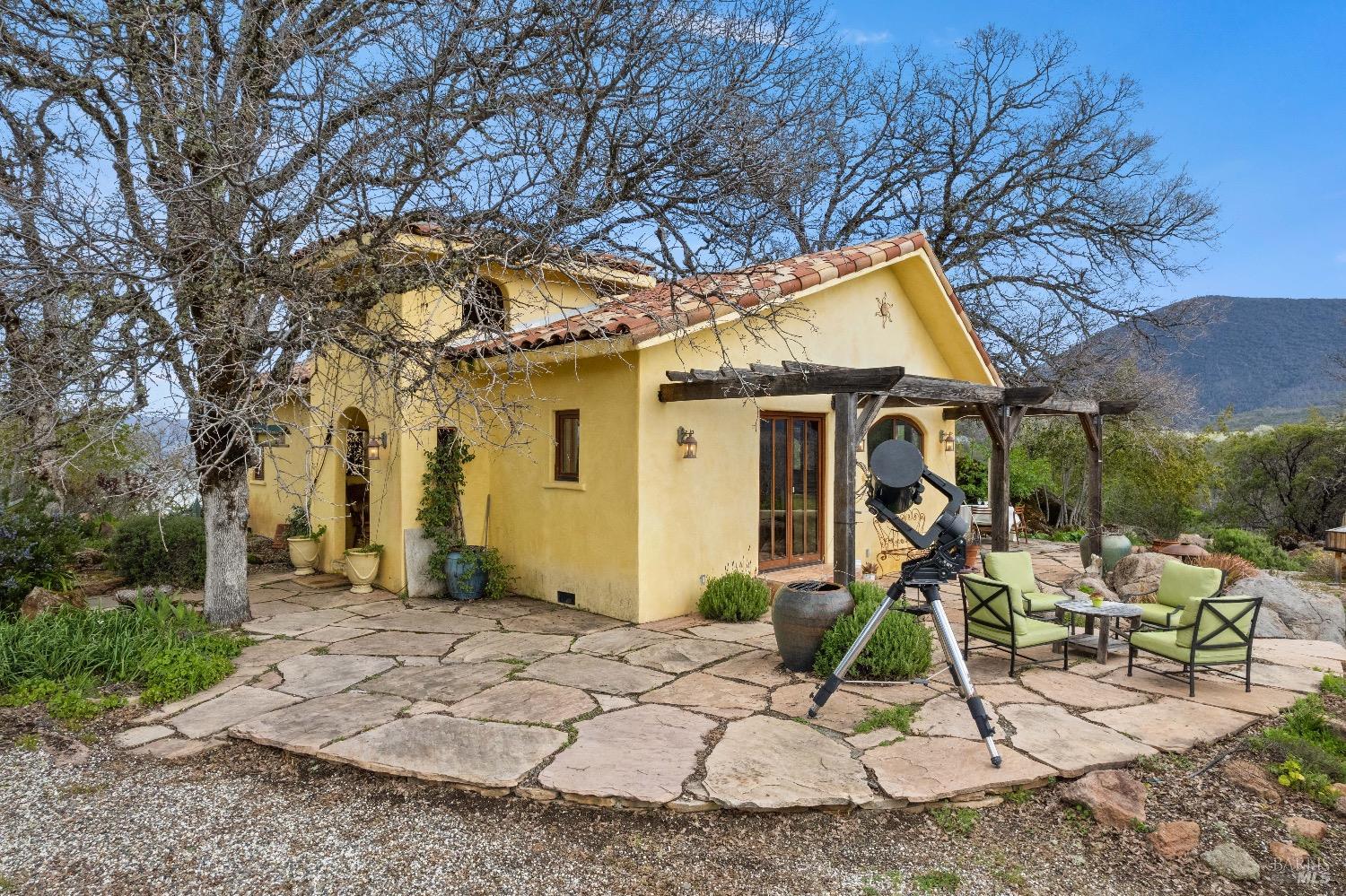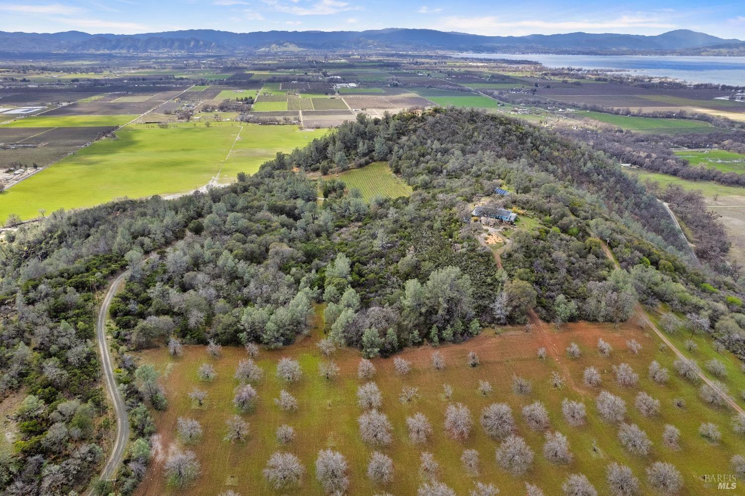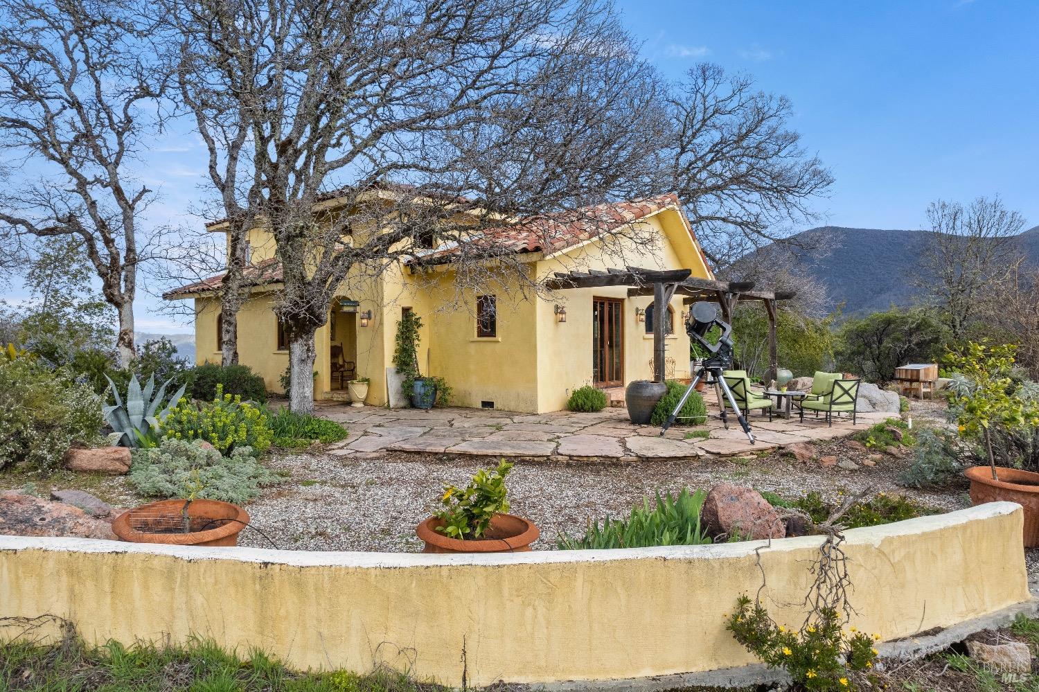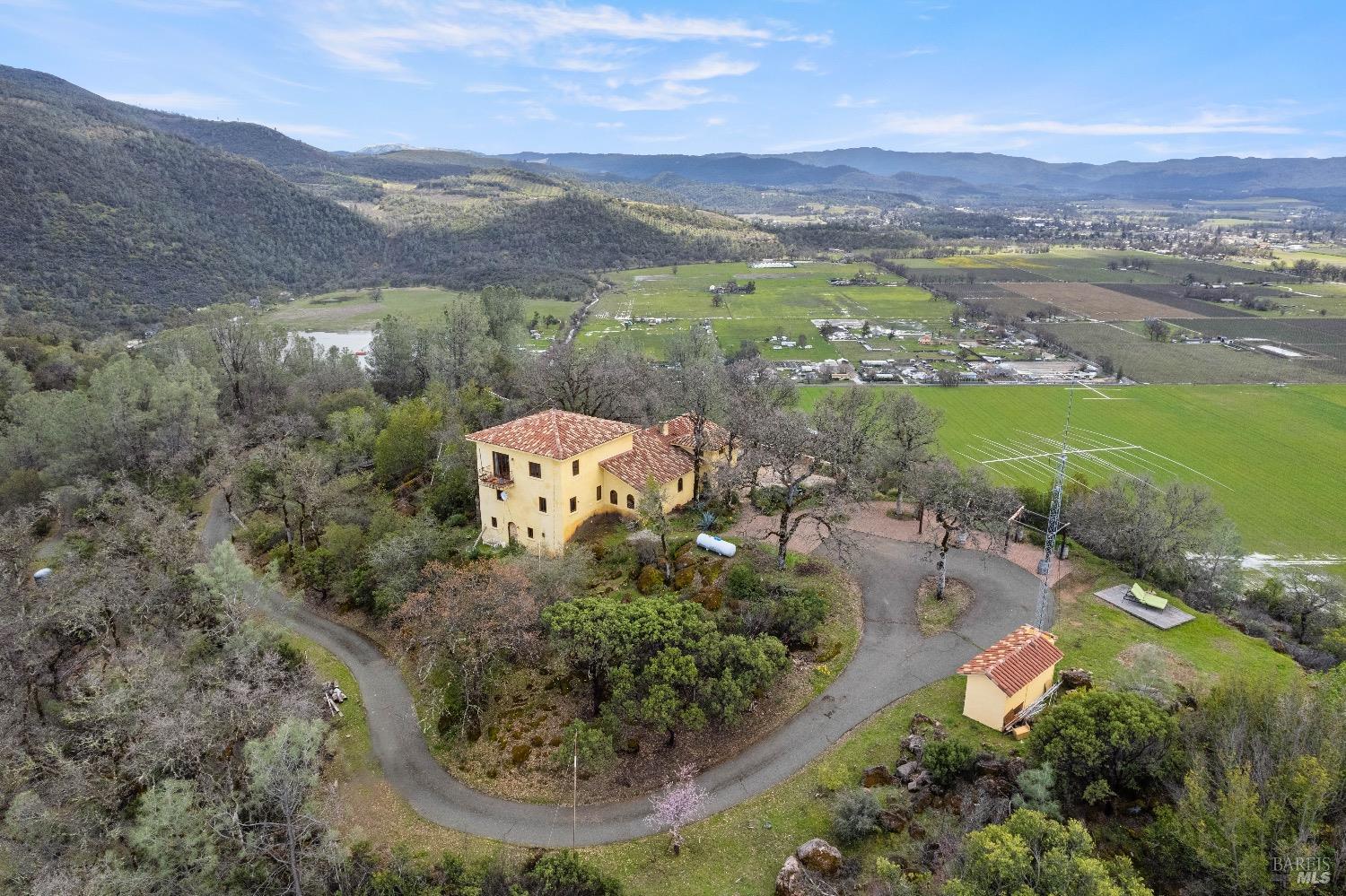 Incredible Tuscan Villa atop Mount Dali-Dona with incredible panoramic views. Set on 27-/+ Acres. Comprised of two parcels. The property hosts a 1.6 acre Rhone varietal hobby vineyard & a detached structure previously used as a winery. You will feel like the rest of the world disappears the moment you enter this property. As you make your way up the wildflower-lined driveway, the manzanita and mature oaks will welcome you to this incredible home. The residence is built with imported antique beams, French country-style kitchen with fireplace, quartzite counters, unique old-world aesthetics, heated floors, dual solar/PG&E power, and wood stove in the living room. The Main Home features 3 levels, 3 bedrooms and 3 bathrooms, wine cellar, large basement, formal living room, office & walk-in pantry. Beyond the home, a raised bed garden with a planting house, fruit trees and private hiking trails. This expansive yet cozy home is full of charm and has unparalleled views from every angle. Close to downtown Kelseyville, restaurants and shops. Borders the Clear Lake State Park with great hikes, lake access and camping. Secluded and peaceful, this property offers an incredible opportunity to observe wildlife and disconnect from the day-to-day hassle. ADU Potential.