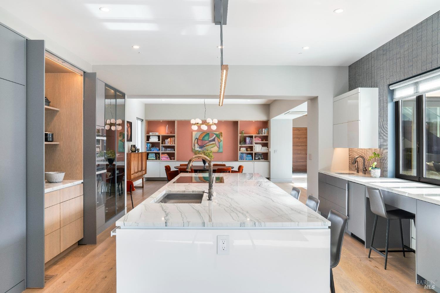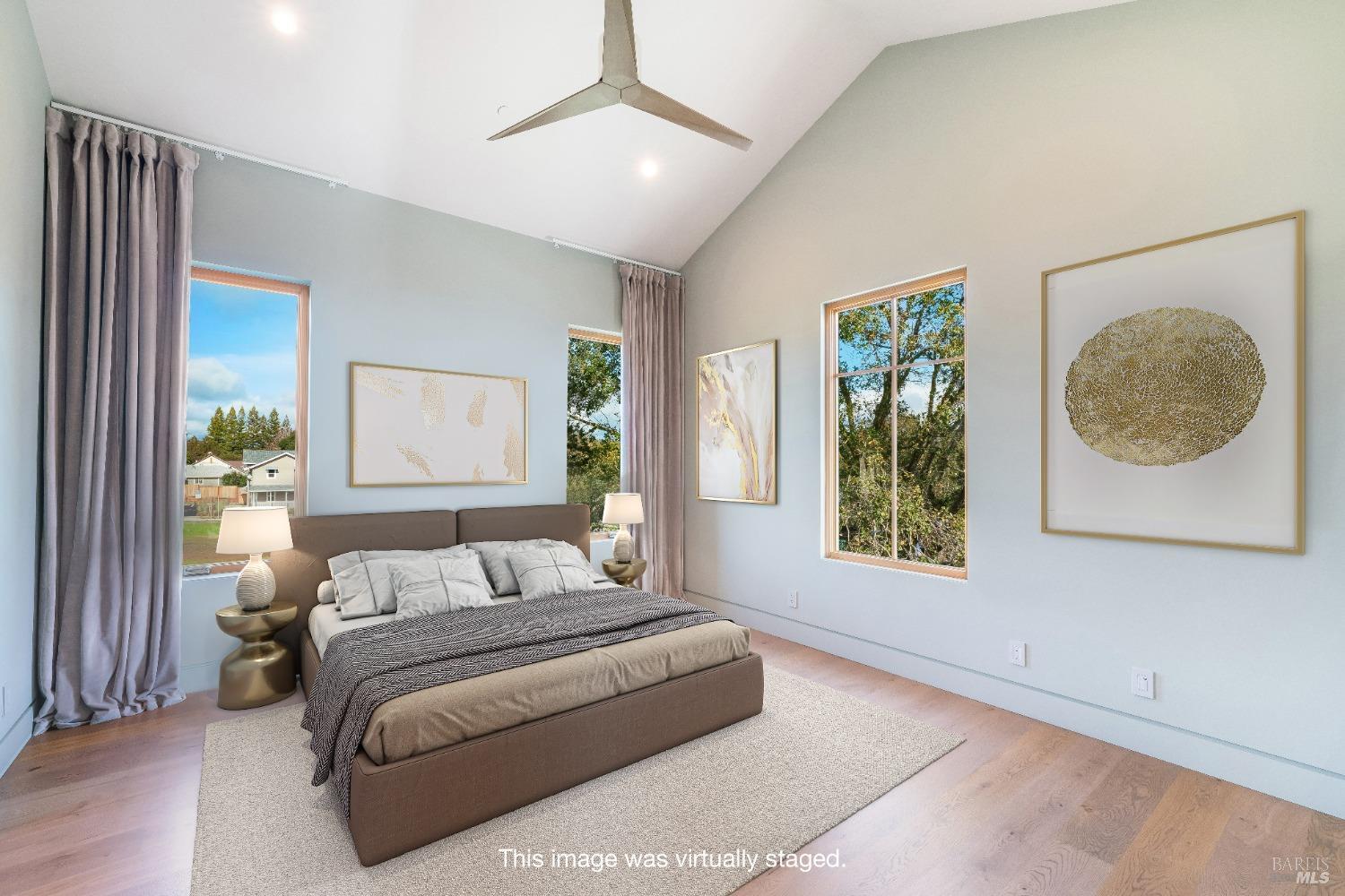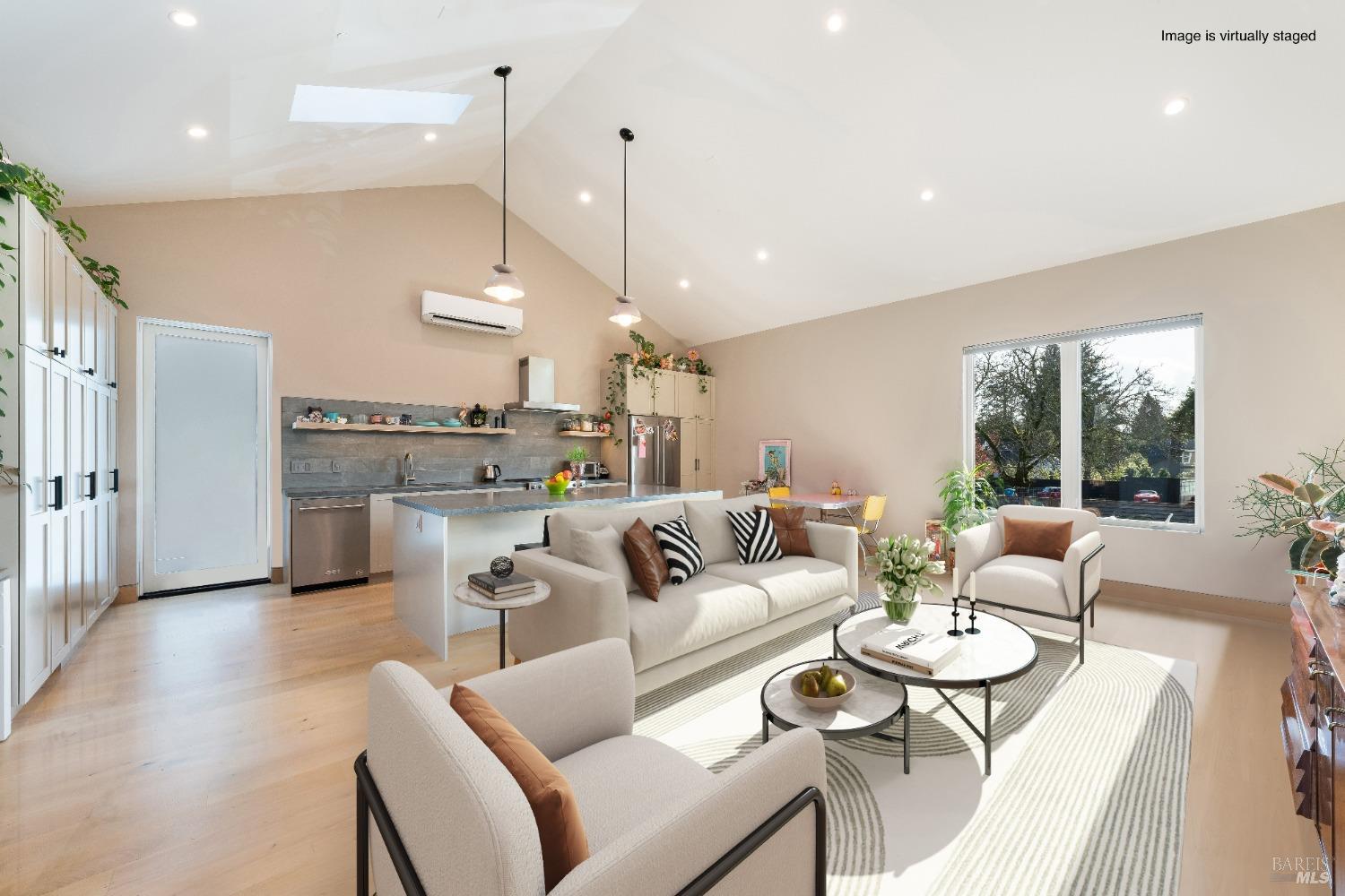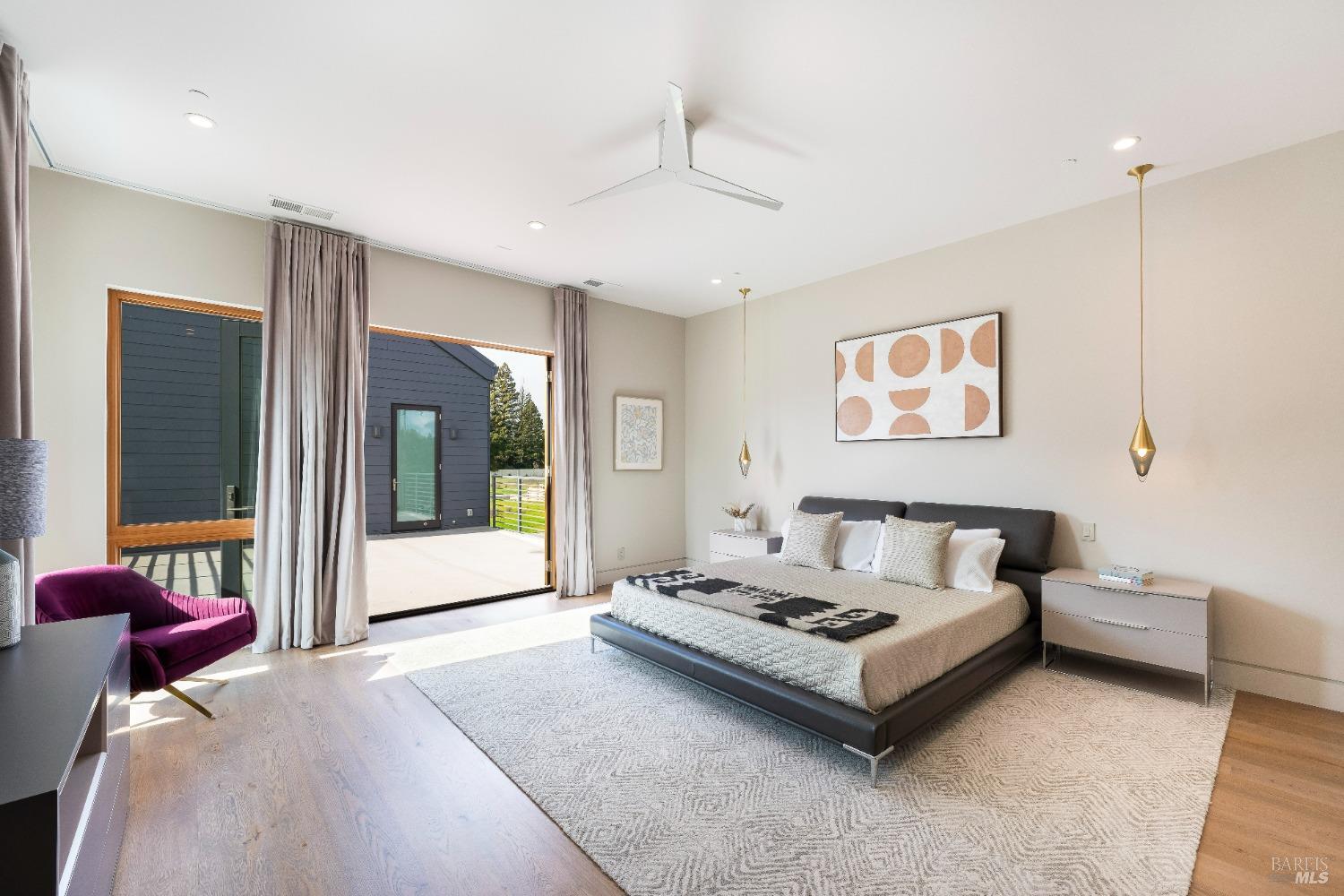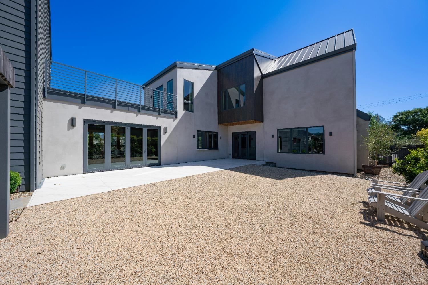 A striking example of modern Wine Country architecture, this two-level residence offers a refined balance of luxury with a commitment to design integrity, enduring quality, and livability in downtown Healdsburg. The modern aesthetic is purposeful rather than trendy, emphasizing proportion, texture, and craftsmanship. Thoughtfully conceived and expertly executed, this 4-bedroom home and separate 1-bedroom/1-bath ADU is set on approximately 1/3 acre. The interiors are defined by clean lines and showcases soaring ceilings, a striking centerpiece fireplace, a dramatic suspended staircase, and expansive walls of glass that flood the interiors with natural light. The well-balanced floor plan includes four bedrooms and 3.5 baths, a generous executive office, and beautifully appointed living and dining spaces ideal for both daily living and elegant entertaining. The sleek chef's kitchen features gray-toned cabinetry, premium Miele appliances, an adjacent breakfast room, and a large butler's pantry. Throughout the home, refined architectural details are paired with a sophisticated palette of soft textures and tones. Each level is designed to enhance functionality and comfort, offering flexibility for hosting, working from home, or a quiet retreat. The result is a residence that feels intentional and balanced. French doors open to a landscaped patio and pergola, offering seamless indoor-outdoor living and ample space for a pool, if desired. The guest studio/ADU provides exceptional flexibility, featuring a full kitchen, laundry, living and dining area, and a spacious bedroom and bath - perfect for extended family, guests, or a caregiver. A shared upper deck connects the ADU and main residence. Set in one of Northern California's most coveted Wine Country destinations, the property enjoys a rare downtown Healdsburg location just moments from the historic Plaza, acclaimed restaurants, tasting rooms and boutiques. This is a distinctive opportunity to own a refined architectural home where modern design, luxury finishes, and an exceptional location converge in one of Sonoma County's most vibrant communities. Some images have been digitally enhanced. Those and all unaltered images are available in the photo gallery.