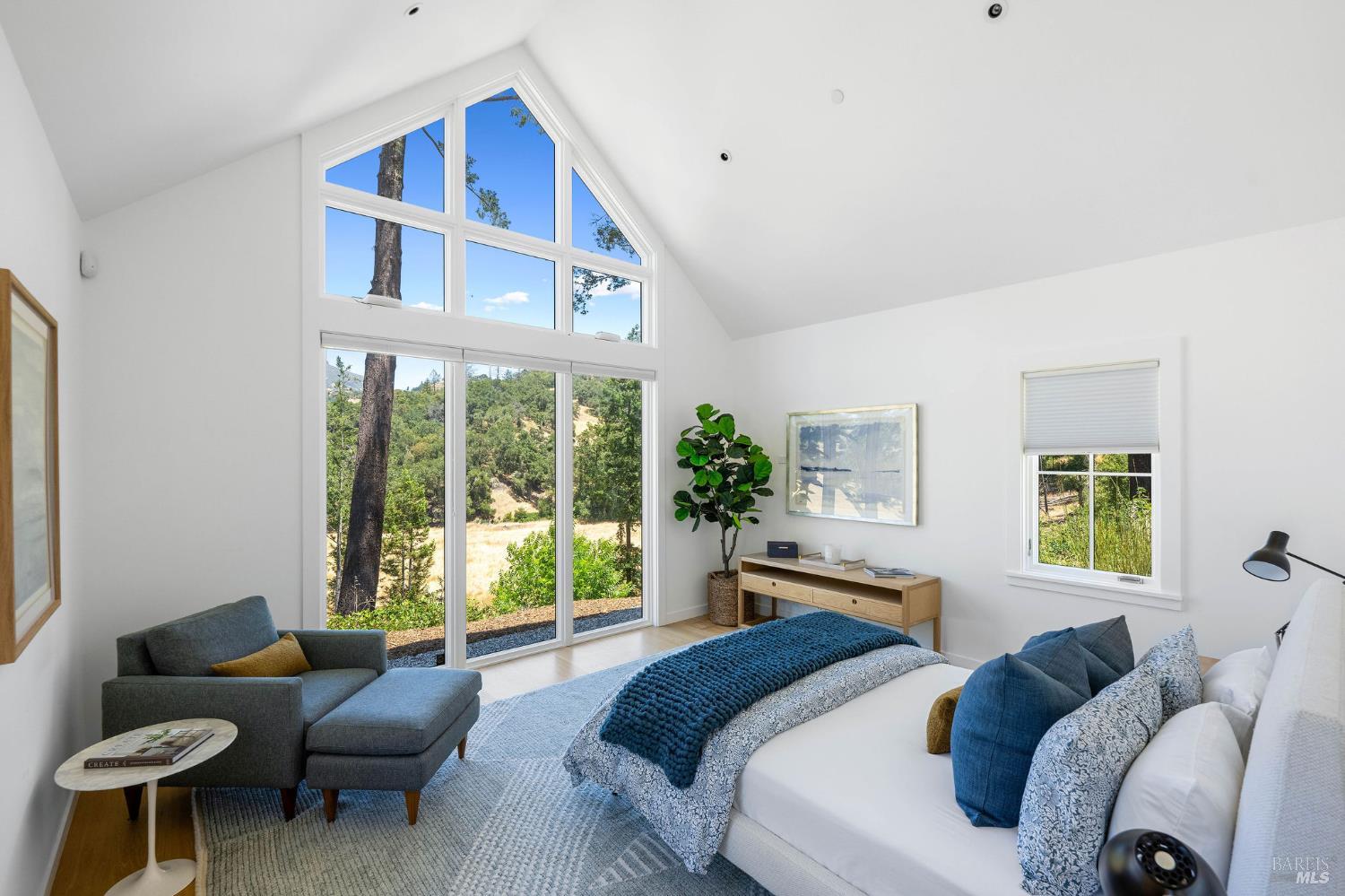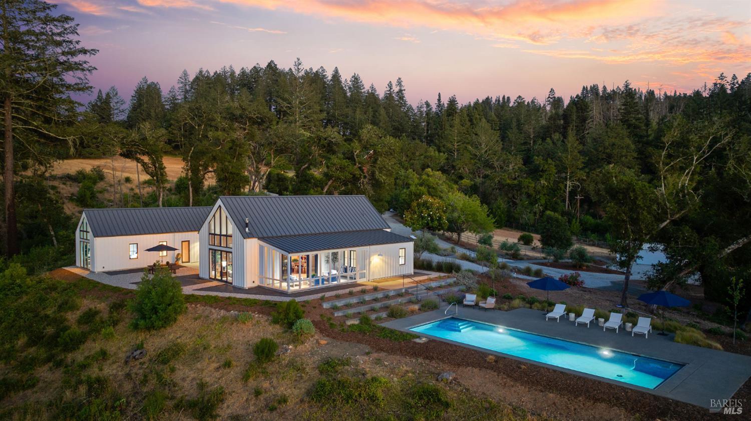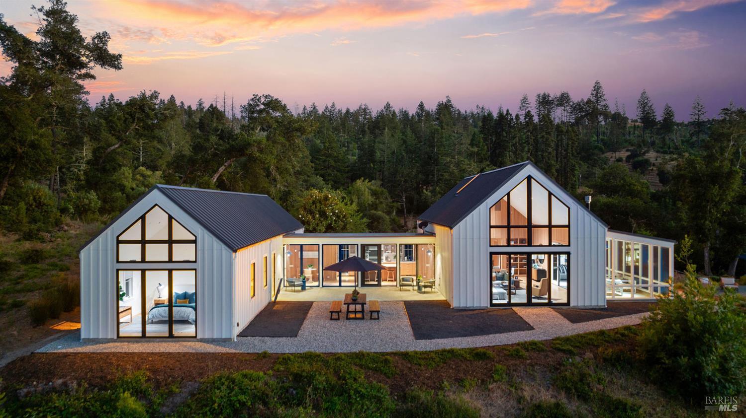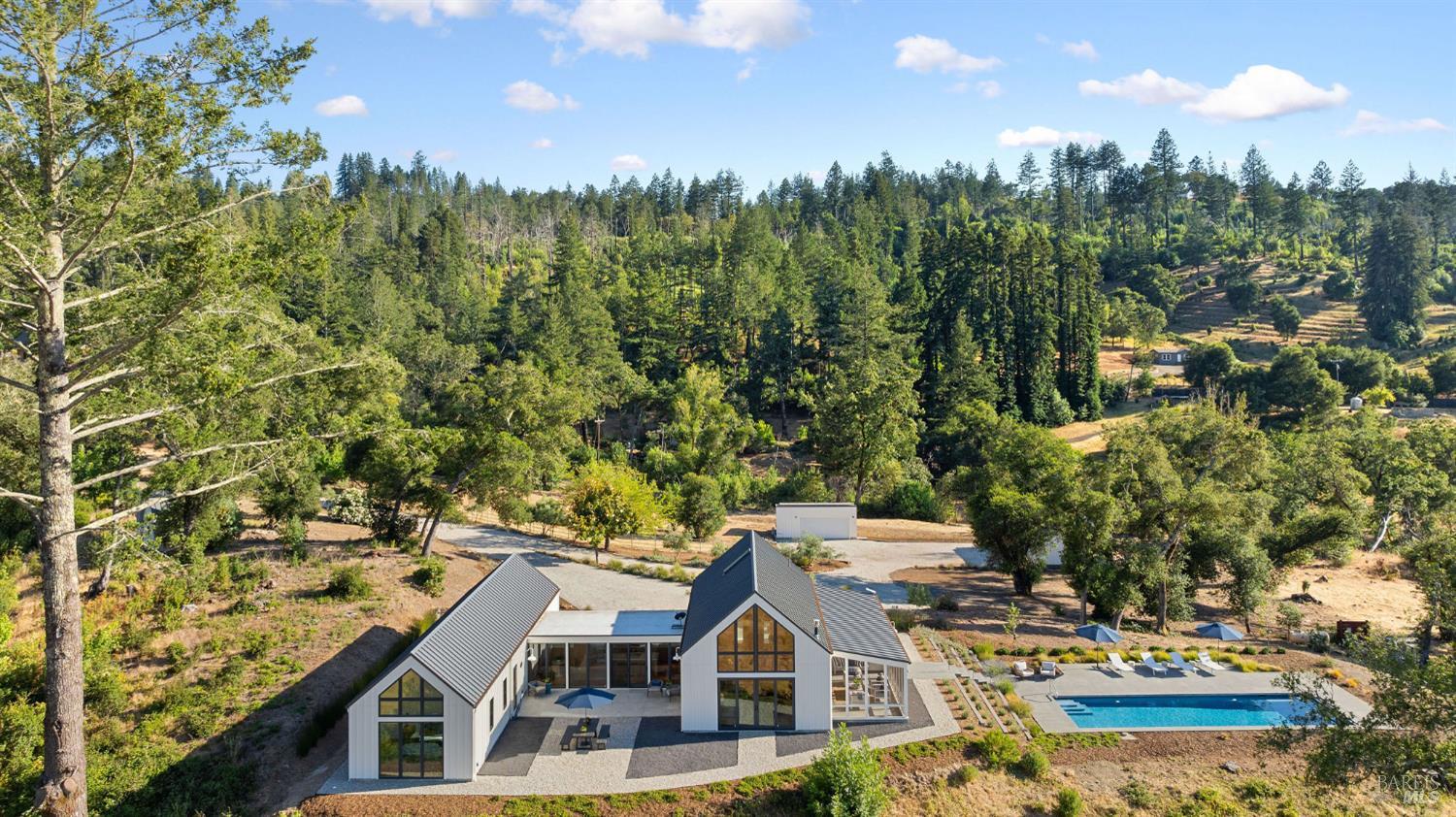 Just beyond the gate, a winding drive leads you to where the world opens up Mount St. Helena rising in the distance, vineyards in the valley below, and light dancing across 20+ acres of unspoiled land. Here, a newly completed modern farmhouse invites you to slow down, stretch out, and savor the rhythm of Wine Country living. Wake to sunrises framed by the soaring windows, spend golden afternoons beneath towering trees, and entertain effortlessly in the sunroom overlooking the pool. Every space is beautifully designed to connect you to the land thoughtfully built with modern style, warmth, and quality. The separate 1BD/1BA suite with a kitchenette offers comfort for visitors, while open acreage awaits vines, horses, gardens, sports courts, and anything you can envision. Secluded yet minutes to Calistoga's vibrant downtown, the 3,903 sq ft main home includes 3 BD/3 BA, and an open layout filled with light. Vaulted ceilings, custom paneling, wide plank floors, and soaring windows distinguish the great room, while the chef's kitchen includes Wolf and SubZero appliances, and a patio for dining al fresco. The primary suite has panoramic views, a spa-like bath, and a large walk-in closet. This is more than a home it's a quality of life rooted in nature, beauty, and possibility.