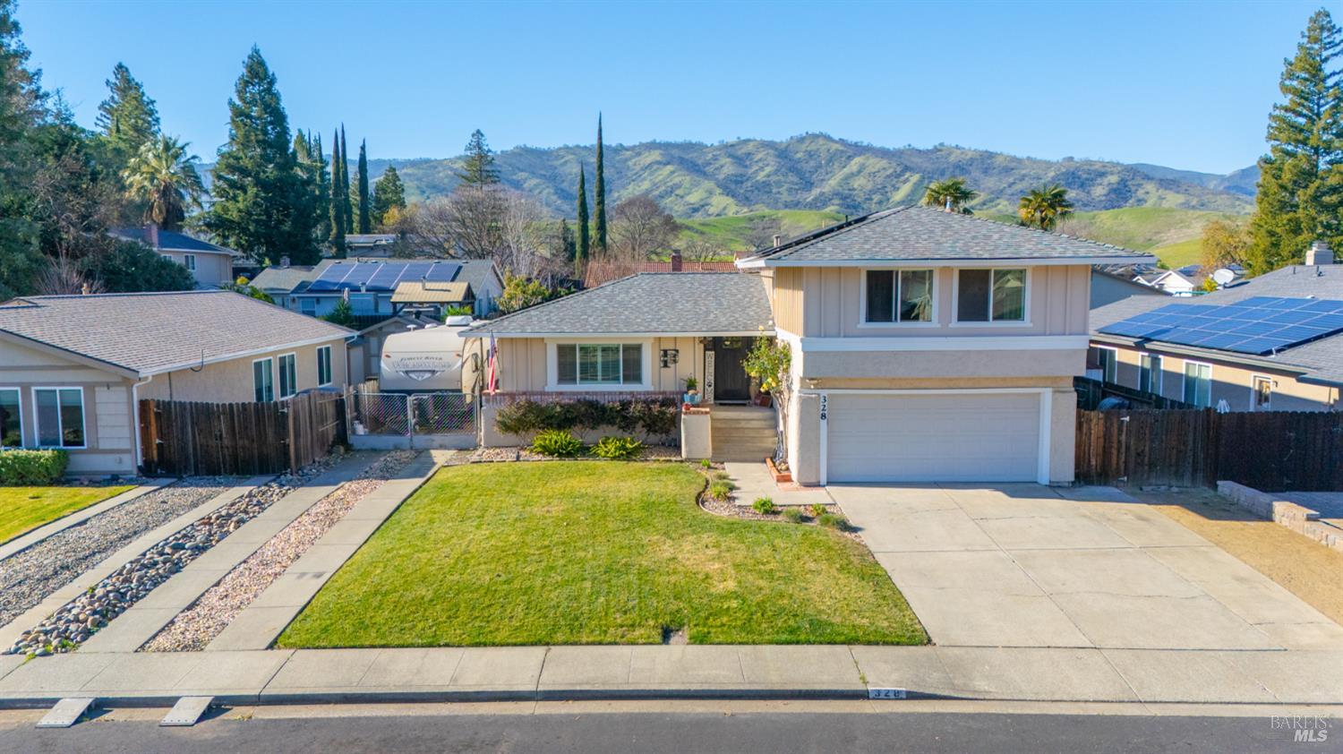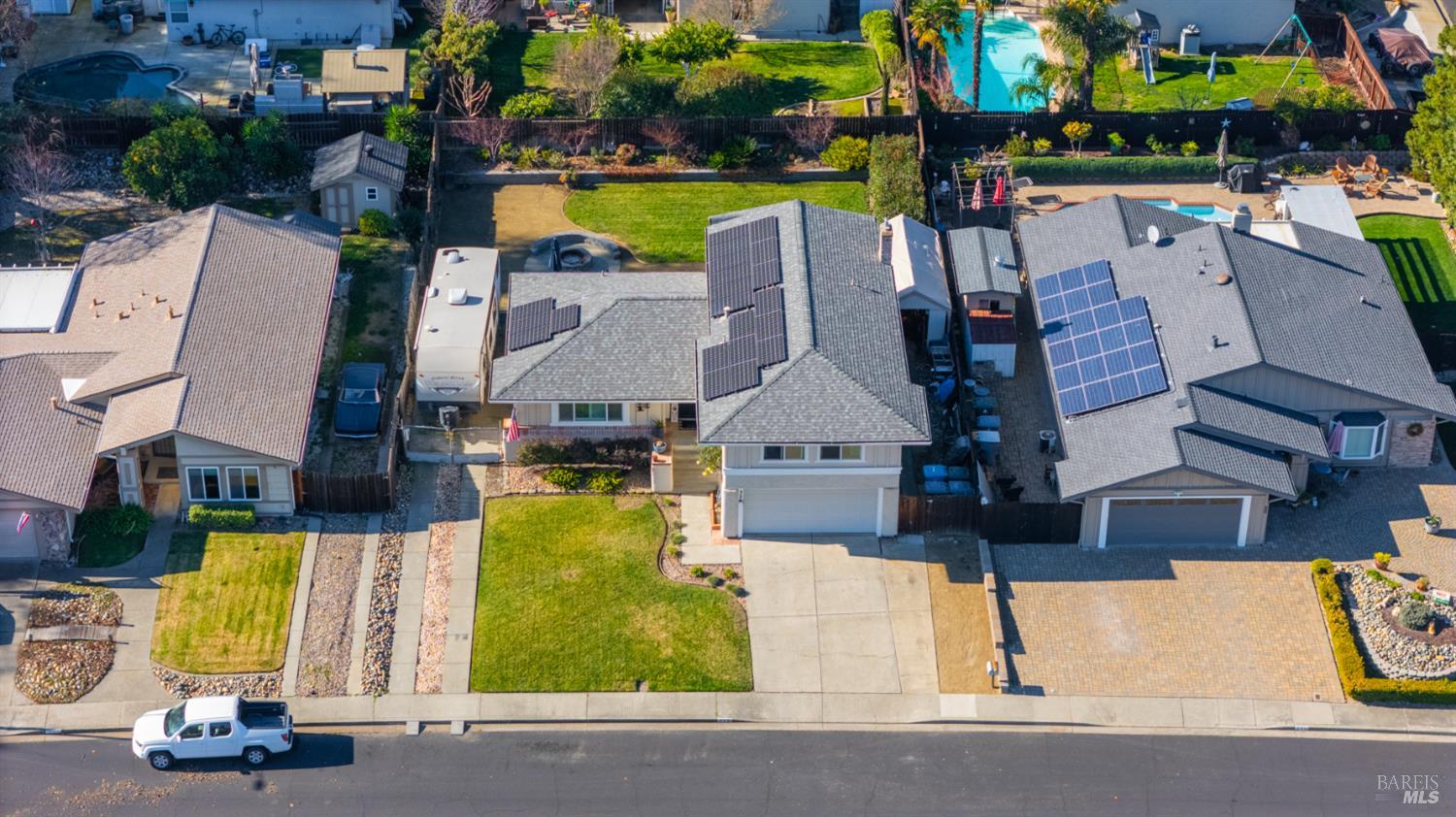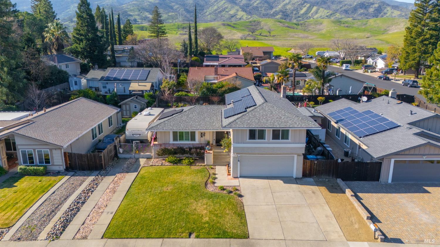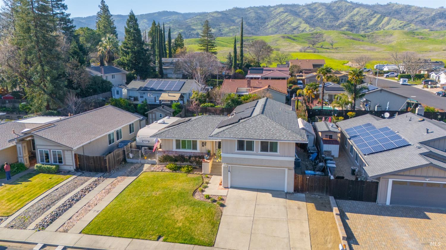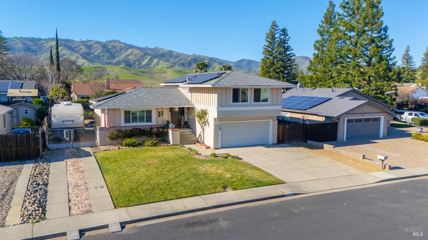 Welcome to this stunning home nestled in the highly desirable North Alamo area of Vacaville. This beautifully maintained residence offers 5 bedrooms and 3.5 bathrooms with over 2,344 square feet of thoughtfully designed living space. The main level features a full bedroom and bathroom, ideal for guests or multi-generational living. The spacious primary suite has been tastefully remodeled and showcases a custom walk-in closet with built-ins, shiplap accent wall, barn door, waterproof vinyl flooring in the closet and bathroom, and a new shower door for a modern touch. The kitchen is equipped with granite countertops, a new dishwasher, and luxury vinyl plank flooring that flows seamlessly through the kitchen and living room areas. Plantation shutters enhance the front-facing windows, while the newly remodeled entryway creates a welcoming first impression. Notable upgrades include owned solar, a sub-panel ready for generator connection, and a newer roof installed in 2017 and newly installed HVAC system. Parking is abundant with an attached two-car garage and additional RV parking along the side of the home. Situated on a generous 7,840 square foot lot, the backyard is tastefully landscaped and features an irrigation system throughout, perfect for outdoor enjoyment and entertaining. This home offers an exceptional combination of comfort, upgrades, and functionality in a sought-after neighborhood.