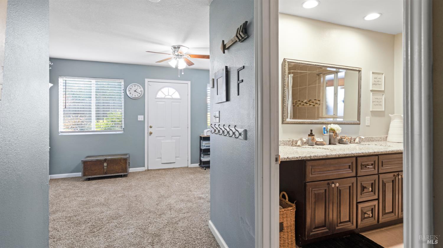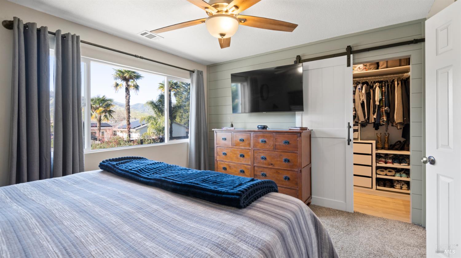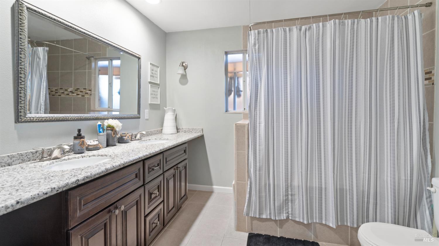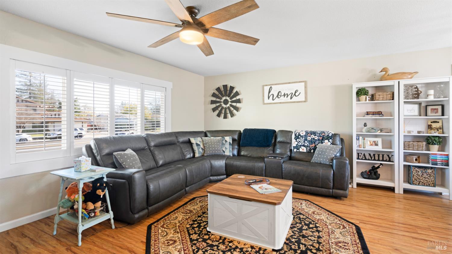 Welcome to this stunning home nestled in the highly desirable North Alamo area of Vacaville. This beautifully maintained residence offers 5 bedrooms and 3.5 bathrooms with over 2,344 square feet of thoughtfully designed living space. The main level features a full bedroom and bathroom, ideal for guests or multi-generational living. The spacious primary suite has been tastefully remodeled and showcases a custom walk-in closet with built-ins, shiplap accent wall, barn door, waterproof vinyl flooring in the closet and bathroom, and a new shower door for a modern touch. The kitchen is equipped with granite countertops, a new dishwasher, and luxury vinyl plank flooring that flows seamlessly through the kitchen and living room areas. Plantation shutters enhance the front-facing windows, while the newly remodeled entryway creates a welcoming first impression. Notable upgrades include owned solar, a sub-panel ready for generator connection, and a newer roof installed in 2017 and newly installed HVAC system. Parking is abundant with an attached two-car garage and additional RV parking along the side of the home. Situated on a generous 7,840 square foot lot, the backyard is tastefully landscaped and features an irrigation system throughout, perfect for outdoor enjoyment and entertaining. This home offers an exceptional combination of comfort, upgrades, and functionality in a sought-after neighborhood.