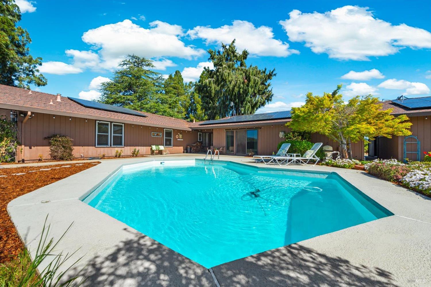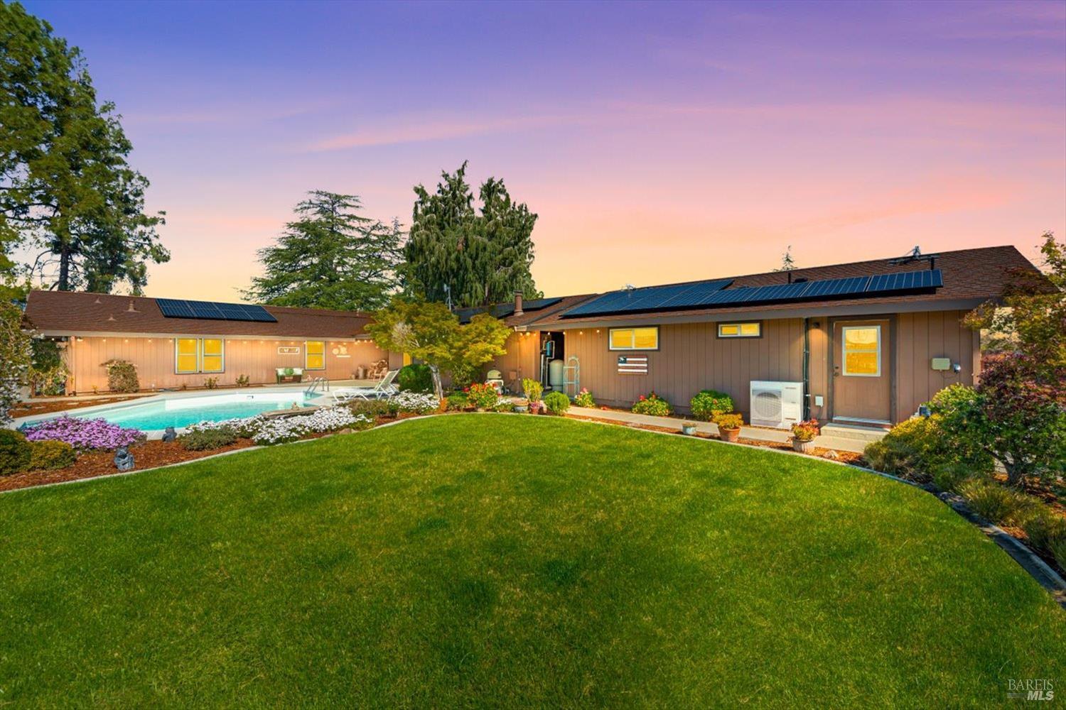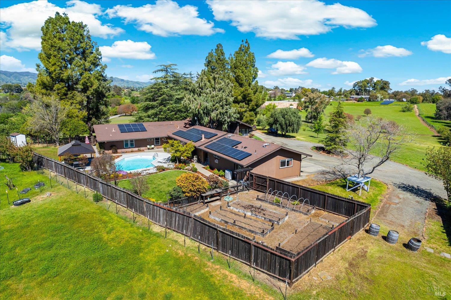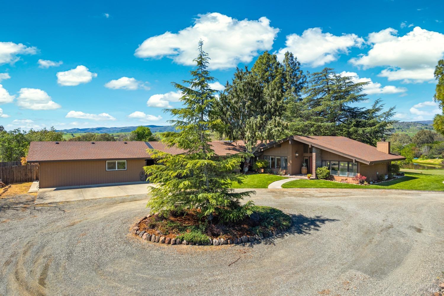 Welcome to this coveted Vacaville country estate nestled on 5 usable acres, offering the perfect blend of peaceful rural living and modern comfort with a spacious custom single-story home, a newly developed 720 sq. ft. ADU, a sparkling in-ground pool, owned solar, well water, RV parking and garage with workshop. Private tree-lined driveway leads to breathtaking panoramic views of rolling hills, surrounding a circular driveway that sets the tone for this incredible property. Inside, the main home features newly installed luxury vinyl plank flooring and carpet in the bedrooms, fresh interior paint, exposed wood beam vaulted ceilings, a stone fireplace and large windows that flood the home with natural light and views. Kitchen has an island with cooktop, double ovens, granite counters backsplash, pantry cabinets and large breakfast dining area with views. Massive bonus room is ideal for entertaining with a fireplace and sliding glass doors leading to the backyard retreat. Spacious primary suite has outdoor access, a walk-in closet and huge shower, while all additional large bedrooms provide crown molding and one with an ensuite bathroom. The ADU has a full kitchen, large living area, bedroom and full bathroom ideal for guests, extended family or rental potential. Home has newer dual-pane windows, recessed lighting, 2024 pergola, lawn and huge fenced garden area and endless views from every angle, making this a rare and versatile property.