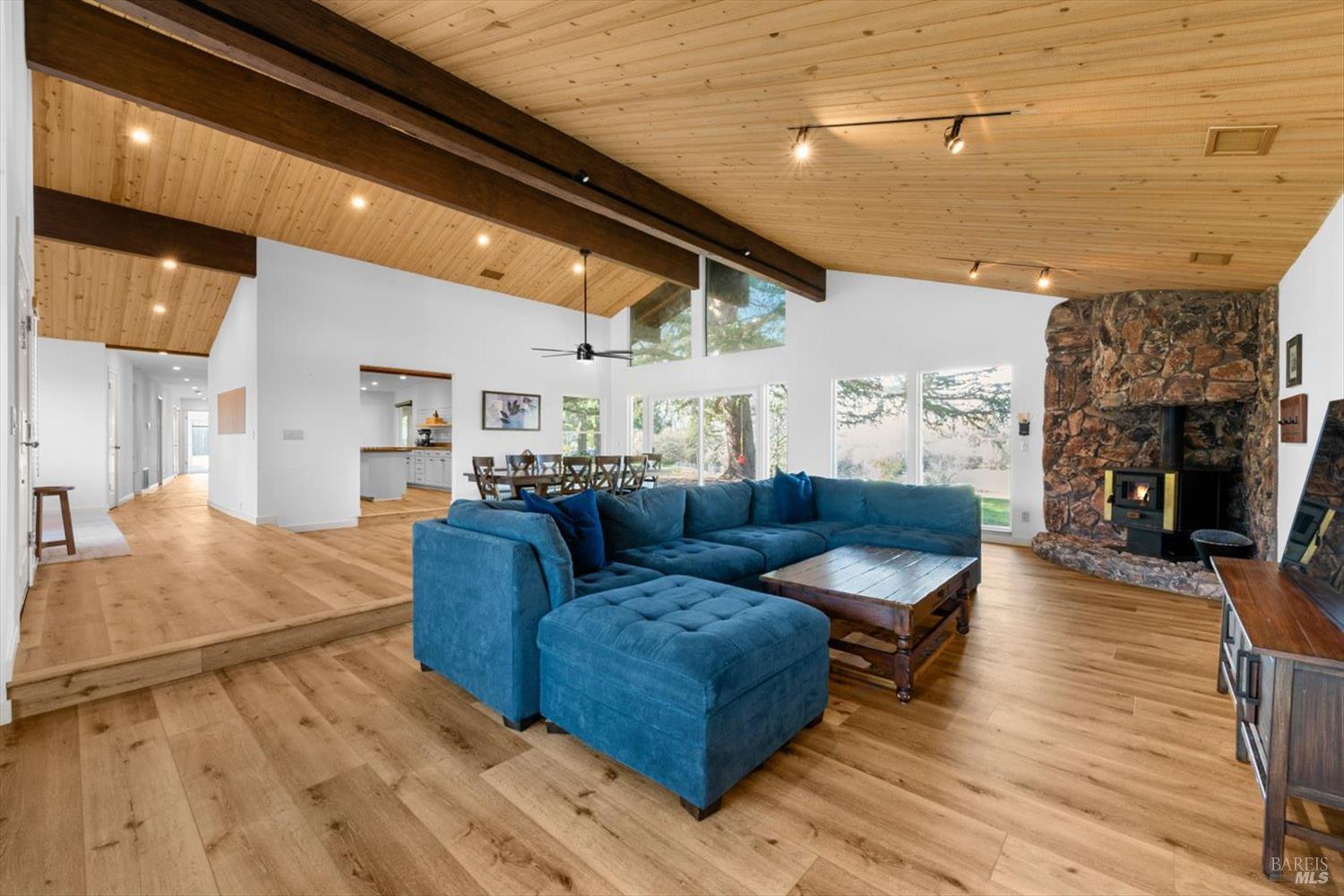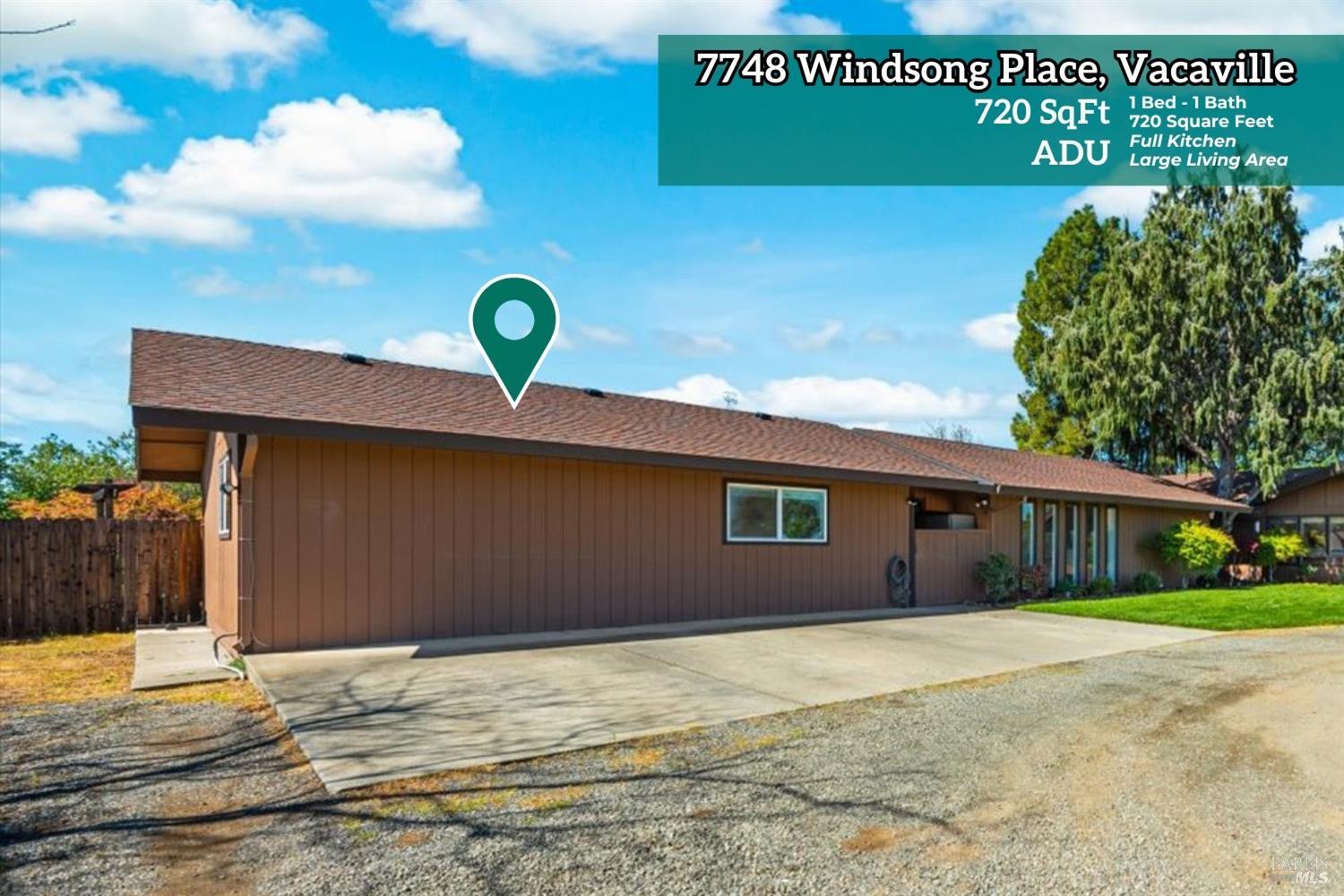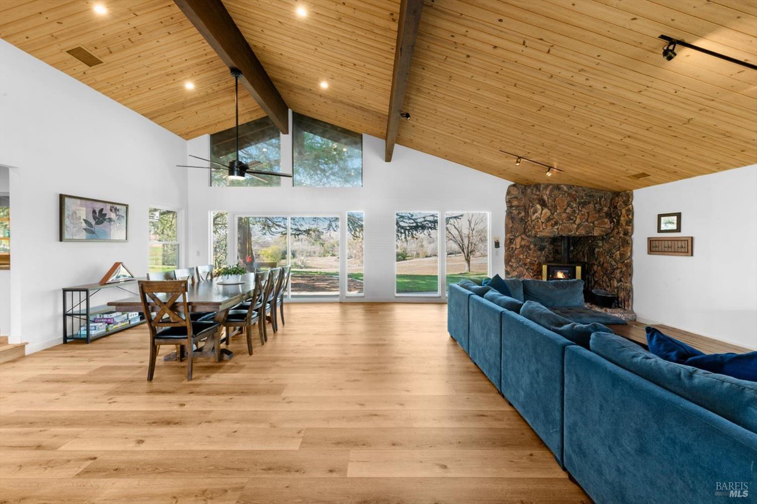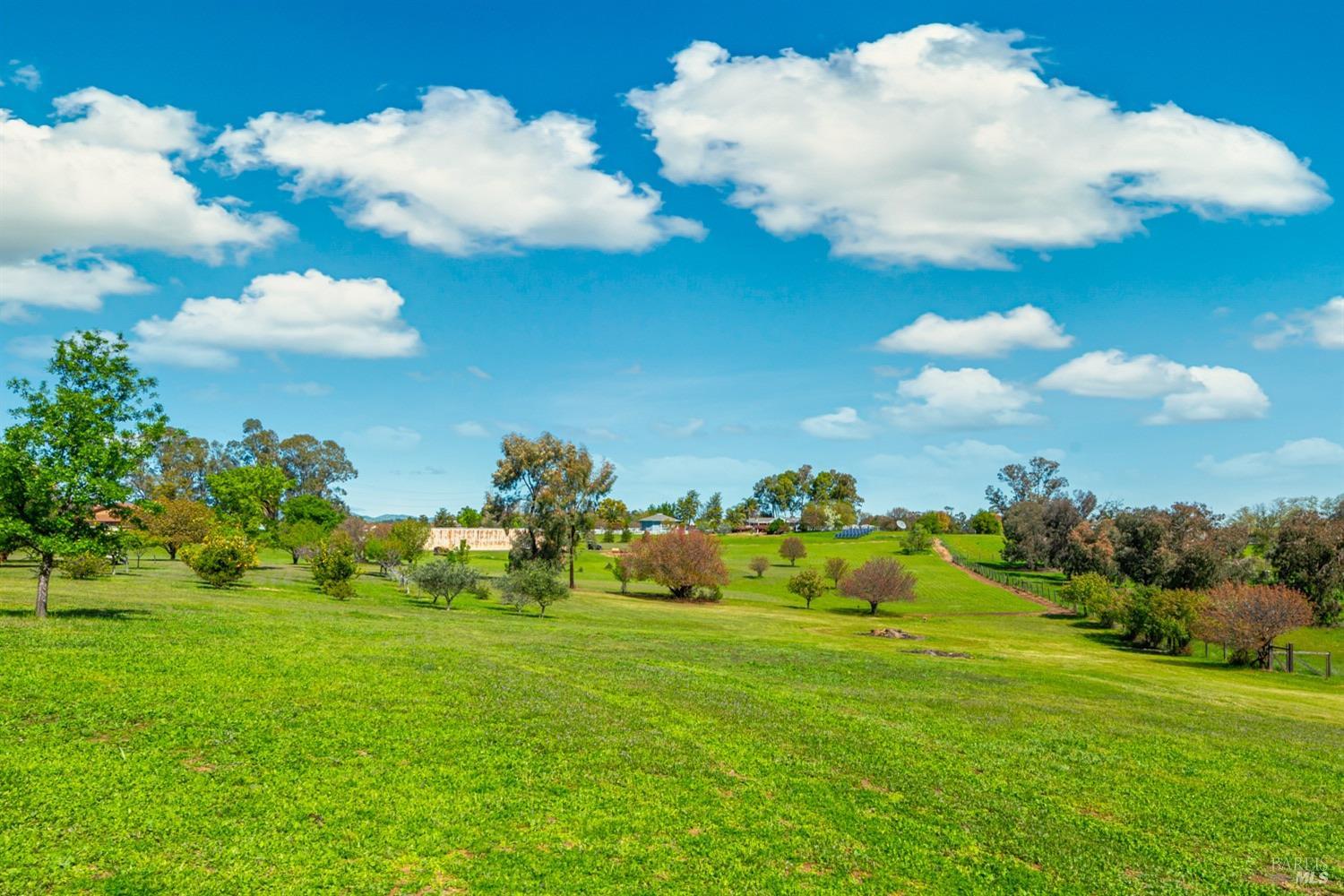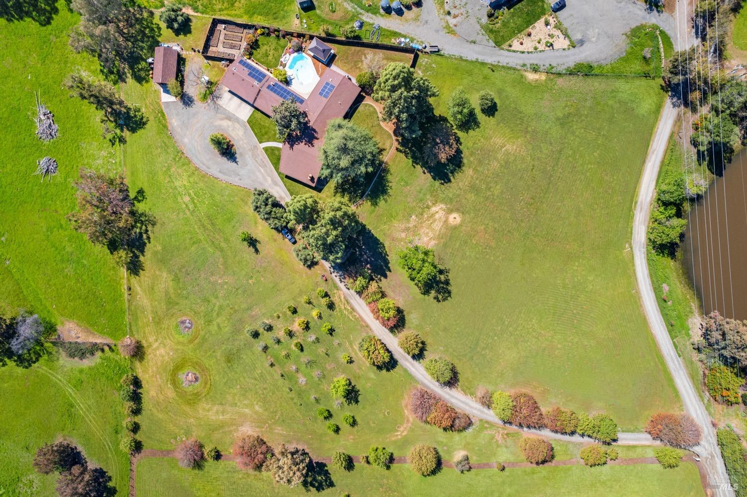 Welcome to this coveted Vacaville country estate nestled on 5 usable acres, offering the perfect blend of peaceful rural living and modern comfort with a spacious custom single-story home, a newly developed 720 sq. ft. ADU, a sparkling in-ground pool, owned solar, well water, RV parking and garage with workshop. Private tree-lined driveway leads to breathtaking panoramic views of rolling hills, surrounding a circular driveway that sets the tone for this incredible property. Inside, the main home features newly installed luxury vinyl plank flooring and carpet in the bedrooms, fresh interior paint, exposed wood beam vaulted ceilings, a stone fireplace and large windows that flood the home with natural light and views. Kitchen has an island with cooktop, double ovens, granite counters backsplash, pantry cabinets and large breakfast dining area with views. Massive bonus room is ideal for entertaining with a fireplace and sliding glass doors leading to the backyard retreat. Spacious primary suite has outdoor access, a walk-in closet and huge shower, while all additional large bedrooms provide crown molding and one with an ensuite bathroom. The ADU has a full kitchen, large living area, bedroom and full bathroom ideal for guests, extended family or rental potential. Home has newer dual-pane windows, recessed lighting, 2024 pergola, lawn and huge fenced garden area and endless views from every angle, making this a rare and versatile property.