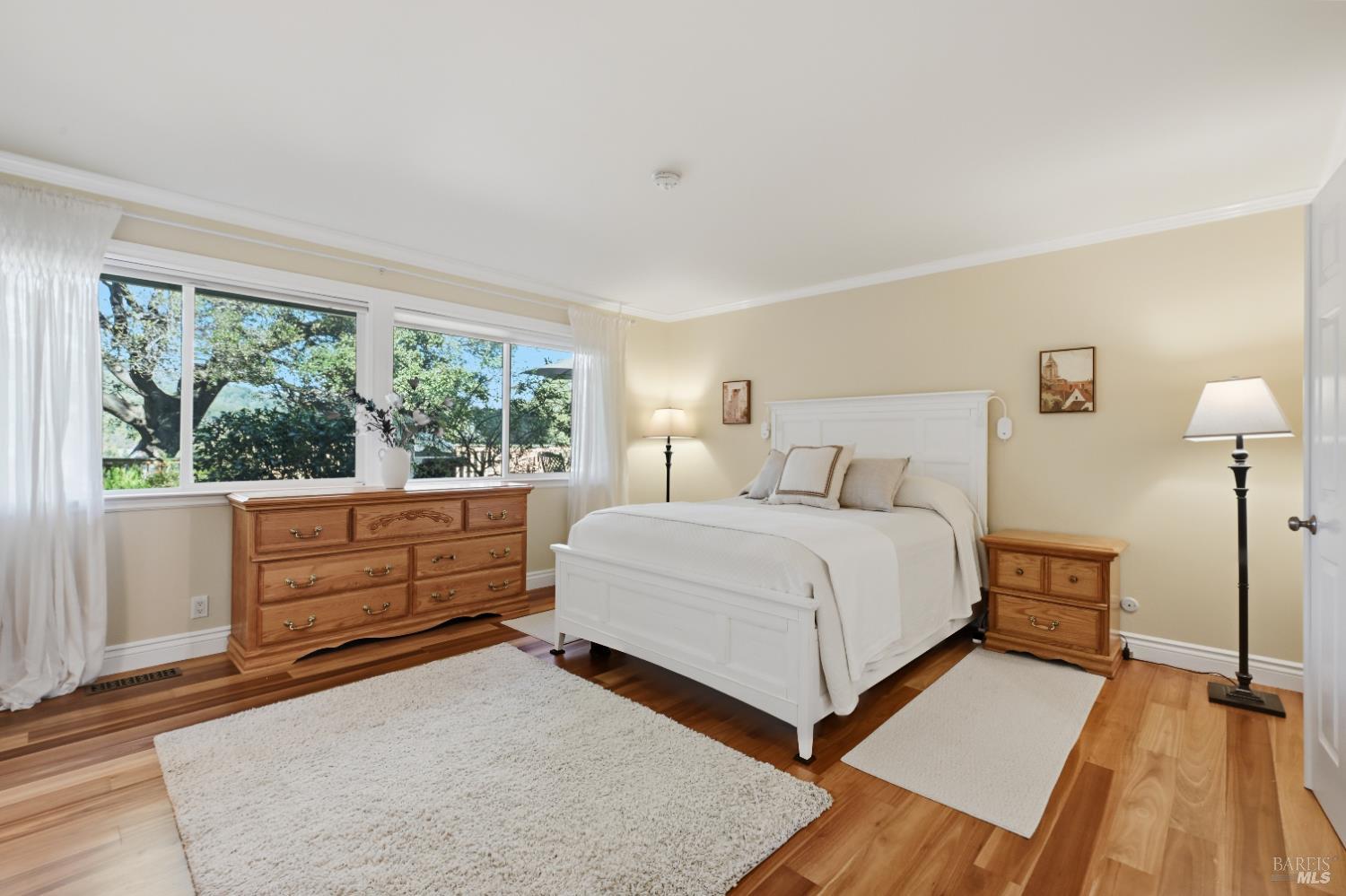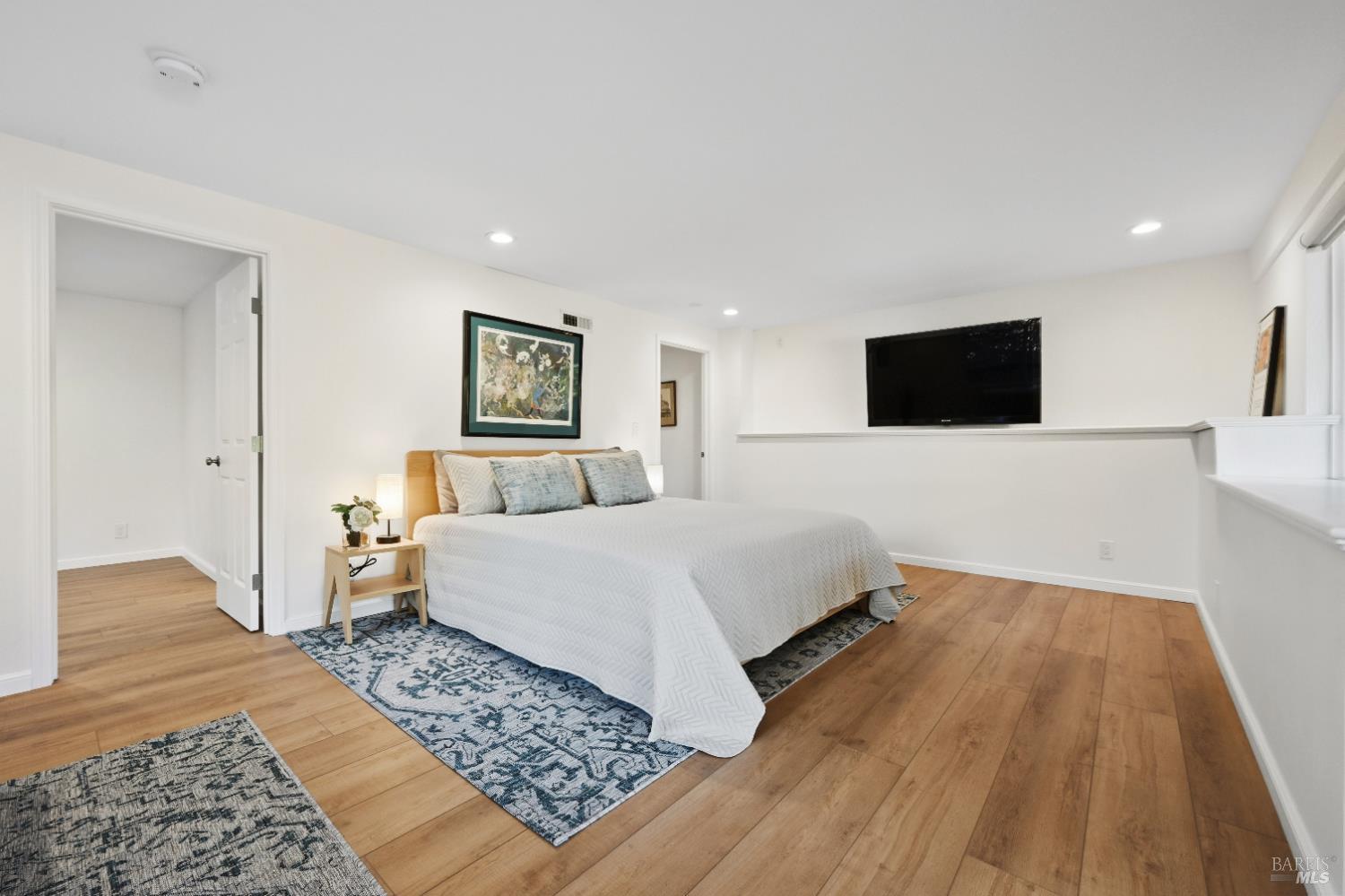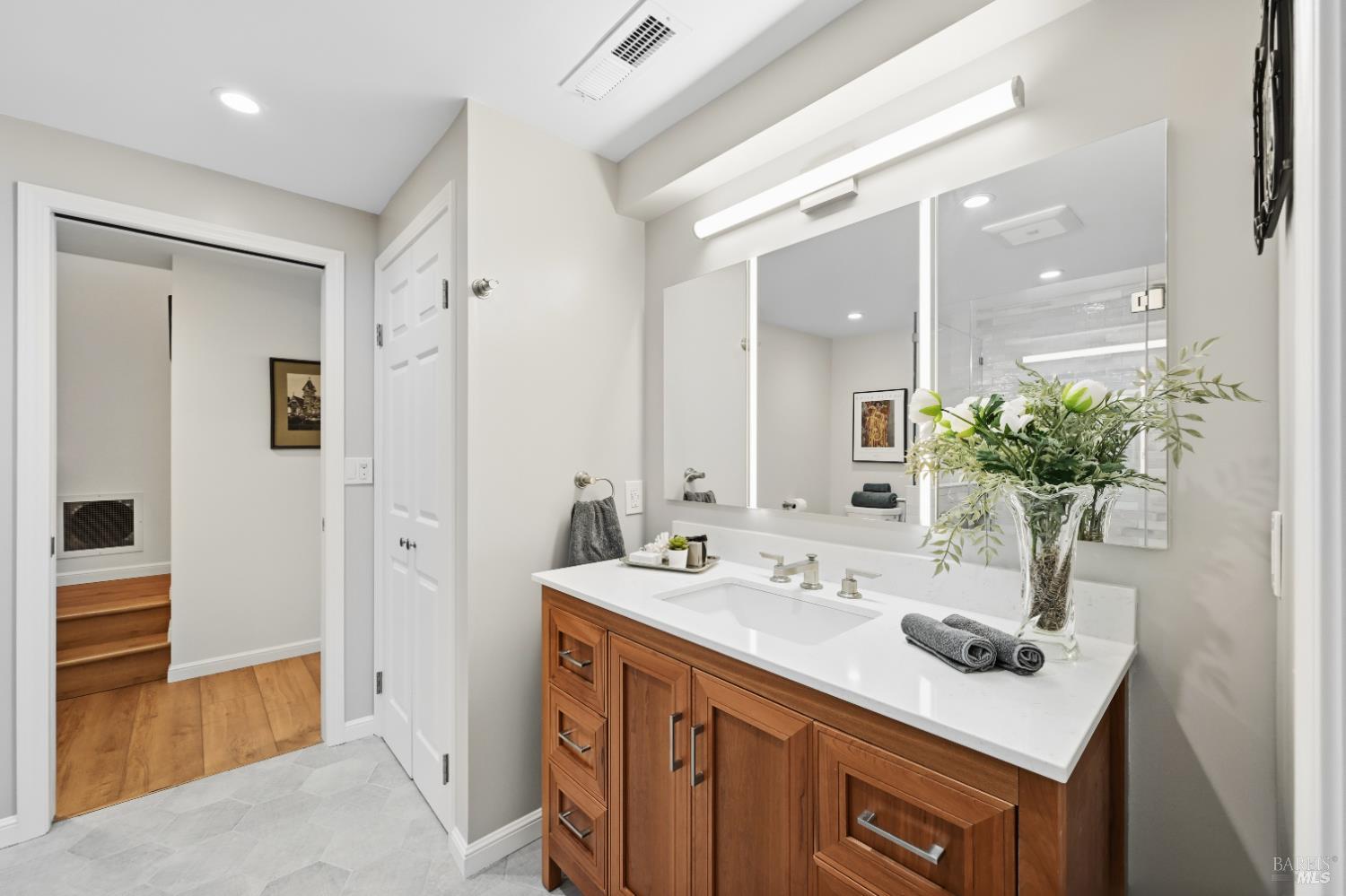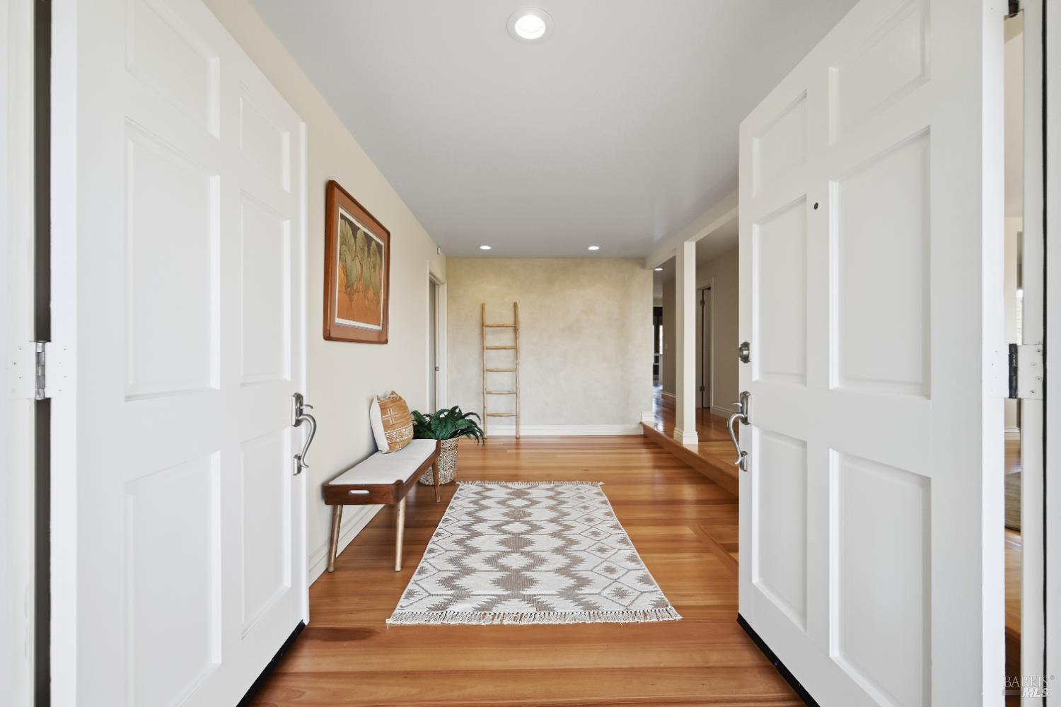 Welcome to 46 McNear Drive, set on over a quarter-acre lot in the sought-after Peacock Gap neighborhood of Marin County with stunning views of the San Francisco Bay, Richmond Bridge, Mt. Diablo, and the lush fairways of Peacock Gap Golf Course. Meticulously cared for and extensively renovated, this premier property is a rare find with newer roof, owned solar with backup batteries, new furnace/AC and impeccable upgrades throughout. Pride of ownership is showcased at every turn, for a truly move-in ready home in a prime Marin location. Nearly 3,000 square feet of sun-drenched living space unfolds with wood floors and floor-to-ceiling windows showcasing the property's bay and mountain views. The main level lives like a single-story home, featuring spacious family, living, and dining rooms, plus an updated chef's kitchen with gas range and view windows. On a separate wing of the home are four bedrooms including a serene primary suite and spa-like ensuite with soaker tub, oversized walk-in rainfall shower, dual vanity, and heated floors. Downstairs the lower level offers private, renovated living quarters with ensuite bath, walk-in closet, and separate yard entranceideal for guests, in-laws, or ADU potential. A wrap-around deck opens to the idyllic backyard for a nature lover's dream outdoor retreat with stone patio, level lawn, majestic heritage oak tree, garden beds, and ample space to entertain. A large 2-car garage completes this standout property. Enjoy privacy on a quiet street yet just minutes to waterfront paths, Peacock Park, Loch Lomond Marina, China Camp, McNear Beach, Andy's Market, and endless outdoor recreation. Properties of this caliber, condition, and setting rarely come to market, an extraordinary Peacock Gap offering not to be missed.