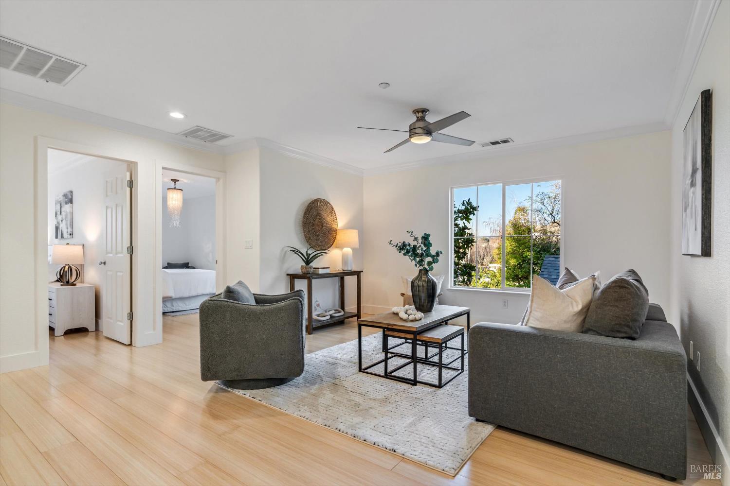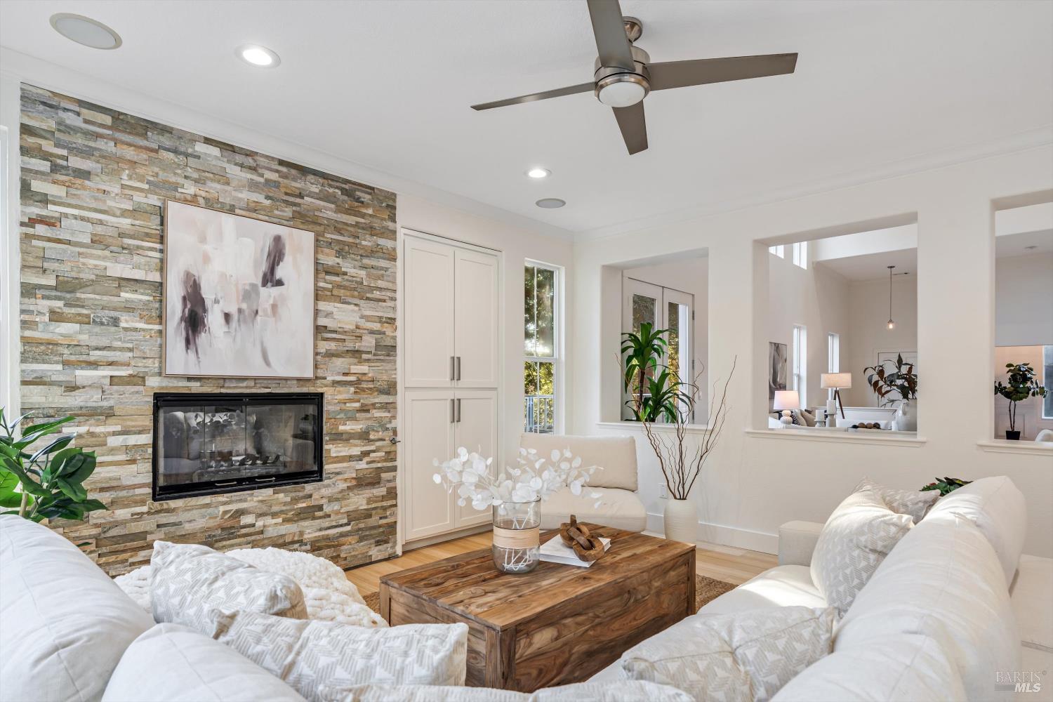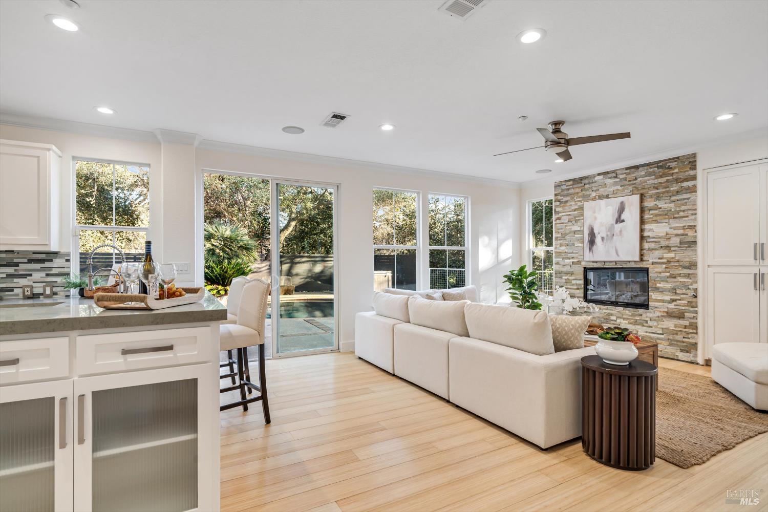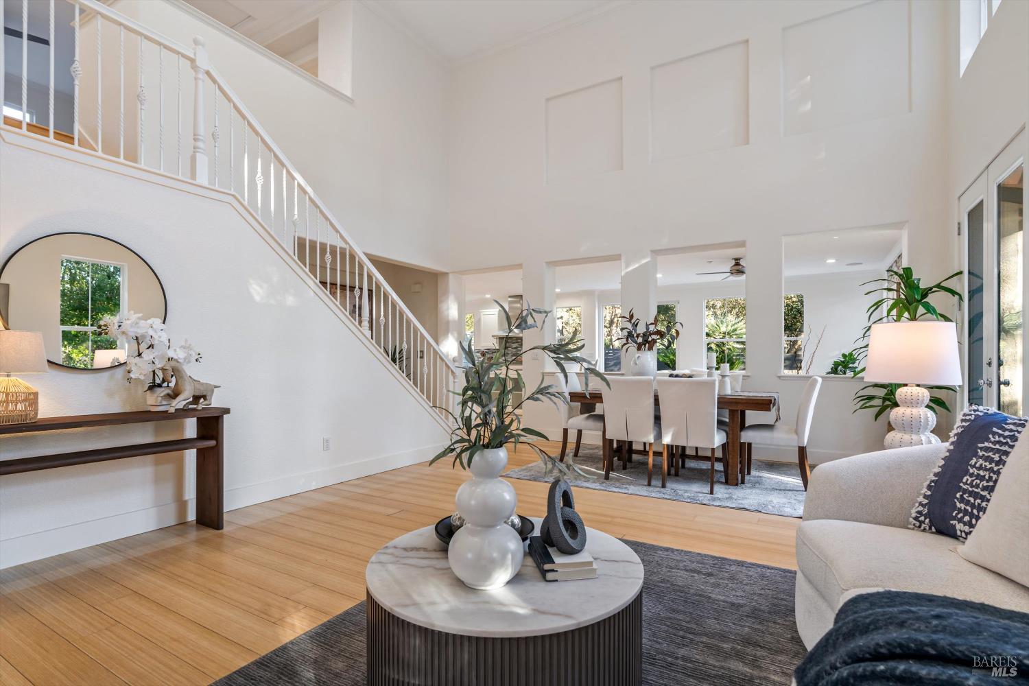 An inviting Napa sanctuary, this luminous retreat offers a rare blend of privacy, natural beauty, and effortless luxury, quietly tucked at the end of a peaceful cul-de-sac on nearly half an acre. Surrounded by mature trees and an extraordinary amount of usable outdoor space, the property feels immersed in nature while remaining comfortably within the city. The expansive residence spans approximately 3,132 square feet with 3 bedrooms, 2.5 bathrooms, plus a versatile additional room ideal for a home office or 4th bedroom. A dramatic formal living room with soaring two-story ceilings creates a joyful sense of arrival, filled with natural light that makes the space feel open, uplifting, and welcoming.The kitchen and family room form the heart of the home, thoughtfully designed by professional chefs to support both relaxed daily living and memorable gatherings. A generous central island, perfect for hands on projects like ravioli production, invites connection and creativity, with ample room for shared cooking and conversation. The great room opens directly to the backyard with views of the pool, creating seamless indoor outdoor flow and an easy rhythm between home and garden. Upstairs, a secondary family room provides flexible living space, while the expansive primary suite offers a serene private retreat. Bathed in natural light, the suite features a spacious sitting area, oversized walk-in closet, and a luxurious en-suite bath, an ideal place to unwind and recharge. Outdoors, the property unfolds like a private garden oasis with multiple environments to enjoy. Lounge by the pool, gather on the patio, play on grassy lawns, or wander down to the tranquil creekside setting along Napa River Creek. Mature redwood trees frame a meadow like setting, a chicken coup, and natural spaces perfect for relaxing, reading, or simply enjoying the sights and sounds of nature. With space for recreation, RV or additional parking, and a three-car garage, this exceptional Napa property offers a rare opportunity to live surrounded by beauty, light, and nature. without sacrificing comfort or convenience.