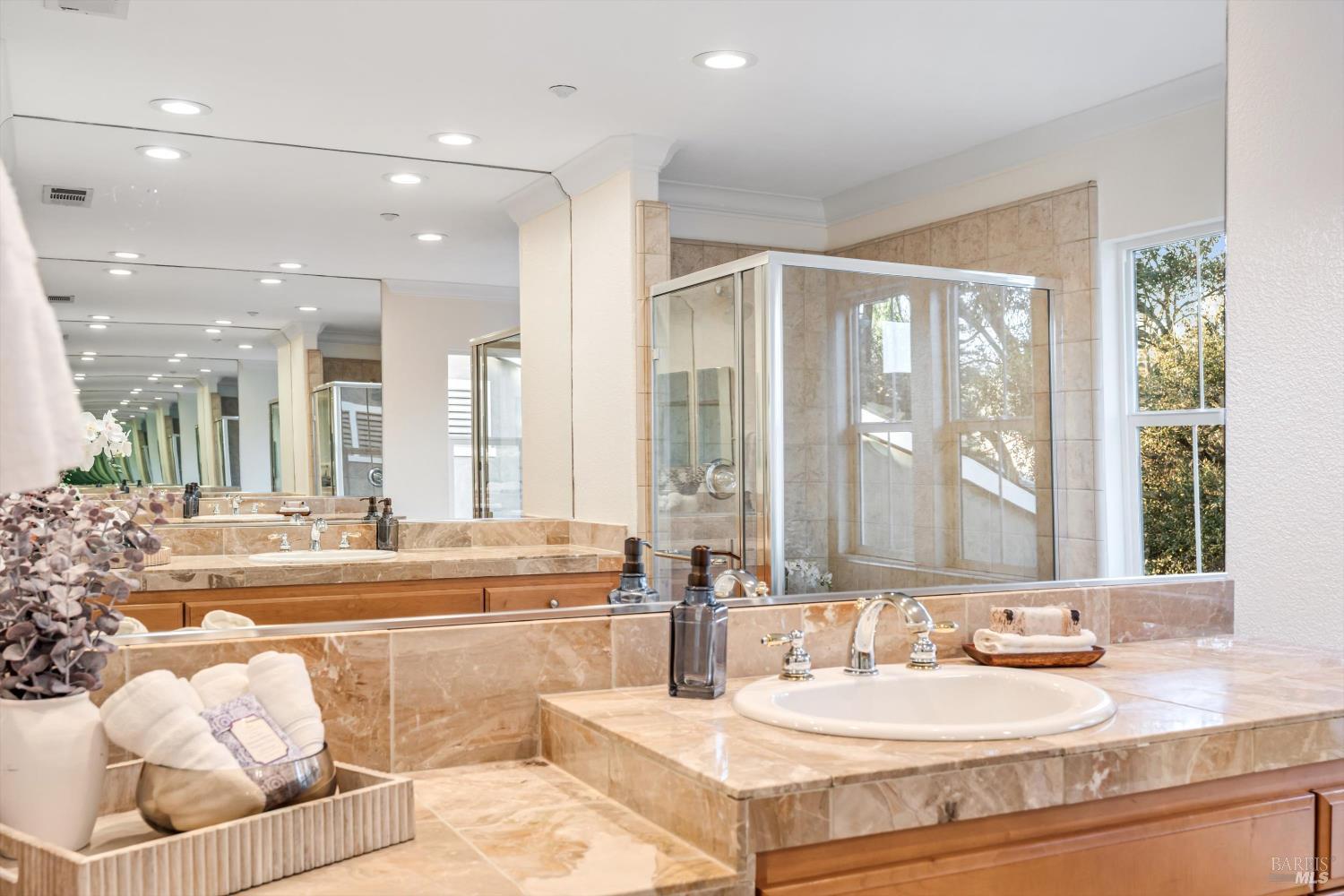 • Primary Bathroom Features Double Sinks,Shower Stall(s),Sunken Tub,Tile,Walk-In Closet