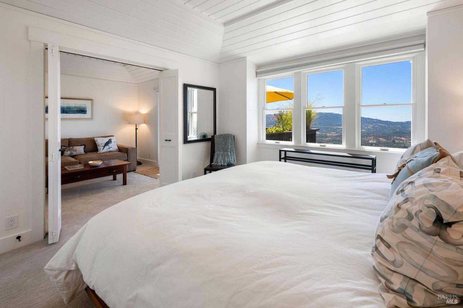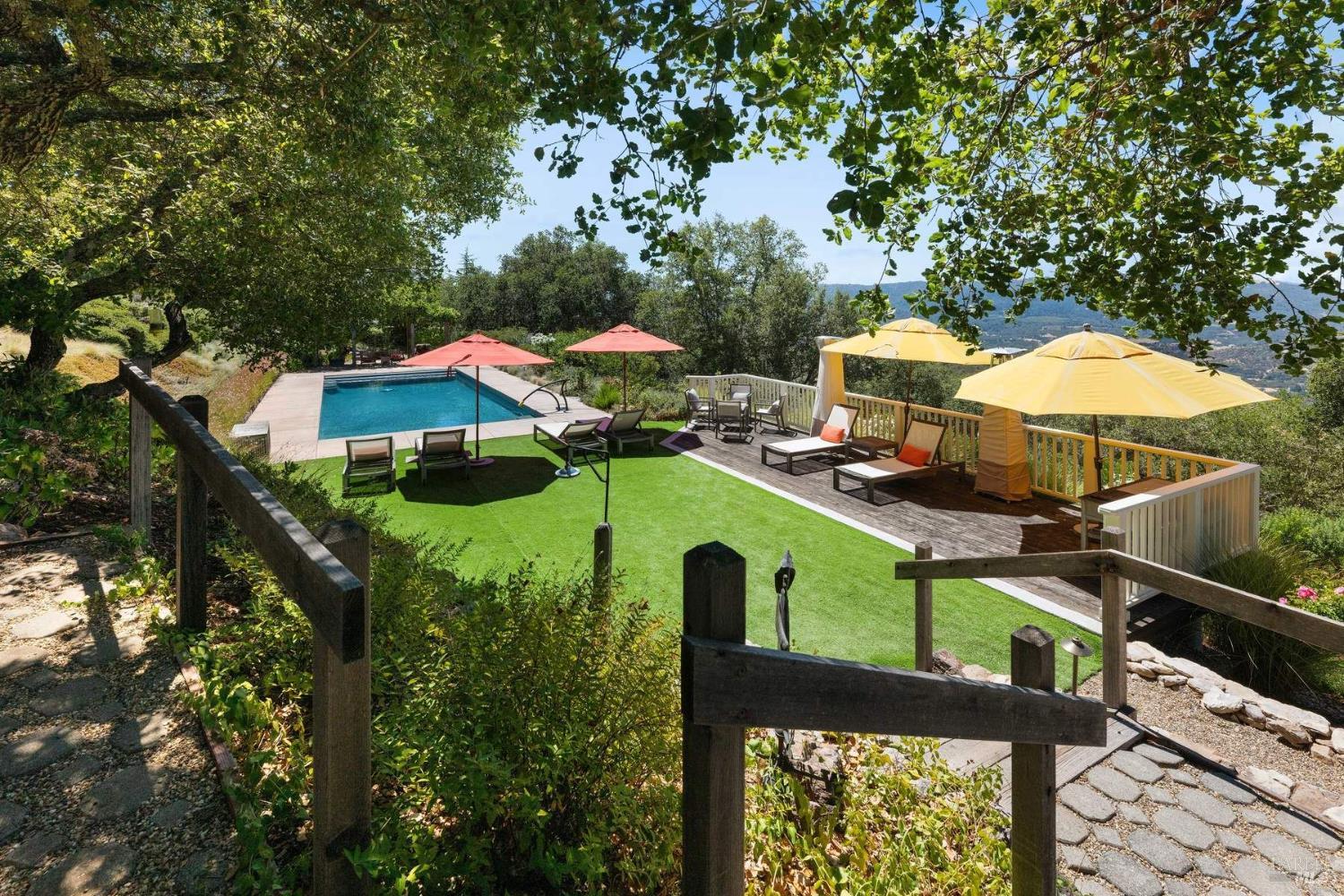 A rare opportunity to own one of Sonoma Valley's premier view estates this 6 acre Wine Country sanctuary is crowned with 1.5 acres of vines and mesmerizing panoramas stretching across rolling hills and endless sky. The beautifully remodeled main residence embraces its setting with seamless indoor-outdoor design and a great room wrapped in walls of glass that frame sweeping valley and sunset vistas. Anchored by a dramatic fireplace, the open concept flows effortlessly to expansive view decks, a dining area, and a chef's kitchen with large island, pantry, three ovens, two dishwashers, and a sunlit breakfast nook. Three spacious bedroom suites provide comfort and privacy, including an upper-level primary retreat with spa-like bath, walk-in closet, office, fireplace, and private deck ideal for morning coffee under the broad Sonoma sky. Secondary suites feature ensuite baths and serene garden outlooks. The versatile lower level includes a family/bunk room, wine cellar, bath, dual laundry stations, and direct access to a hot tub patio overlooking the valley. A charming second unit offers flexible guest or extended-stay accommodations with full kitchen, living room, bedroom, office, private yard, and a view deck. Resort-style amenities include a gated pool, bocce, horseshoes, play area, picnic sites, generator, high-speed internet, and private wellall just 10 minutes from downtown Glen Ellen and Kenwood's wineries, dining, and parks. Experience the essence of Wine Country living beneath skies that turn every sunset into your own private horizon.