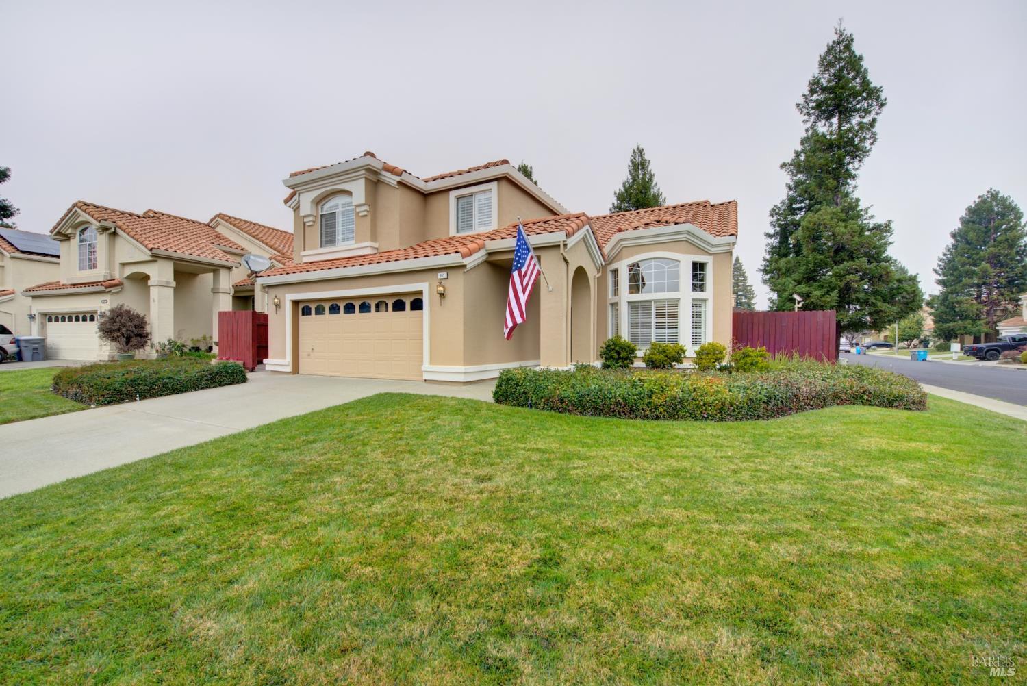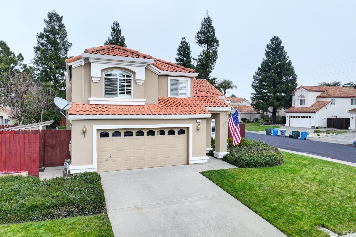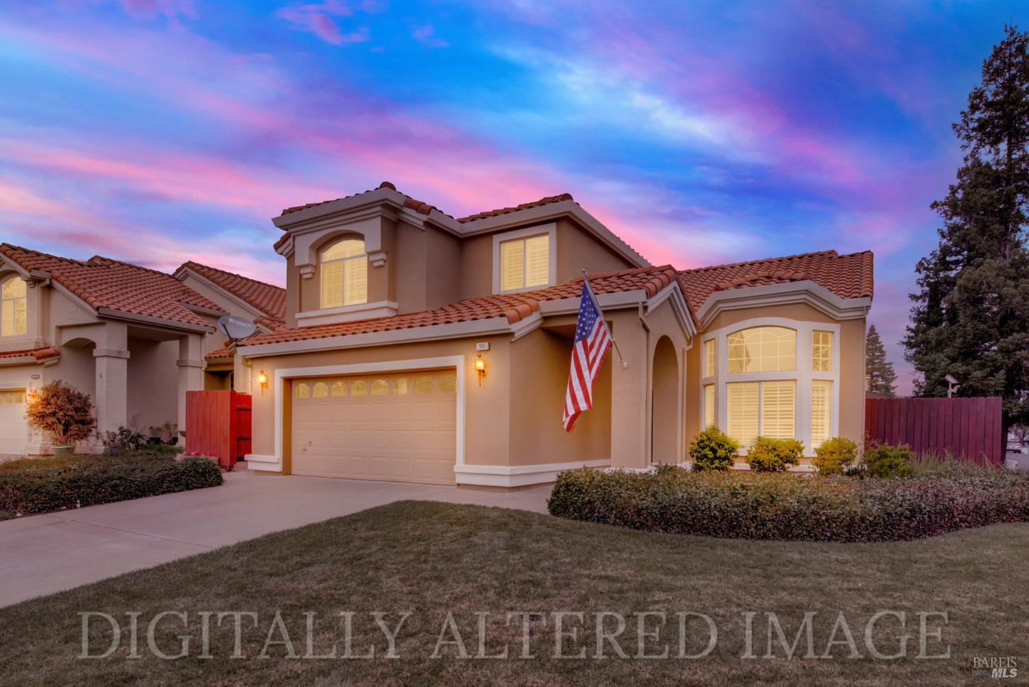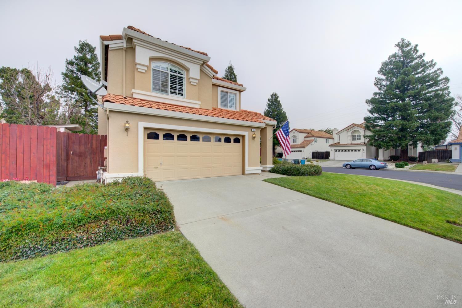 Beautiful, well-maintained home located in the highly desirable Browns Valley neighborhood of Vacaville. Freshly painted on the exterior and positioned on a manicured corner lot, this home offers outstanding curb appeal and pride of ownership throughout. Step inside to dramatic vaulted ceilings that create a warm, inviting, and prestigious atmosphere. There is a Formal dining area for hosting events. The kitchen features lovely quartz countertops, newer appliances, upgraded recessed lighting, and ample cabinetry, making it ideal for both everyday living and entertaining. A separate family room with high ceilings and a cozy fireplace provides another perfect gathering space. A convenient bedroom and full bathroom on the lower level offer flexibility for guests, multi-generational living, or a home office. The garage currently serves as a versatile bonus living space but can easily be converted back to a traditional garage if desired. Major system upgrades include a new HVAC system and a newer water heater. Custom shutters throughout the home add timeless style and functionality. Upstairs you'll find three additional bedrooms, including a spacious primary suite with a walk-in closet, dual sinks with new, classy faucets, a soaking tub, and a separate shower. The backyard is beautifully designed and ideal for entertaining, featuring a large gazebo, raised concrete footers for added privacy, sturdy double fencing, and a convenient side-yard shed. Additional highlights include a 30-amp RV plug and 240-volt electrical already in place for a spa, offering excellent functionality and future flexibility. Enjoy easy access to Centennial Park with exciting new expansion plans, along with nearby walking trails, schools, gym, and more. This is a truly special home! Come see it today!