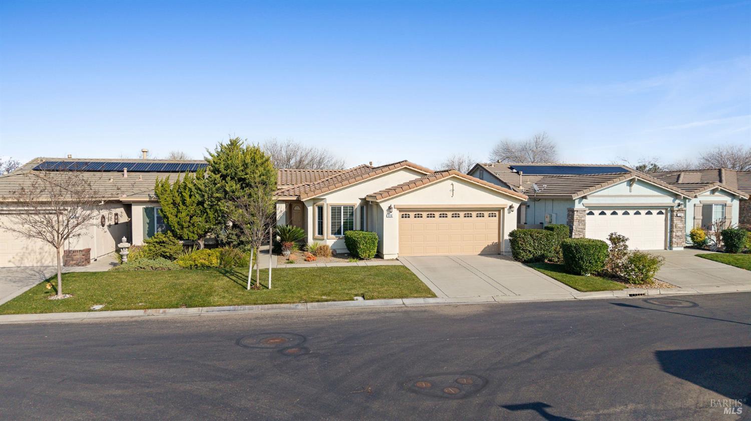 Nicely appointed Big Sur model home now available in Trilogy at Rio Vista. This home has 2 bedrooms, 2 baths and a den. Beautiful laminate floors with a tile entry and carpet in the bedrooms. Kitchen features tile countertops and oak cabinets. Newer appliances include the refrigerator, gas stovetop and oven and microwave. Look out the kitchen window to a lovely backyard. The covered patio just off the dining area provides a great space to relax and entertain with no rear neighbors. Pull down shades on the back patio to provide additional privacy making the space an outdoor area you can enjoy year around. Inside highlights include a spacious family room, den with double doors that provide privacy, upgraded light fixtures and ceiling fans and laundry room with black stainless front load washer and dryer. This home has solar with a pre-paid lease until 2036. Water heater is electric and there is an EV charger in the garage. Larger primary bedroom with a bay window and en suite bath with dual vanity sinks, soaking tub, walk-in closet and lots of storage. Enjoy all that Trilogy, a 55+ Active Adult community has to offer, including numerous clubs, 2 pools, Bocce and Tennis/Pickleball courts, new Health and Wellness center offering cardio machines, weight room, exercise classes and spa services.
