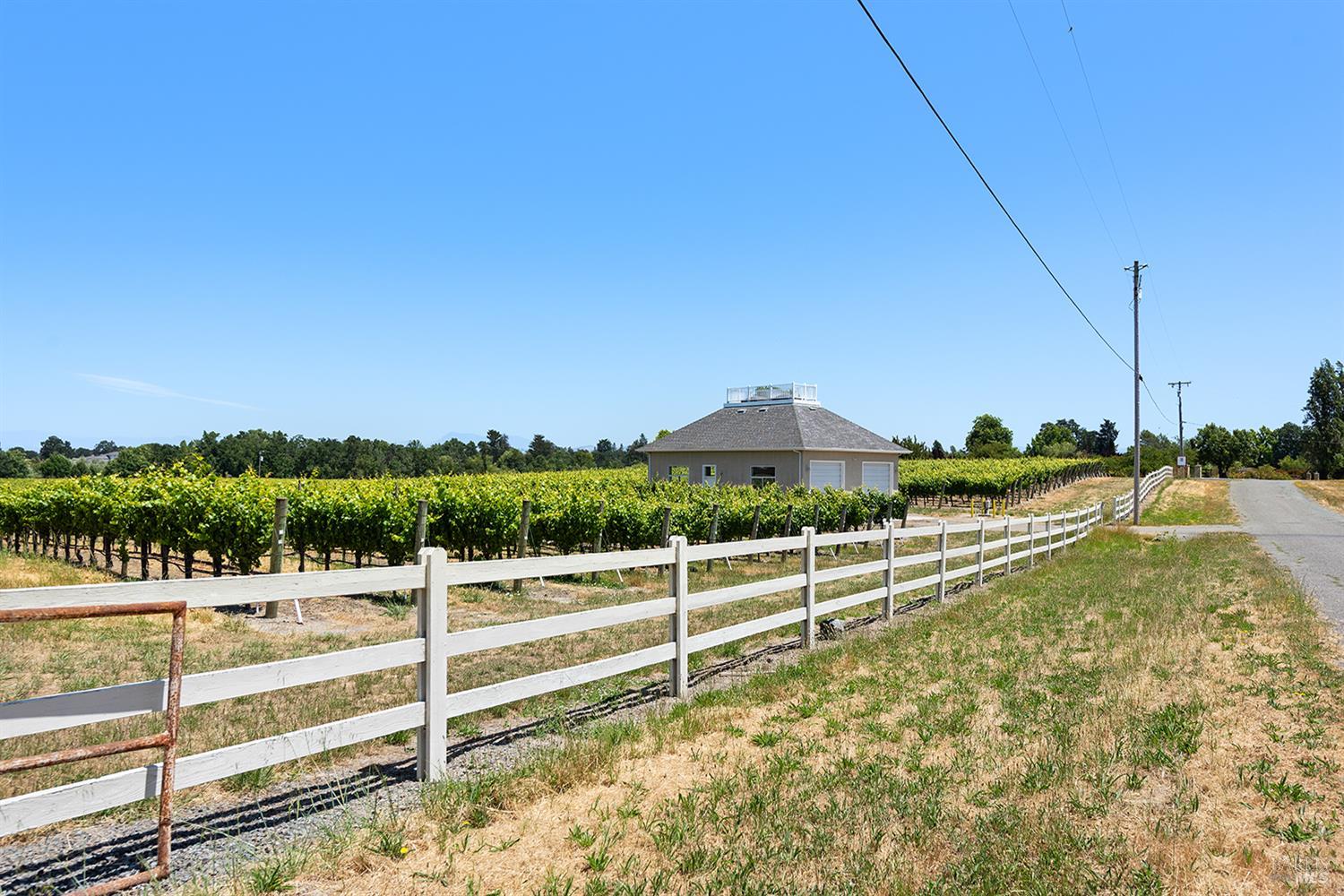 Experience rare natural beauty and complete peace and serenity on this pristine pride of ownership 9.6+/- acre parcel, graced with 8.6+/- acres of Russian River Valley premier pinot and chardonnay grape vines. A finished attractive newer barn/outbuilding with a slab floor, electricity and roll up doors lends itself to a boutique wine making operation or perhaps one would possibly desire to turn it into an ADU. The building site is nothing other than stunning with breathtaking distant views of forested ridges, hills and the mountains beyond. Two high producing wells, one irrigation and one domestic, make the possibilities here endless! Located just minutes from all the conveniences in Sebastopol and Santa Rosa, this parcel located near the end of a dead-end paved country lane will delight your senses in every way. Own a piece of paradise in the renowned Russian River Valley and Sonoma Coast Wine Appellations.