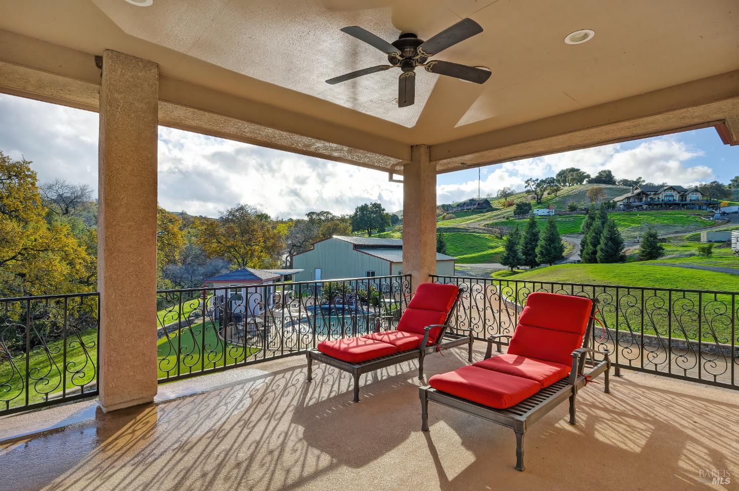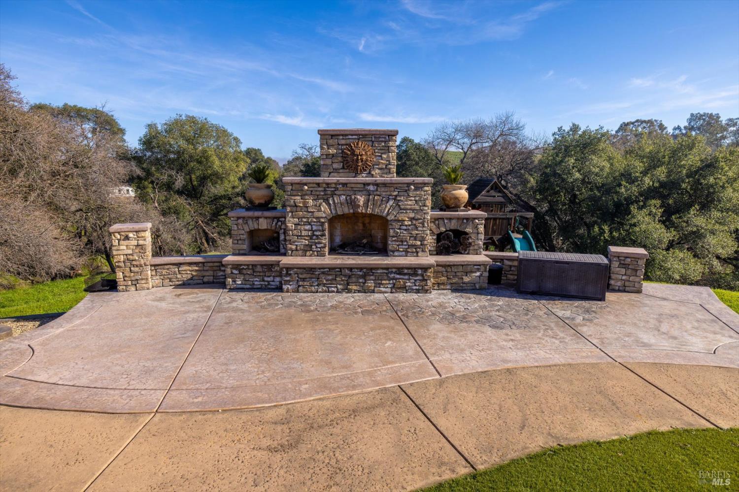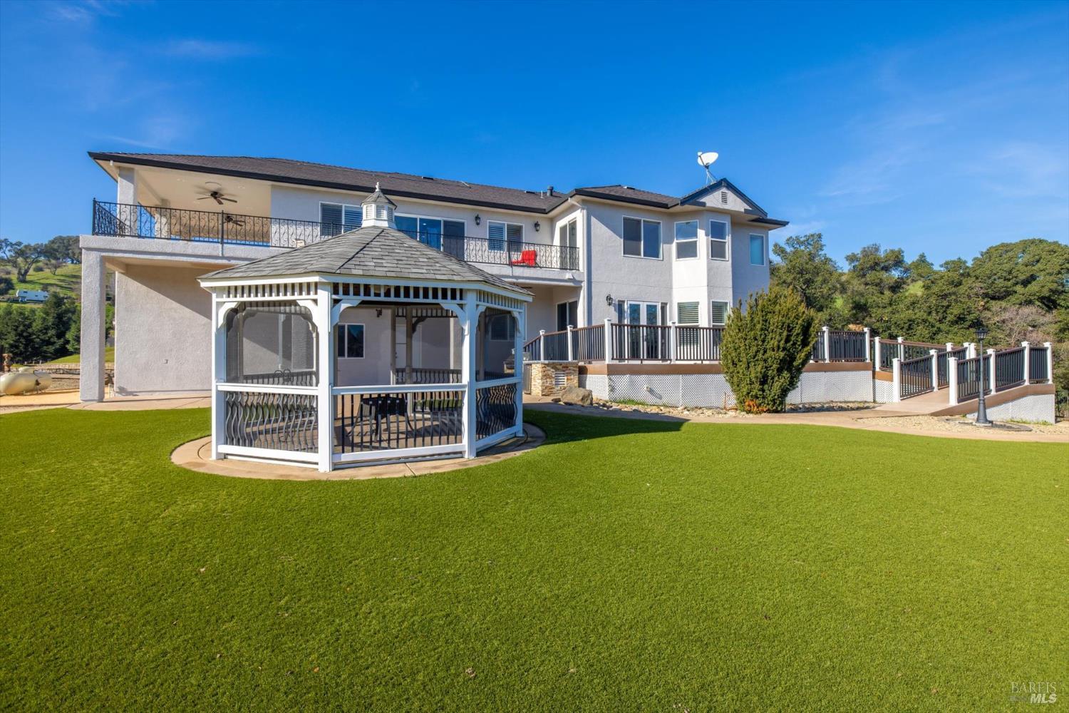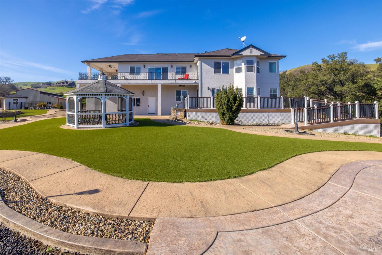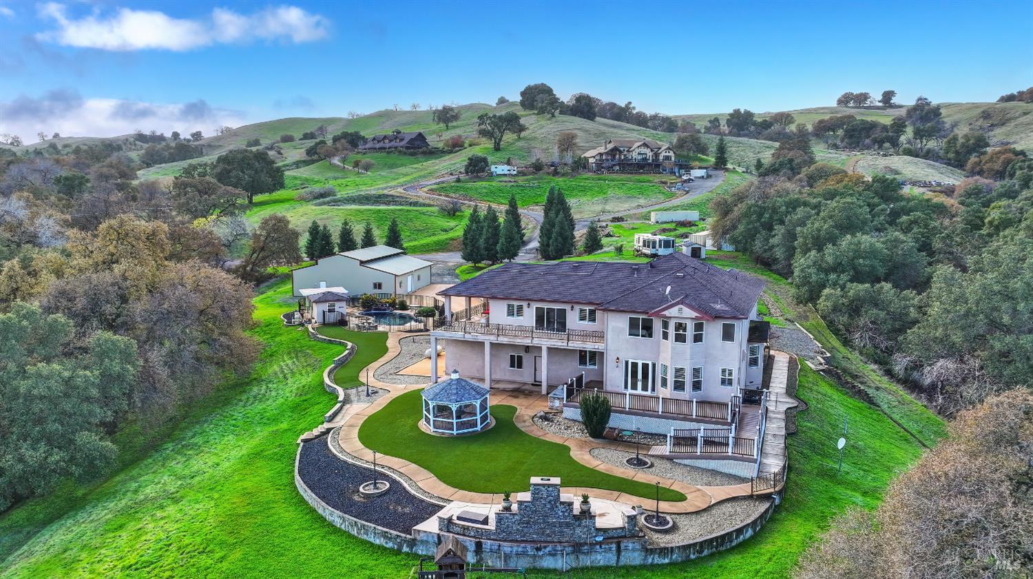 Located just 10 minutes from downtown Vacaville, this dream estate sits on a quiet cul-de-sac among multimillion-dollar ranch properties and enjoys a majestic natural setting, abutting a seasonal creek on two sides for exceptional privacy and and views. 5 usable acres with full access for animals and play areas with a prime site for a future ADU (zoned for up to approximately 1,500 sq ft). The inviting Mediterranean-style residence features a grand foyer with an approx. 24 ft ceiling, wraparound verandas perfect to enjoy the views, five bedrooms plus a stately main-level office, and a generous family room upstairs for media, homework, or game room uses. The remodeled chef's kitchen showcases high-end finishes and appliances, open to a warm great-room environment anchored by one of two gas fireplaces. With four full bathrooms, including a convenient downstairs bedroom and full bath, the floorplan supports multi-generational living and flexible lifestyle needs. Resort-style outdoor living includes a PebbleTec pool with waterfall, multiple outdoor kitchen/bar areas, a striking outdoor fireplace, and an RV parking pad with full hookups. The three car oversized garage and approximately 40' x 60' metal shop is a hobbyist's or contractor's dream, providing substantial room for vehicles, tools, and projects. Owned solar, room for animal pens, garden beds, and future amenities completes this rare, fully usable country property close to town.