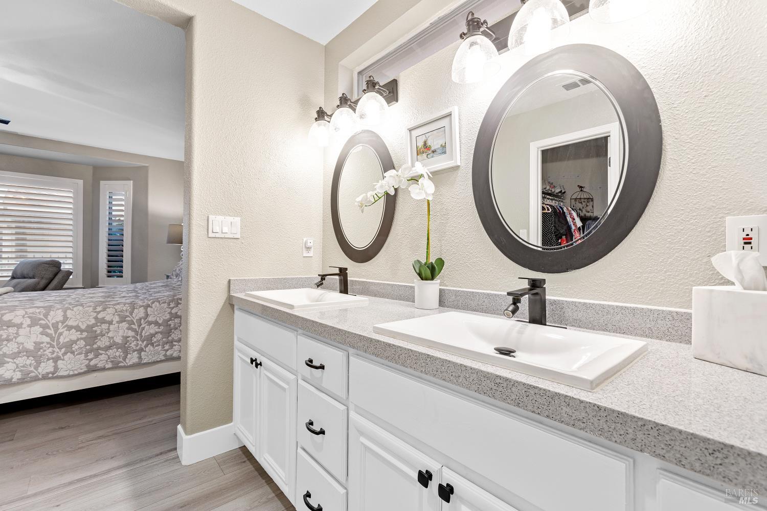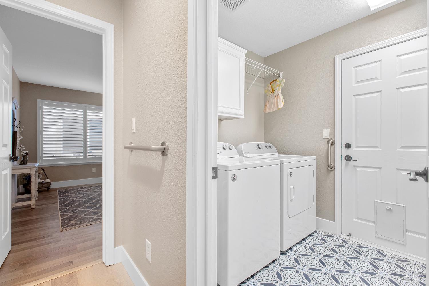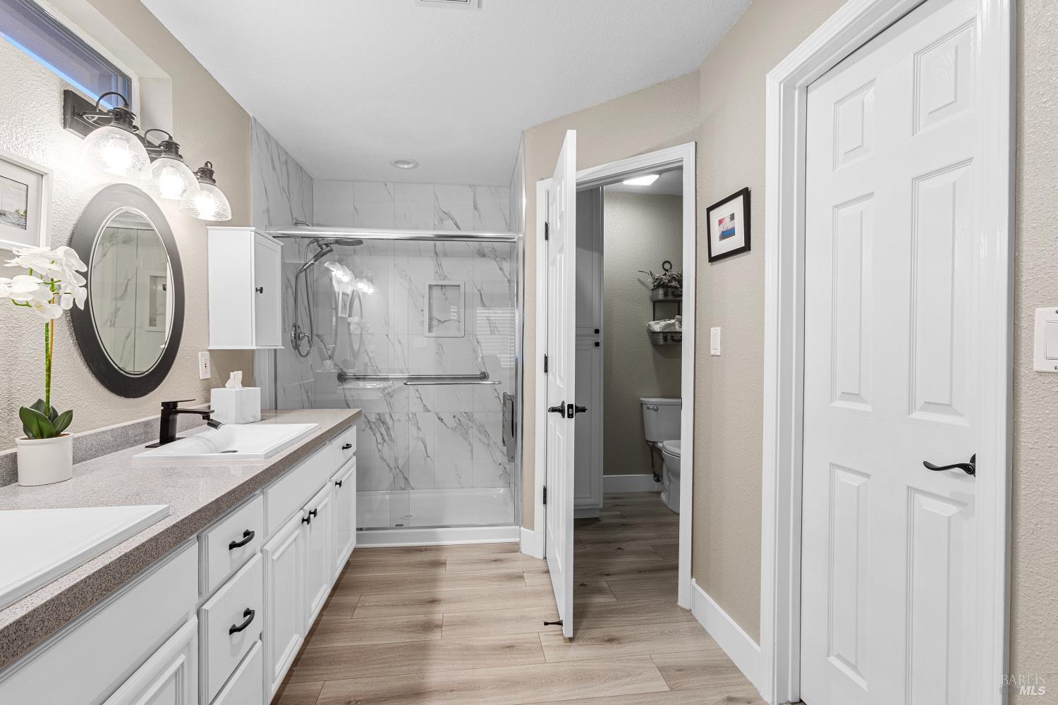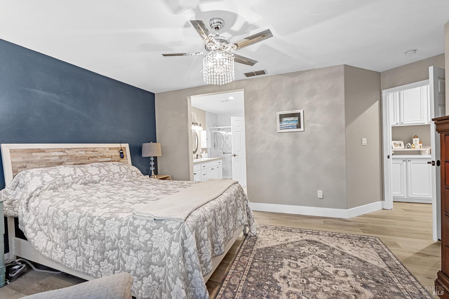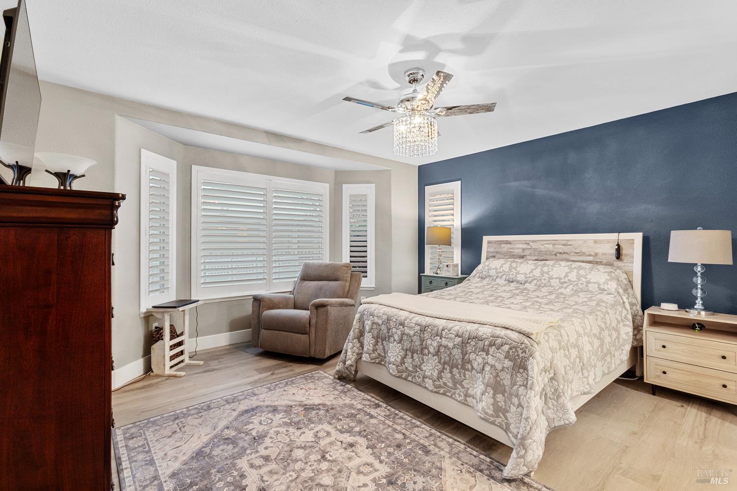 Beautifully appointed Big Sur style home totally redone with updated kitchen, main bath and flooring throughout. Plantation shutters plus a decorative barn door at the den/office. Landscaped front and back yards with extra flat work in front and fully fenced back yard with covered patio. Leased Solar.