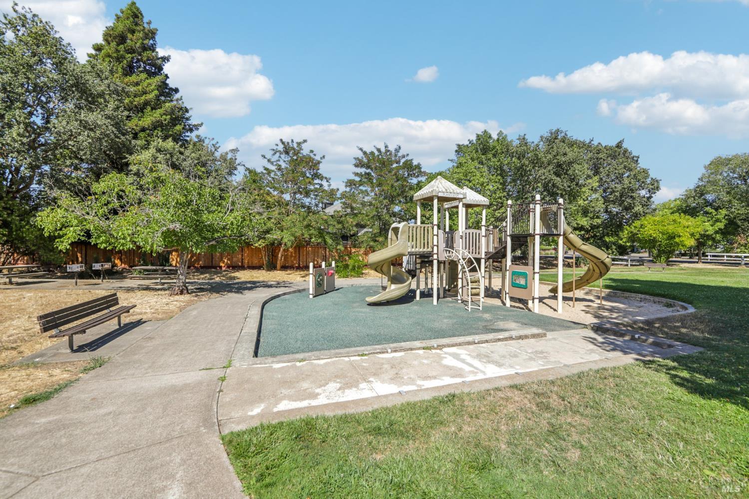 Lovely single level condo with a Mediterranean flair! Well-placed skylights throughout provide so much natural light. The bright open kitchen has plenty of counter and storage space, oversized Subzero refrigerator/freezer, gas cooktop, garden window, side patio access and more. The living room with high ceilings has a charming gas log fireplace and plenty of room to relax and spread out. The generous Primary ensuite has a large step-in shower, its own Cedar lined walk-in closet, plus high ceilings and comfortable outdoor access. The second bedroom could be very adaptable as both an office or guest bedroom with existing Murphy bed. Located across from the pool/spa area, backed right up to a park, plus only steps from the Fryer Creek Trail. If you want just a little bit more than standard, this private end unit with large back yard plus side patio is not to be missed.