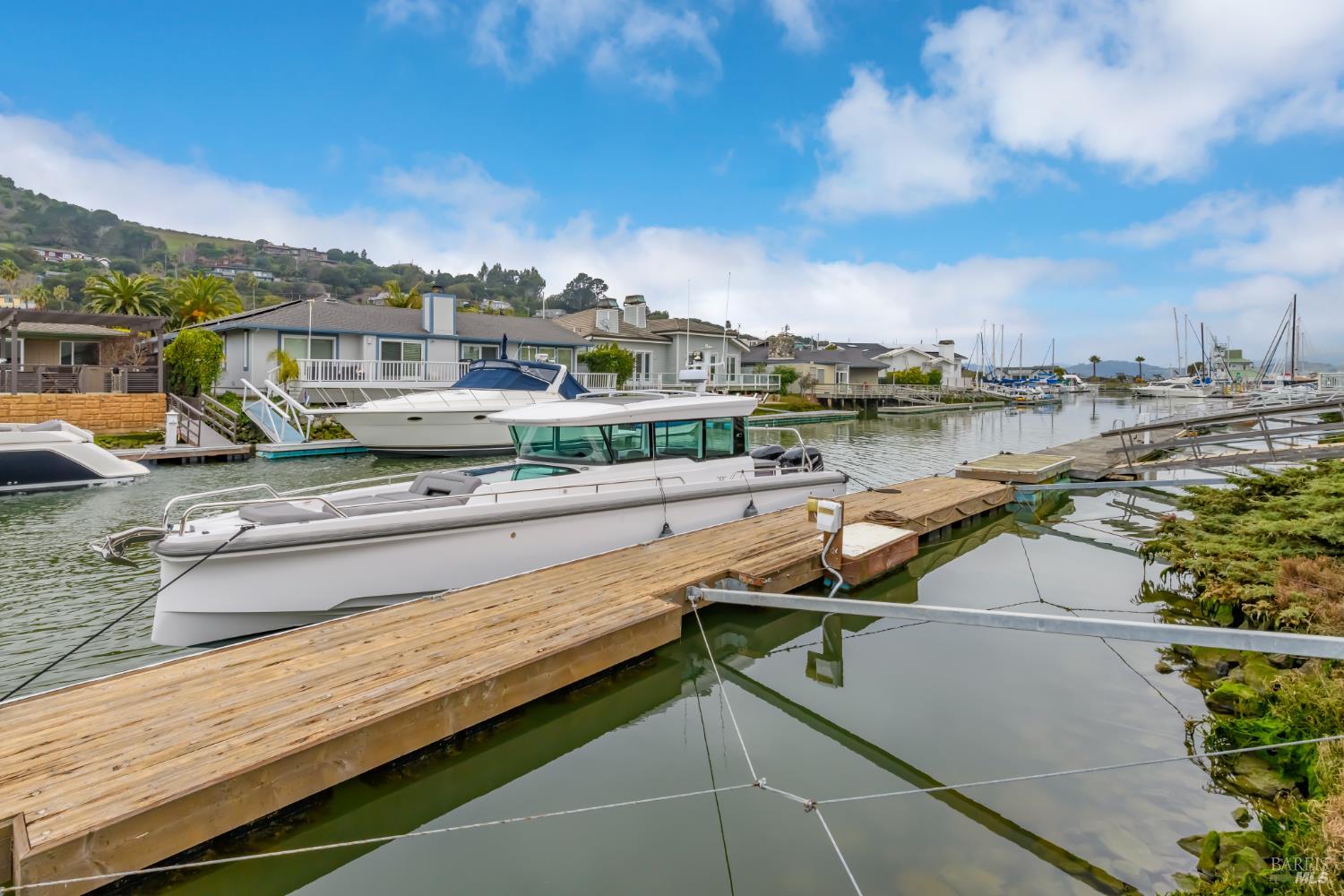 Set within the coveted waterfront enclave of Paradise Cay, this elegant single-level, three-bedroom, two-bath residence offers a seamless blend of elevated luxury, relaxed comfort, and effortless indoor-outdoor living. Framed by sparkling water views, this home radiates charm and ambiance, and is flooded with natural sunlight that highlights the beautiful wide-plank white oak floors, refined designer finishes, and expansive windows throughout. The thoughtfully designed layout provides ideal separation, with gracious entertaining spaces on one wing and private bedroom retreats on the other. At the heart of the home is a grand open-concept living room with soaring open-beam ceilings and a timeless wood-burning fireplace- an inviting space for both intimate evenings and lively gatherings. The bright, eat-in kitchen is equally welcoming, appointed with a gas range, stainless steel appliances, and generous counter space designed for shared meals and memorable moments. The serene water-view primary suite is a relaxing retreat, offering a large dressing area, a spacious walk-in closet, and a newly remodeled luxurious marble bathroom. Most of the entertaining spaces and bedrooms open seamlessly to the expansive waterfront deck, where glorious afternoon sun sets the stage for outdoor dining, play, and relaxation. The deck connects directly to a rare ~58-foot deep-water dock- providing effortless access from your backyard to the iconic San Francisco Bay. Located on a charming, tree-lined cul-de-sac of just 16 homes, this property offers exceptional privacy. An attached garage adds everyday convenience, while the fully gated motor court provides a secure off-street space for children, pets, or additional parking, enhancing the sense of seclusion and escape. Perfect as a full-time residence or a lock-and-leave weekend getaway, this distinctive home presents a unique opportunity to embrace the best of Marin coastal living.