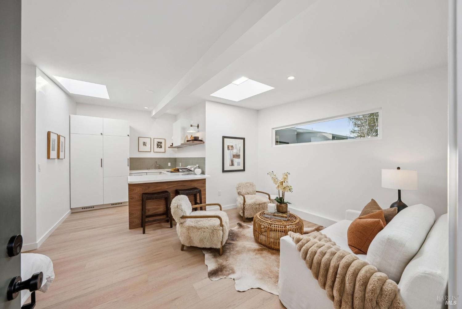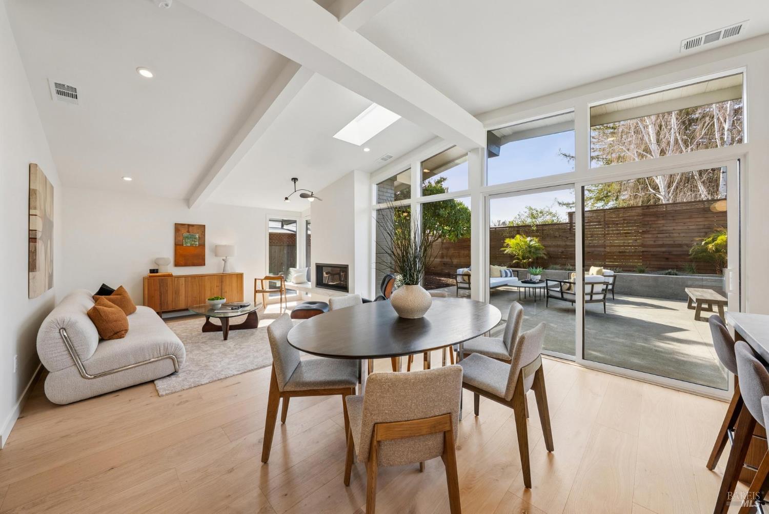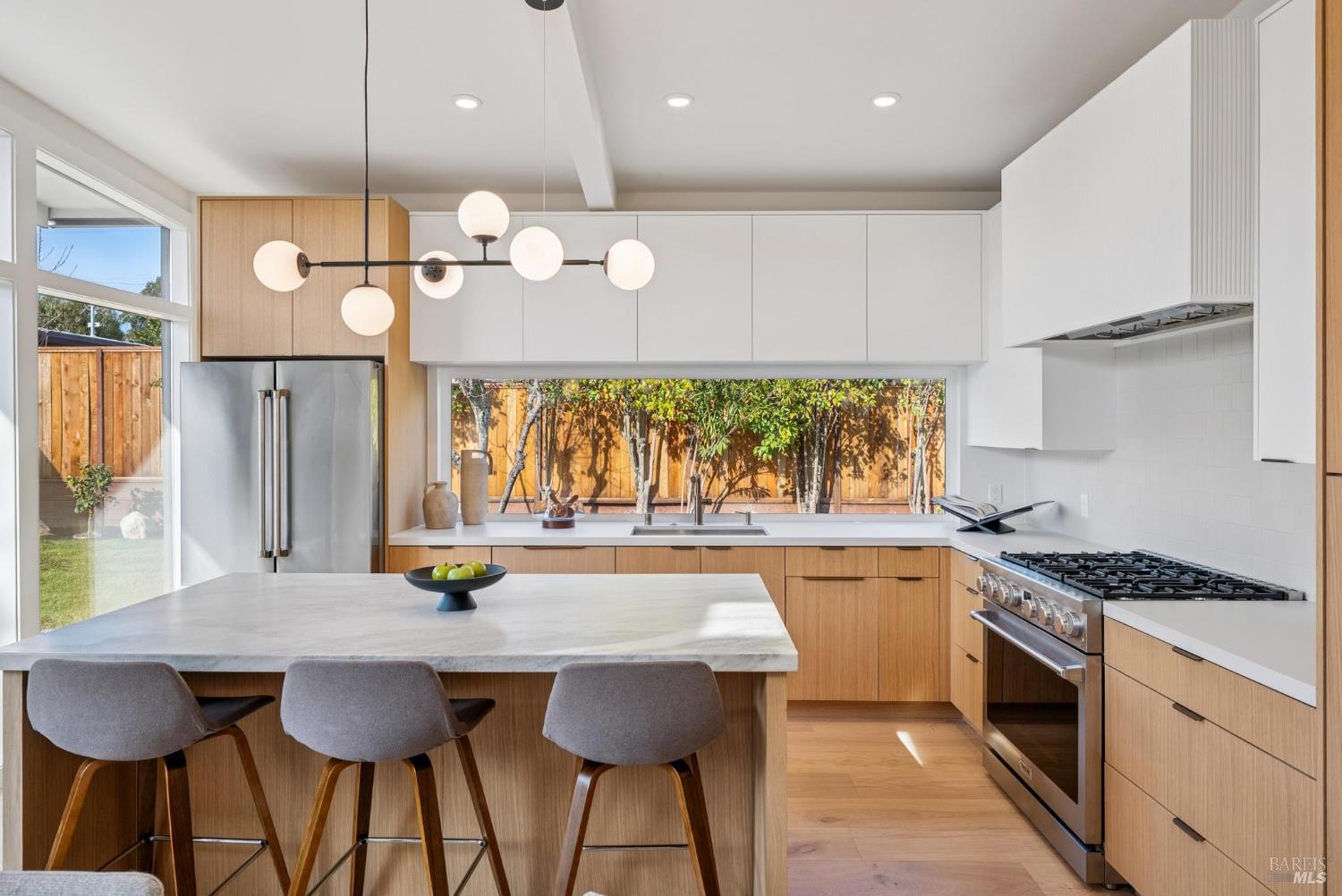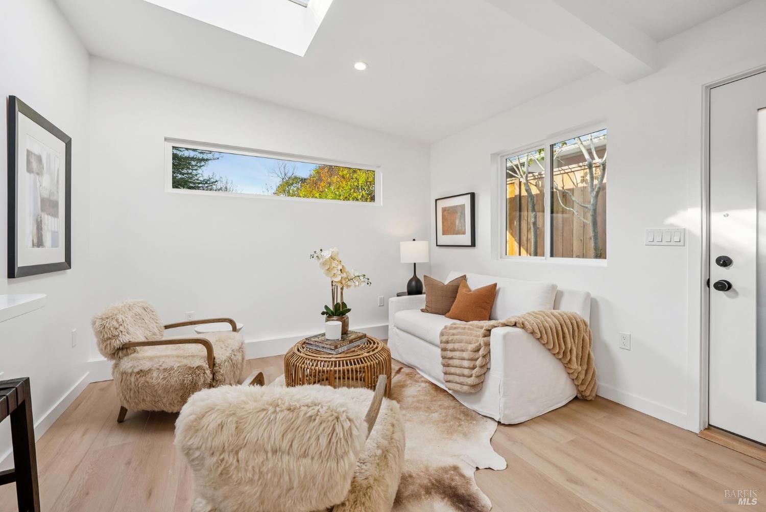 Meticulously remodeled Alliance-built home + spectacular ADU! The 1468 sqft main home has 4 beds + 2 baths w/ highly coveted upgrades such as custom light fixtures, added storage, a full service laundry room & central HVAC system. Soaring ceilings & strategically placed skylights throughout the home bathe the interior in natural light enhancing the sense of volume & architectural clarity. The living room showcases a sleek gas fireplace w/ custom floating quartzite bench creating a striking focal point & warm atmosphere. The spacious kitchen is anchored by a Dolomite marble-topped island & encompassed by contemporary white oak cabinetry, Caesarstone counters & a stunning fluted hood over the THOR gas range. Subtle luxuries including a dedicated coffee nook, integrated charging drawer, pop-up outlets & handcrafted tile backsplash that add a level of refinement to everyday living. These spaces are seamlessly connected by the vast wall of glass creating the iconic indoor/outdoor environment that this architecture is rooted in. The magazine-worthy bathrooms create a spa-like sensibility that are sure to win you over. The primary en-suite encompasses you w/ soothing textures such as the floor-to-ceiling tile work, an expansive curbless walk-in showers w/ travertine flooring & ample counter space above the floating teak double vanity, while the hall bath boats Moroccan limestone floors & Carrara marble vanity top. The fully upgraded 388 sqft ADU w/ studio style living + full modern bath echoes the sophistication of the main house featuring a sleek kitchen, all new appliances & new mini-split system creating the perfect space for an au pair, in-laws or a rental opportunity. The new fencing, foam roof & freshly poured concrete establish long-term function, while lush landscaping softens the exterior. From the verdant lawn to the mature orange tree, every exterior space of this home is as refined as it is relaxed. Centrally located in Terra Linda, this home offers a peaceful neighborhood setting w/ easy access to Highway 101, local shops & dining. Anyone seeking an intentionally designed move-in-ready home needs to look no further than 319 Holly Dr.
