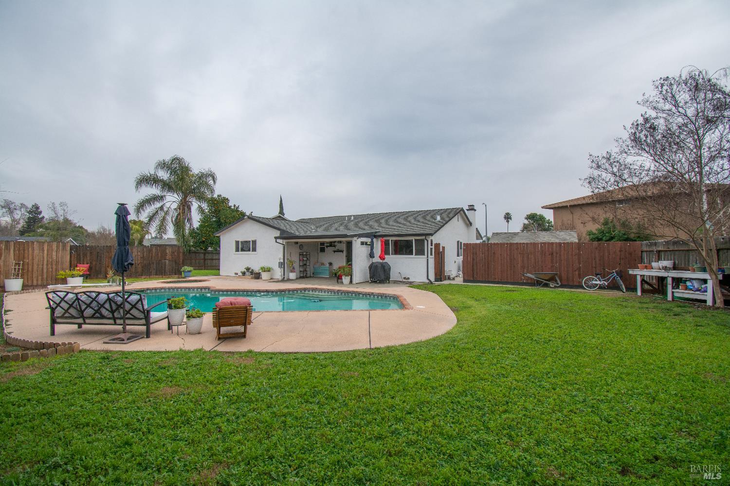Welcome to this beautifully maintained single-story home located on a peaceful court in Dixon, just steps from a neighborhood park. The well-established neighborhood is lined with mature trees, offering an inviting and charming setting. Featuring thoughtful updates and a backyard built for entertaining. Originally a 4-bedroom home, a wall was removed to create an expanded primary bedroom; the layout can easily be converted back if desired. The kitchen has been tastefully remodeled cabinetry, countertops, and appliances, creating a functional and welcoming space. The home offers 1,619 sq. ft. of living space and features a newer HVAC system and roof installed in 2012. Additional recent upgrades include a new WIFI-enabled garage door, a new water heater with a recirculating pump and security cameras that will remain with the property. Step outside to a covered patio with built-in speakers, offering ample space to relax and entertain year-round. The generous 8,712 sq. ft. backyard is designed for outdoor enjoyment, featuring an in-ground pool, spa, multiple seating areas, and space for BBQs and gatherings. Large side yards provide excellent RV parking potential, along with a storage shed for added convenience. A solar system with two battery backups helps offset energy costs, with monthly expenses significantly lower than prior PG&E bills From the open and inviting floor plan to the resort-style backyard, this home offers comfort and charm. It is ready to be enjoyed for years to come!