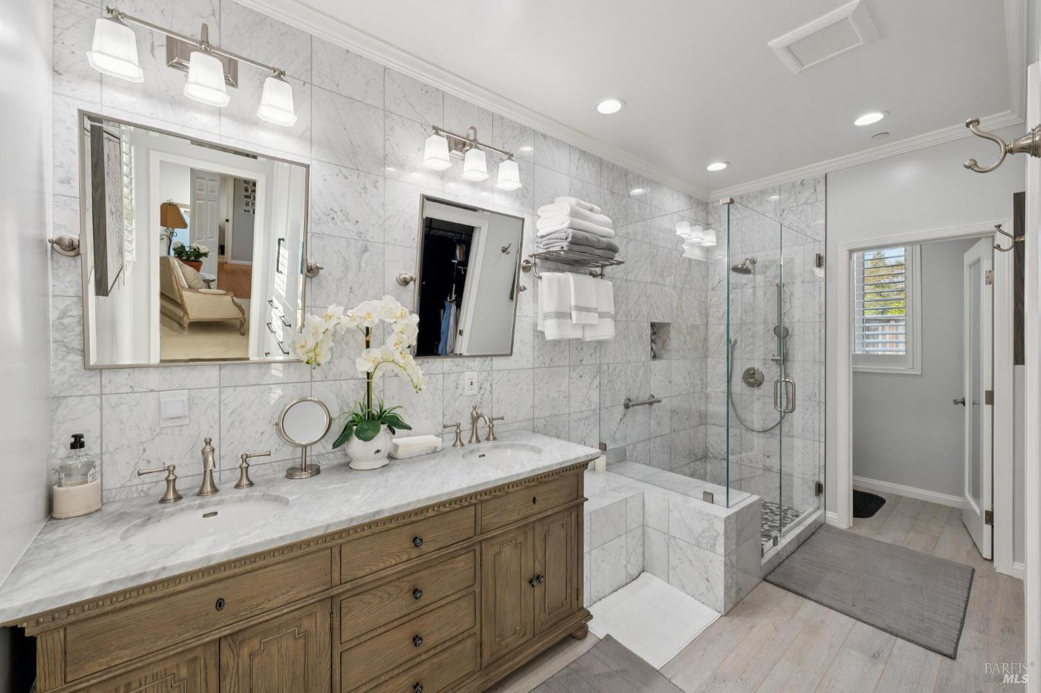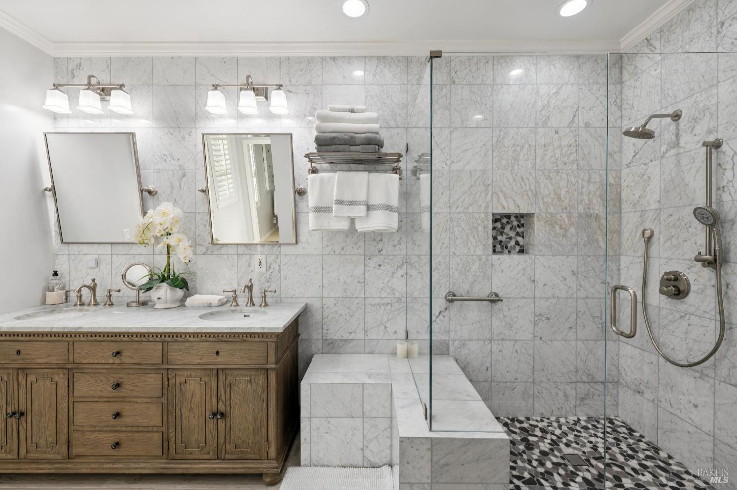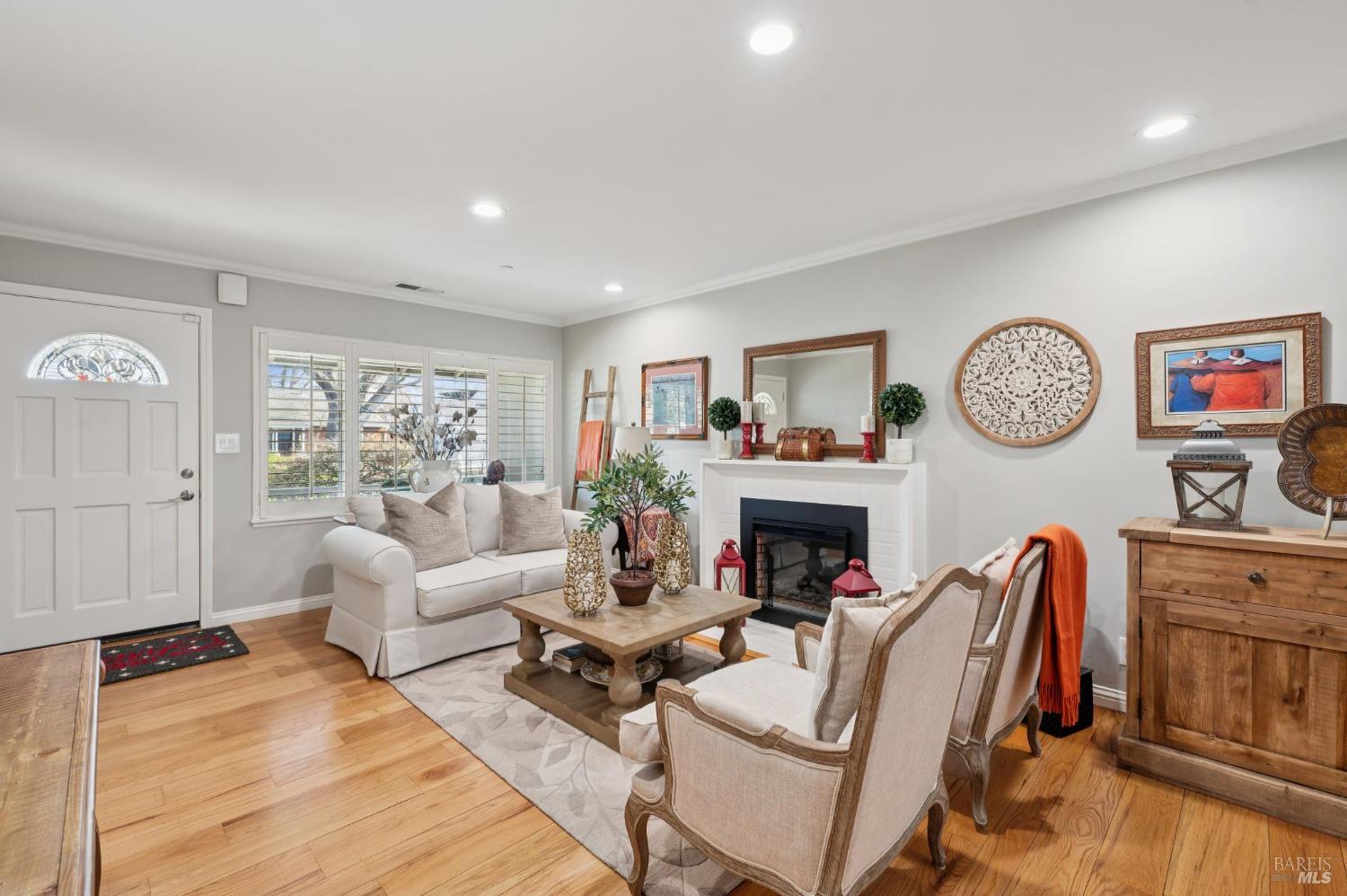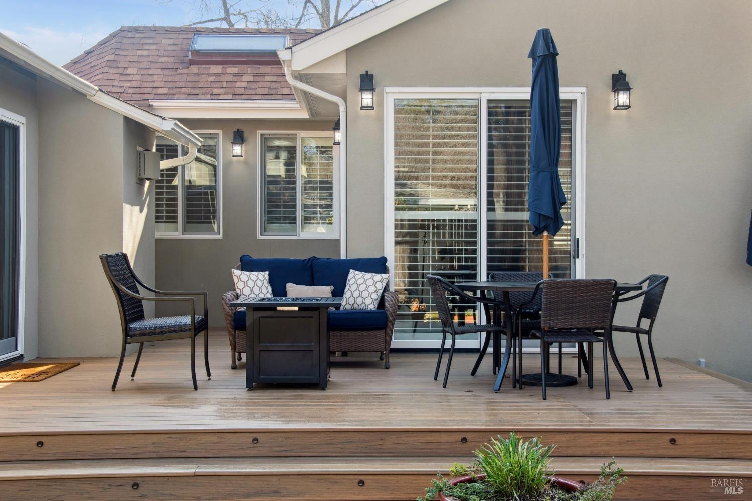 Extensively expanded and beautifully remodeled, this exceptional single-level home offers a flexible floor plan with two primary suites and thoughtful upgrades throughout. Highlights include a brand-new gourmet kitchen with quartz countertops, custom cabinetry, wine/coffee bar, and built-in banquette seating, along with a new roof and updated windows and French sliding doors. The spacious family room features a gas fireplace and seamless indoor-outdoor flow to the landscaped backyard with Trex decking and an outdoor kitchen. The newer second primary suite addition showcases 9-foot ceilings, a walk-in closet, double marble vanity, and a dedicated heating and cooling system. Additional features include hardwood floors, updated baths, skylights, recessed LED lighting, indoor laundry, and mature front and back landscaping with irrigation and lighting. A rare opportunity for a truly move-in-ready home with quality improvements and modern comfort throughout.