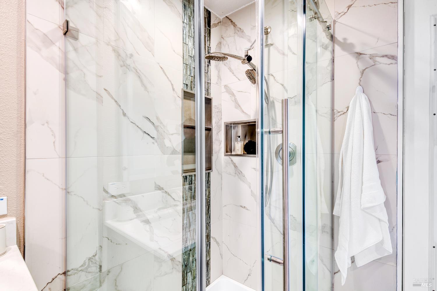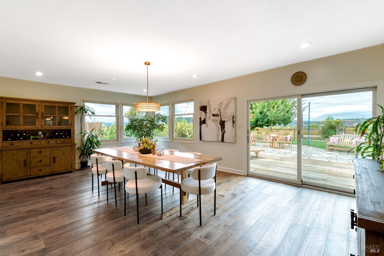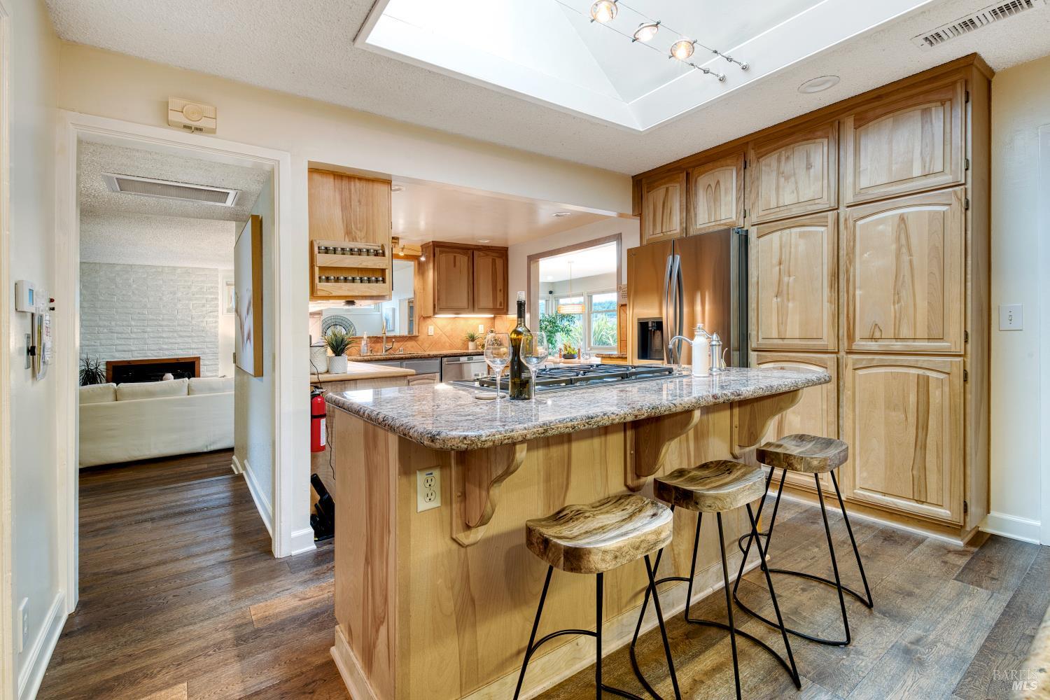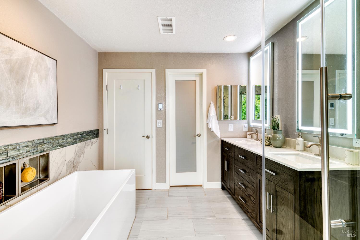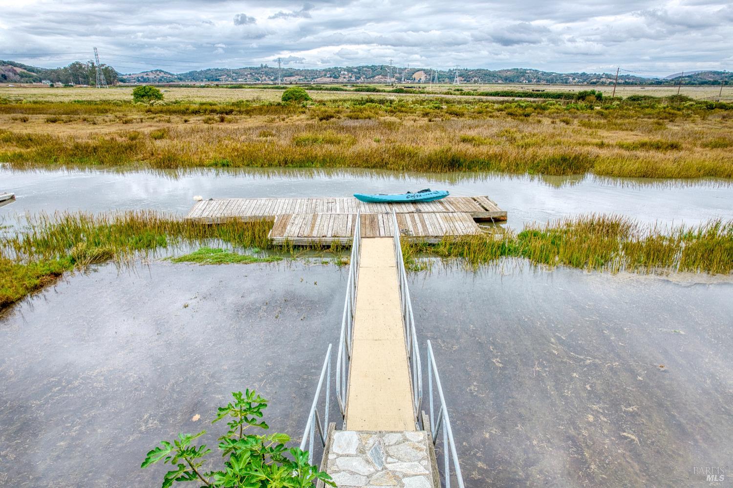 Enjoy single level living in one of Marin County's most sought-after waterfront communities! This newly updated, turn-key home has a lot to offer with 3 large bedrooms (one with private entrance) and 3 full baths, all with heated floors. Primary bath has door to backyard and garden, looking out to open space. The chef's kitchen opens to dining room and includes a peek-a-boo window looking into living room, a smart oven, island with Wolf range prep sink and seating for 4. All stainless steel appliances & granite countertops plus a 7' baker's butcher block counter, all with custom cabinets. Office/den/nursery off kitchen as well as cold room for wine storage or use as an additional pantry. Large dining room with seating for 12 looks out to backyard for sunset views. Plenty of natural light thanks to large Anderson windows and custom blinds as well as low E skylights and light tubes with shade screens. New roof in 2018 with a 21 panel (fully owned) Solar system, heat pump and A/C. 2 car garage with built-in cabinets, work bench and attic storage. Backyard is artfully landscaped with a redwood deck & Idaho quartz patio. Gas connections ready for outdoor kitchen and fire pit, plus teak furniture, fenced-in raised vegetable garden, and multiple fruit trees (tangerine, lemon, fig, pomegranate, persimmon, apricot, peach & apple); all with a private 33'dock on Novato Creek, giving unlimited access to the bay and backing up to open space for plenty of light and privacy. Kayak is included! Montego Park is just 5 houses away on same side of street...It offers pickleball, bocce ball, a playground for kids, freestanding bbq's and a big lawn for flying kites or exercising Fido.