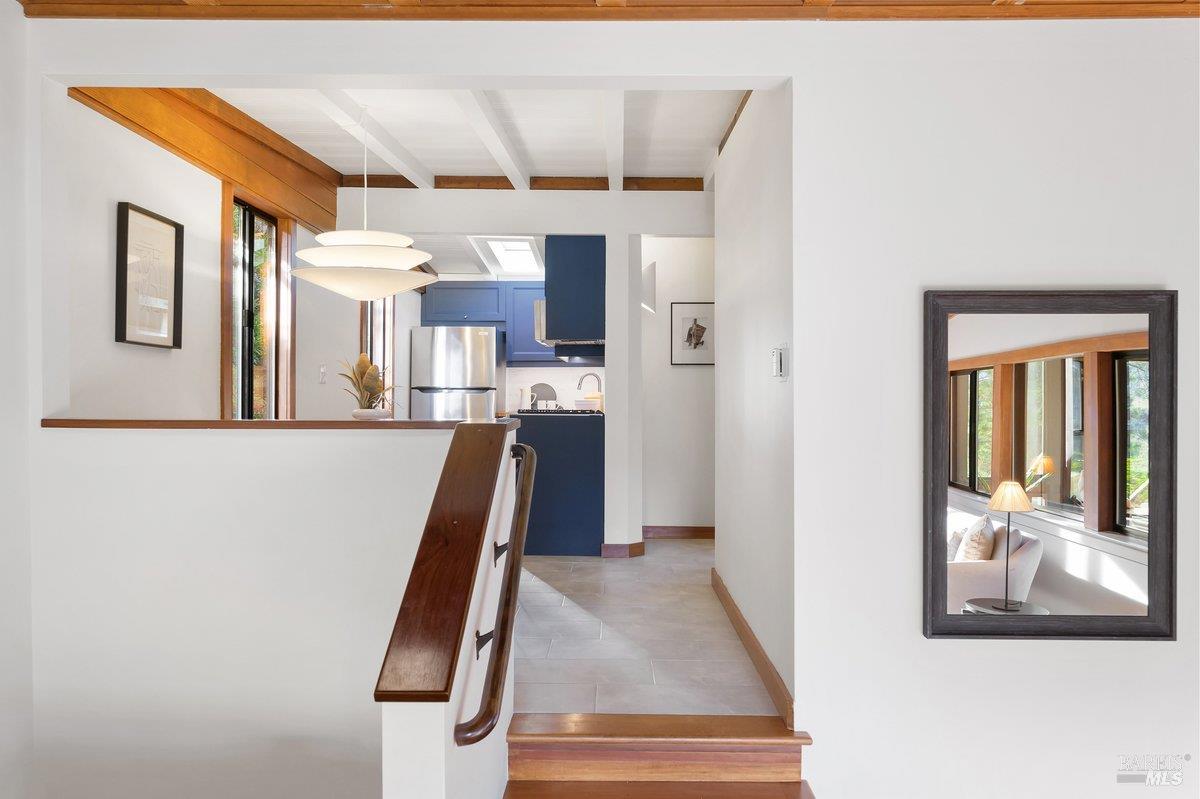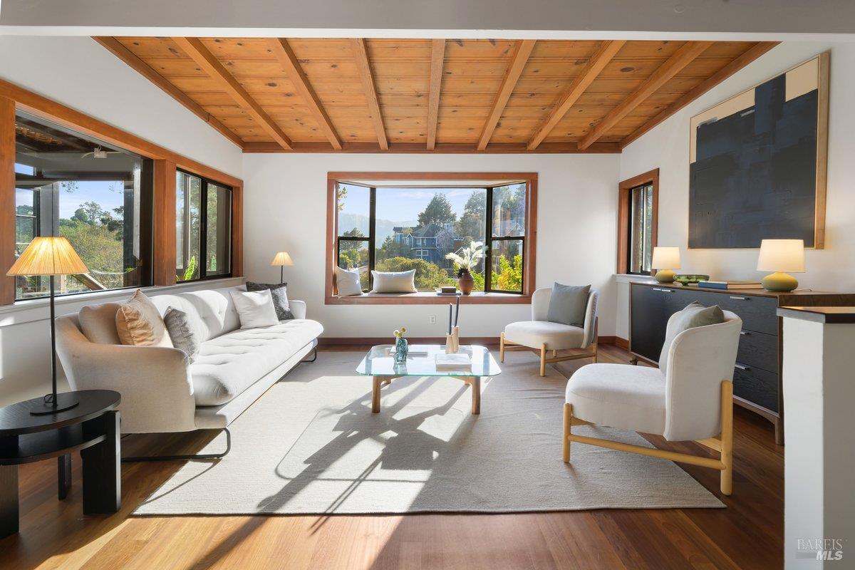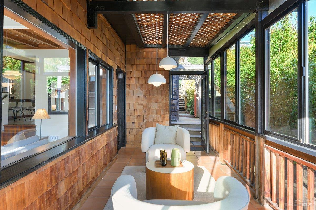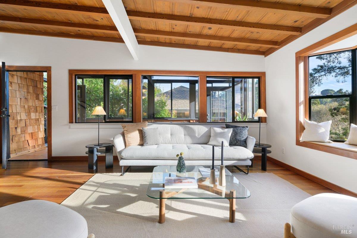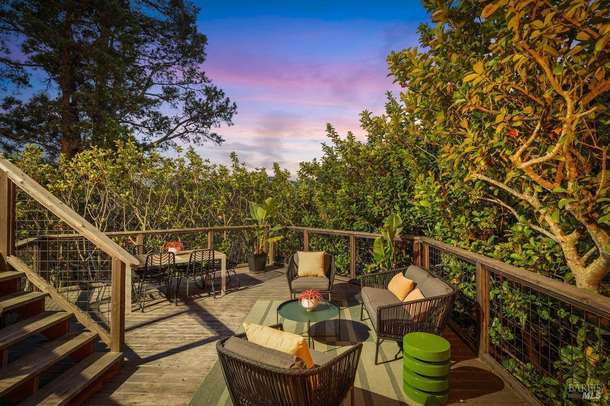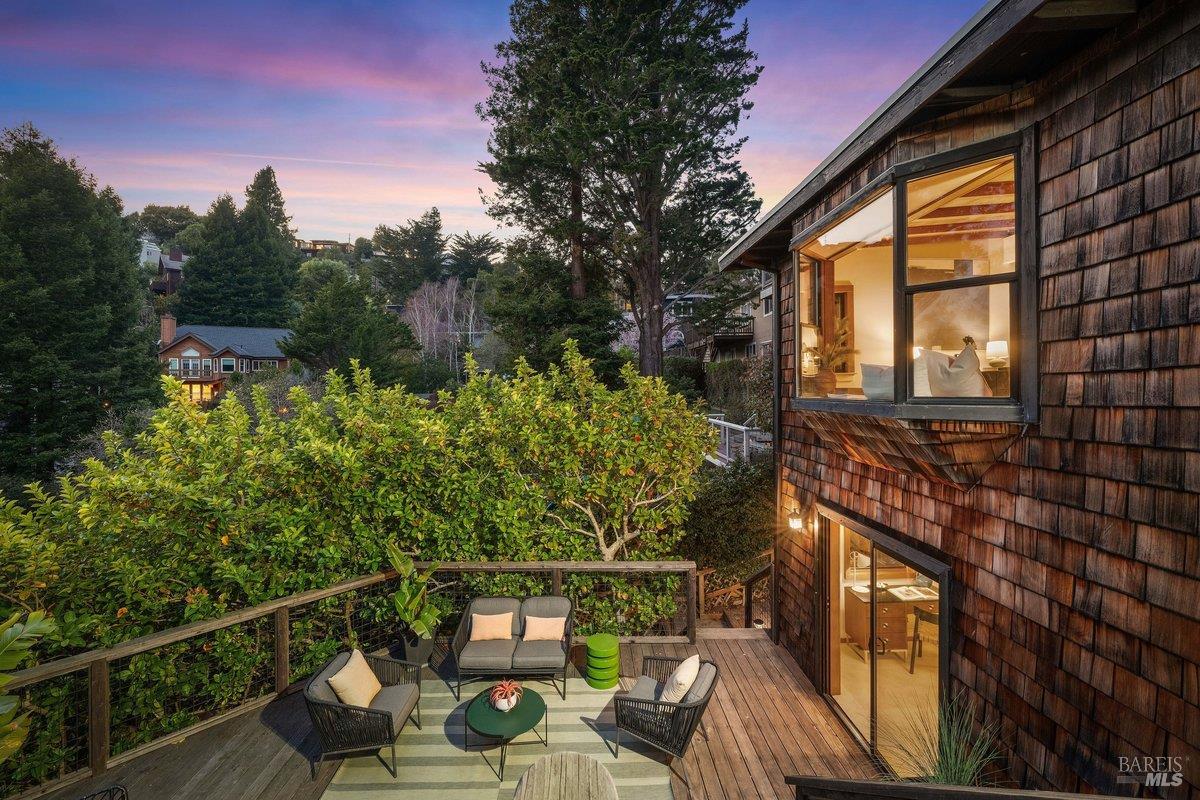 Set on a private, sunny street-to-street lot in Mill Valley, 12 Alturas Way blends classic charm with effortless indoor-outdoor living. Terraced gardens and a generous sun deck create the kind of setting that feels both welcoming and secluded. Inside, an enclosed porch leads to a bright living room with hardwood floors and open-beam ceilings, flowing into a remodeled kitchen and comfortable open floor plan. A large bay window frames wide Tam Valley views. Two bedrooms and a full bath complete the main level. Downstairs, the spacious primary suite offers a large walk-in closet, a private bath, and sliding glass doors that open directly to an expansive deck. The home is approximately 1,380 square feet plus storage, a laundry room, and ample parking. The 4,800-square-foot lot includes a second entrance at 909 West California Street, adding flexibility, privacy, and future potential. Minutes to Tam Junction with easy access to 101, 15 minutes to the beach, and a quick hop to Miller Avenue and downtown Mill Valley. A home you won't want to miss.