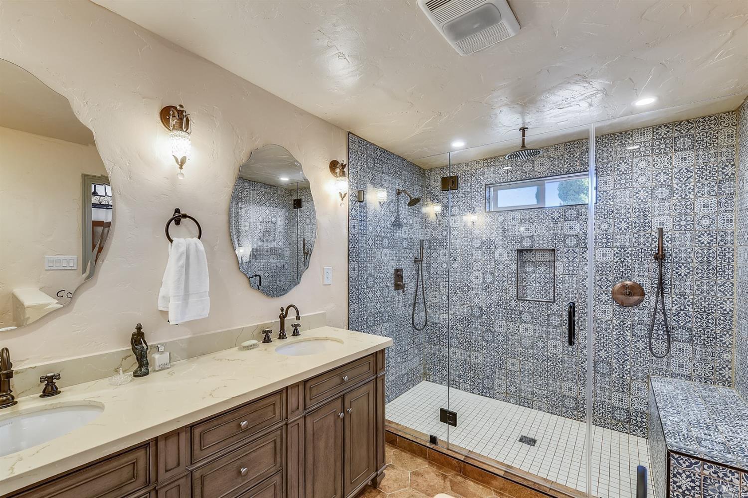 • Primary Bathroom Features Double Sinks,Multiple Shower Heads,Tile,Window