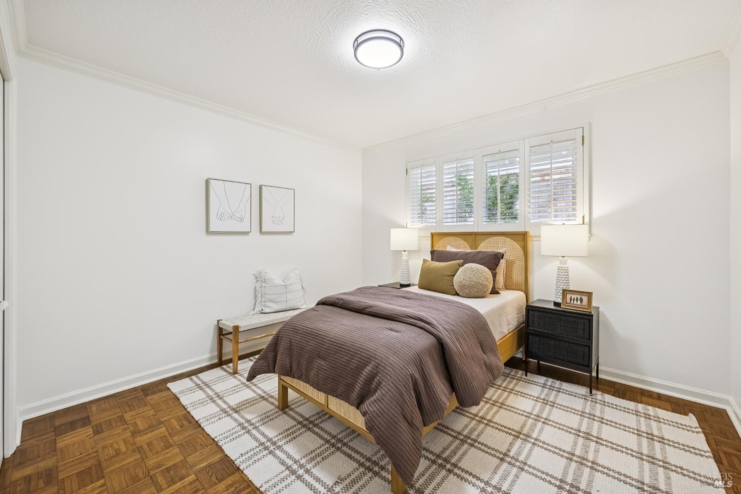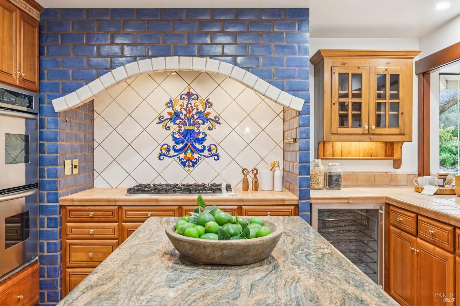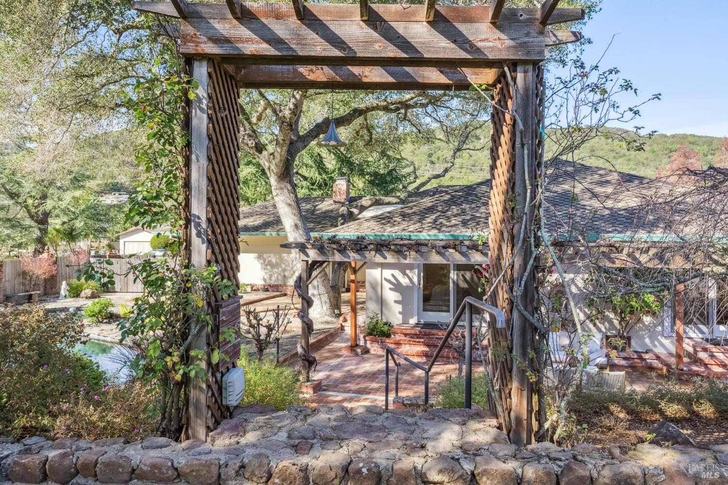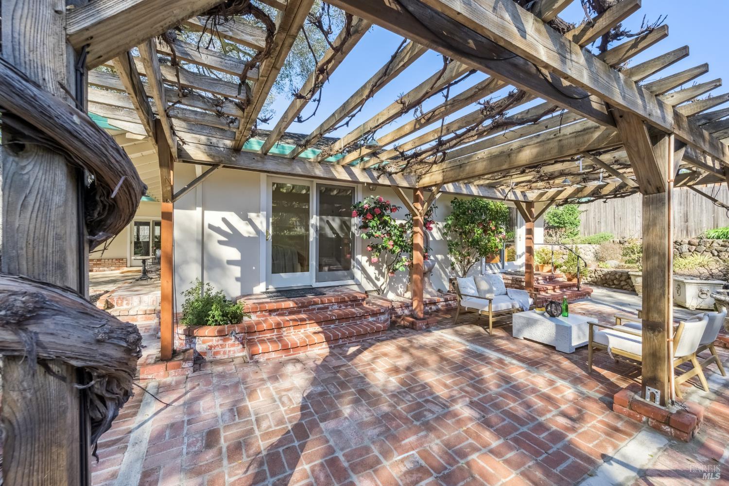 A special find in Marin Country Club, this single-level 4-bedroom, 2-bath home sits on a rare corner double lot offering space, privacy, and exceptional outdoor beauty. Inside, a large step-down living room with a fireplace and formal dining room create inviting spaces for entertaining, while the Mediterranean-inspired kitchen opens to a cozy step-down family room with its own fireplace and built-in shelving. One bedroom is thoughtfully designed as a dedicated office with custom built-ins. The primary suite enjoys direct access to the phenomenal backyard, featuring a lovely pool with an attached hot tub, beautiful rose gardens, and a park-like setting shaded by gorgeous heritage oaks. A pergola-covered brick patio is perfect for gatherings, while the upper parcel offers a tranquil koi pond with waterfall, a large grassy area, and open space beyond - truly a gardener's paradise!