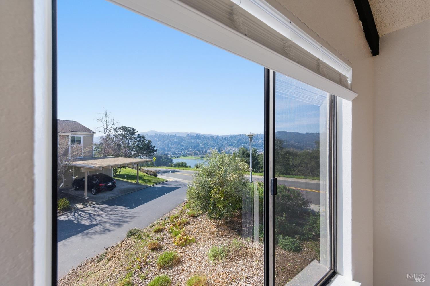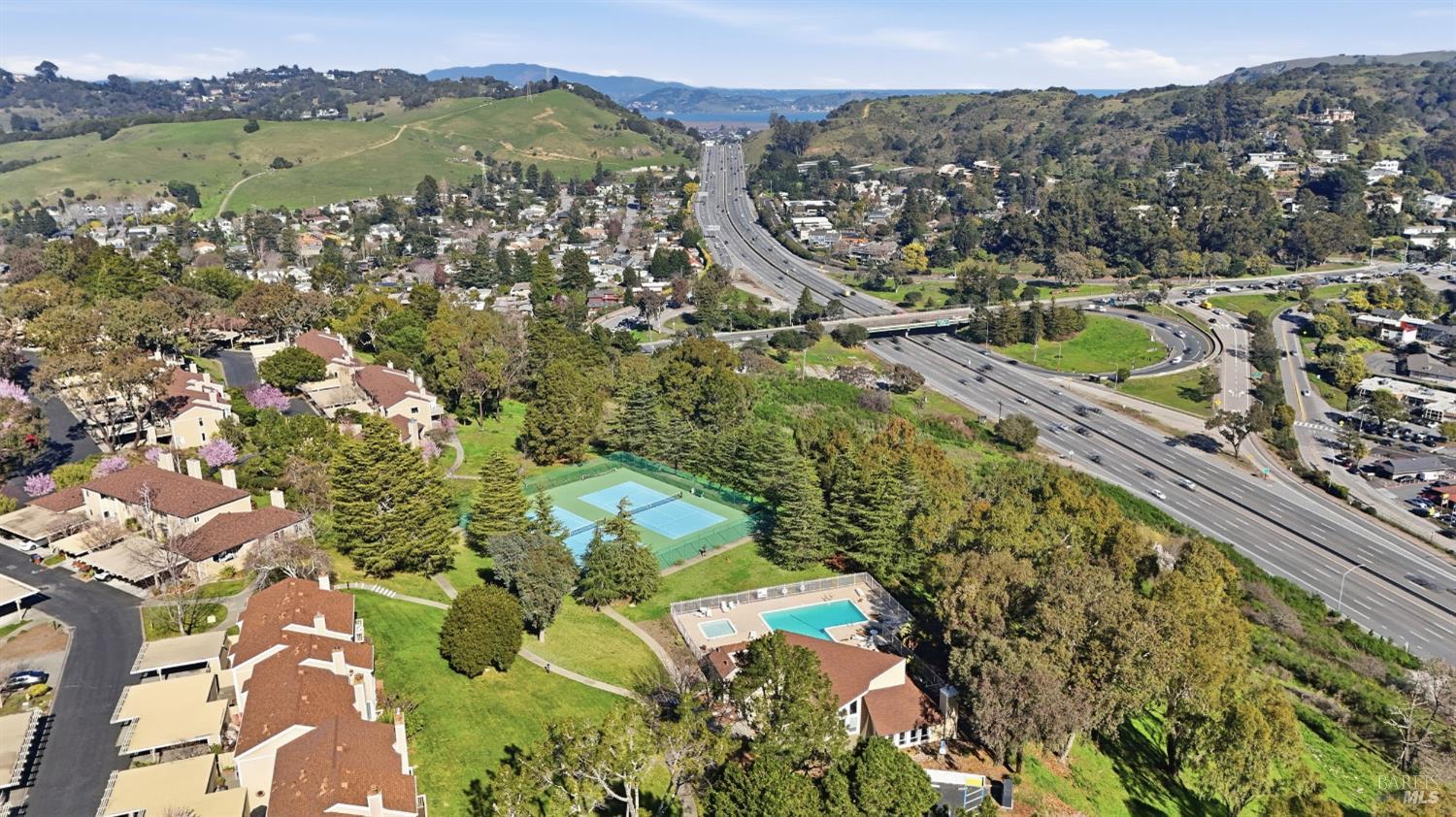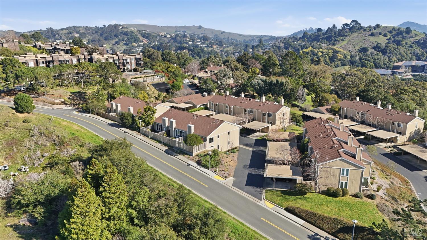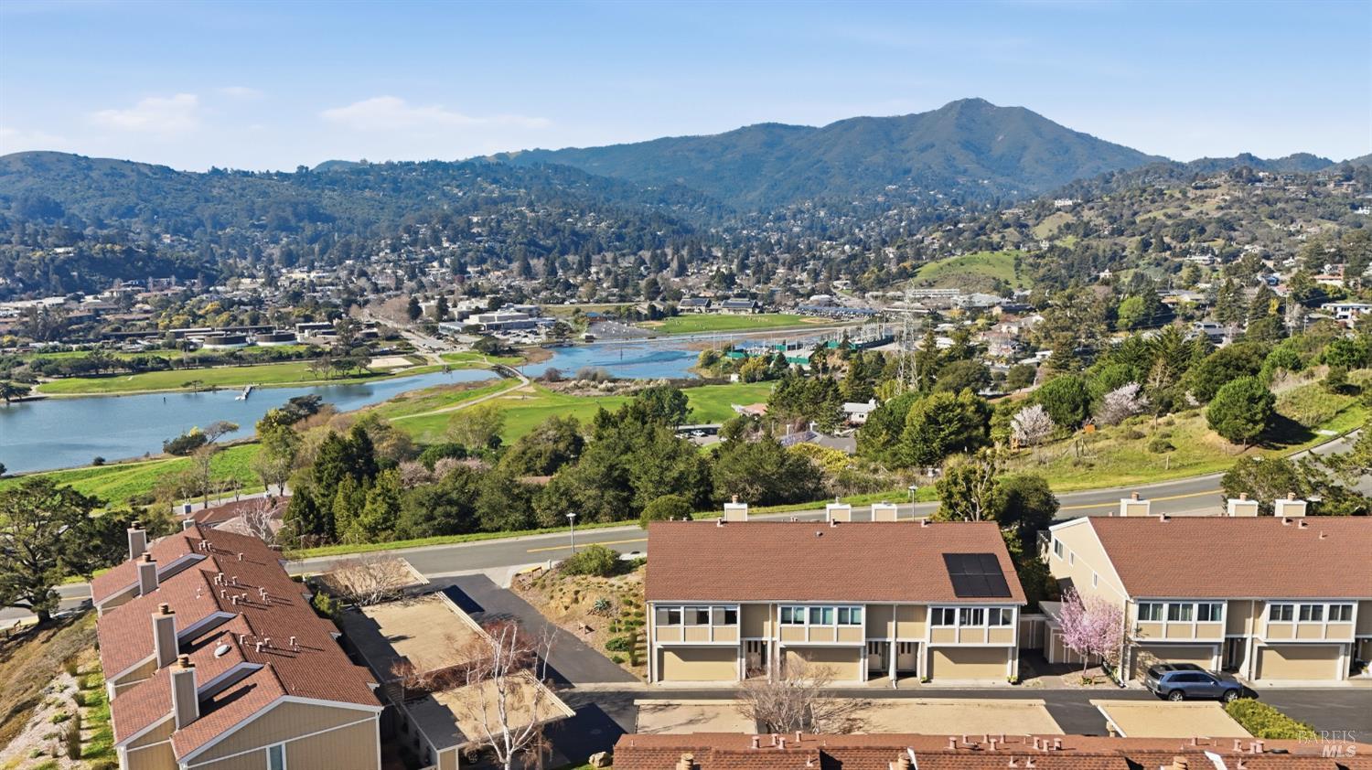 Perched on the hill, this home offers a premier location where the views are spectacular, access to town, trails and amenities are so close! Welcome home to this spacious and sun-drenched 3 bedroom, 2 bathroom home in the community of Shelter Ridge in Mill Valley. Imagine living in a home that feels bright and open, with vaulted ceilings accented by exposed beams and large windows throughout the main living areas. Warm wide-plank LVP flooring runs throughout the living and dining spaces. The galley kitchen features high-end stainless steel appliances, including a dishwasher and large pantry, a breakfast bar flows into the dining area that opens to the private patio, making it ideal for entertaining or relaxing and enjoying scenic views toward Mt. Tamalpais and Bayfront Park. The 2 upstairs Bedrooms are generously sized with plush carpeting and ample closet space, including a spacious lower-level room primary suite, guest space, or home office with two spacious closets just outside the bedroom. The two-car garage offers direct interior access and includes a workbench, laundry area, and ample storage. Residents enjoy access to resort-style amenities including a swimming pool, tennis courts, and a private community room, all set within beautifully landscaped grounds. The location is conveniently close to Highway 101, Whole Foods Market, The Cantina, Hauke Park, Bayfront Park, and downtown Mill Valley. A great opportunity to enjoy comfortable, low-maintenance living in one of Mill Valley's most well-kept communities.