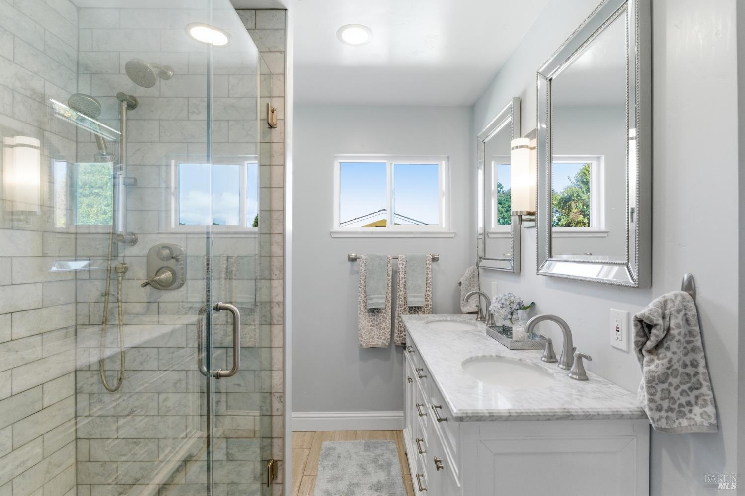 • Primary Bathroom Features Double Sinks,Shower Stall(s),Tile