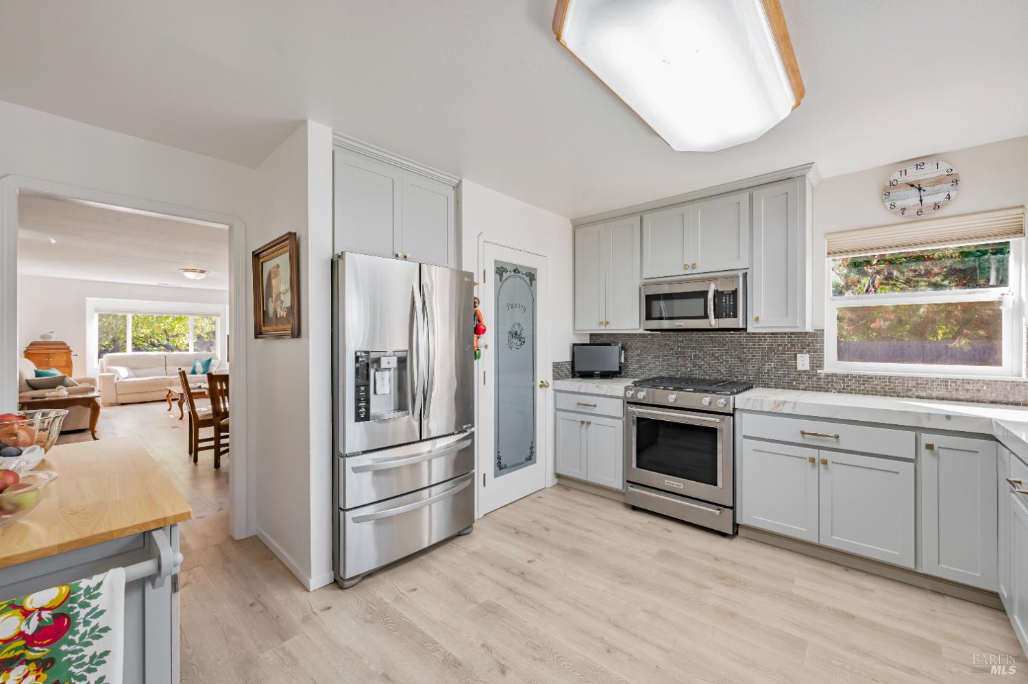 This charming country property features a beautifully remodeled three-bedroom home with two full bathrooms. The master suite boasts a spacious walk-in closet and a luxurious master bath complete with a stall shower and a sunk-in tub. The second bathroom features a sunk-in jacuzzi tub for ultimate relaxation. Enjoy modern living with newer vinyl floors throughout and double-pane windows that enhance energy efficiency. The updated kitchen is a highlight, showcasing quartz countertops, a stylish tile backsplash, and stainless steel appliances, including a trash compactor, a new refrigerator and a convenient food pantry. The large laundry/mud room adds to the functionality of the home. Cozy up on cool evenings by the wood-burning stove, framed by a beautiful wood mantel. Outside, the property spans three acres, complete with stalls and pastures, perfect for your animals or gardening. The oversized two-car garage offers ample storage and even includes a bathroom for added convenience. With two driveway accesses, there's plenty of parking, including designated RV parking. This property combines comfort, style, and space in a stunning country setting!