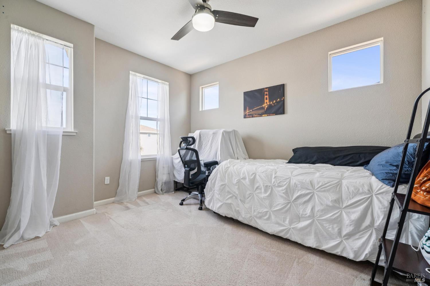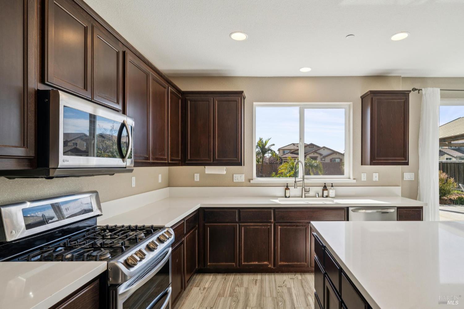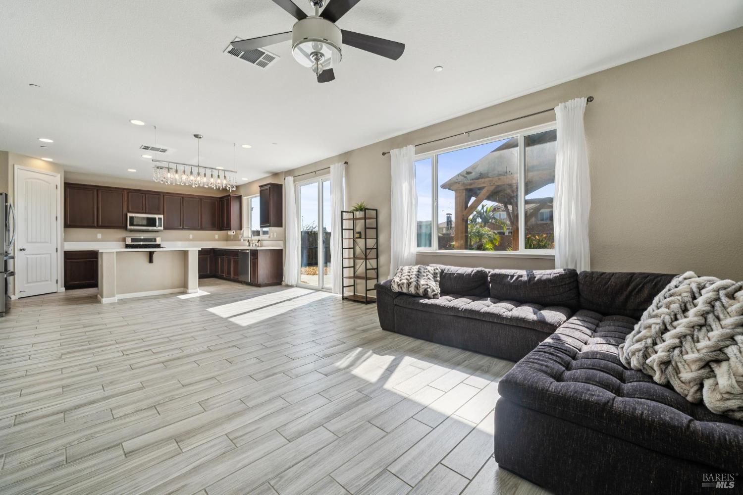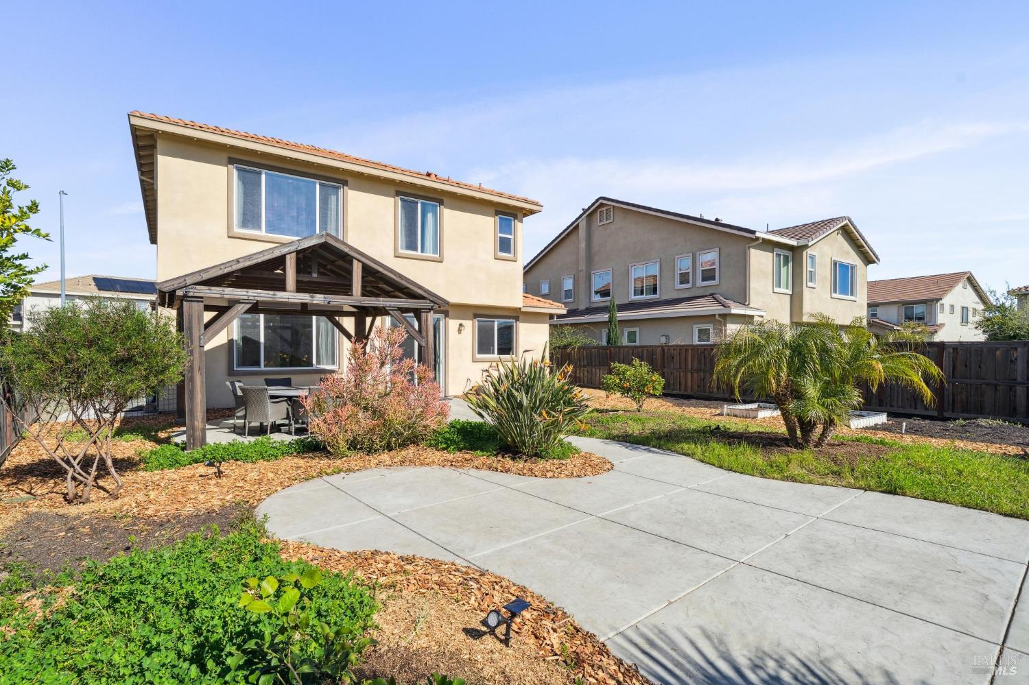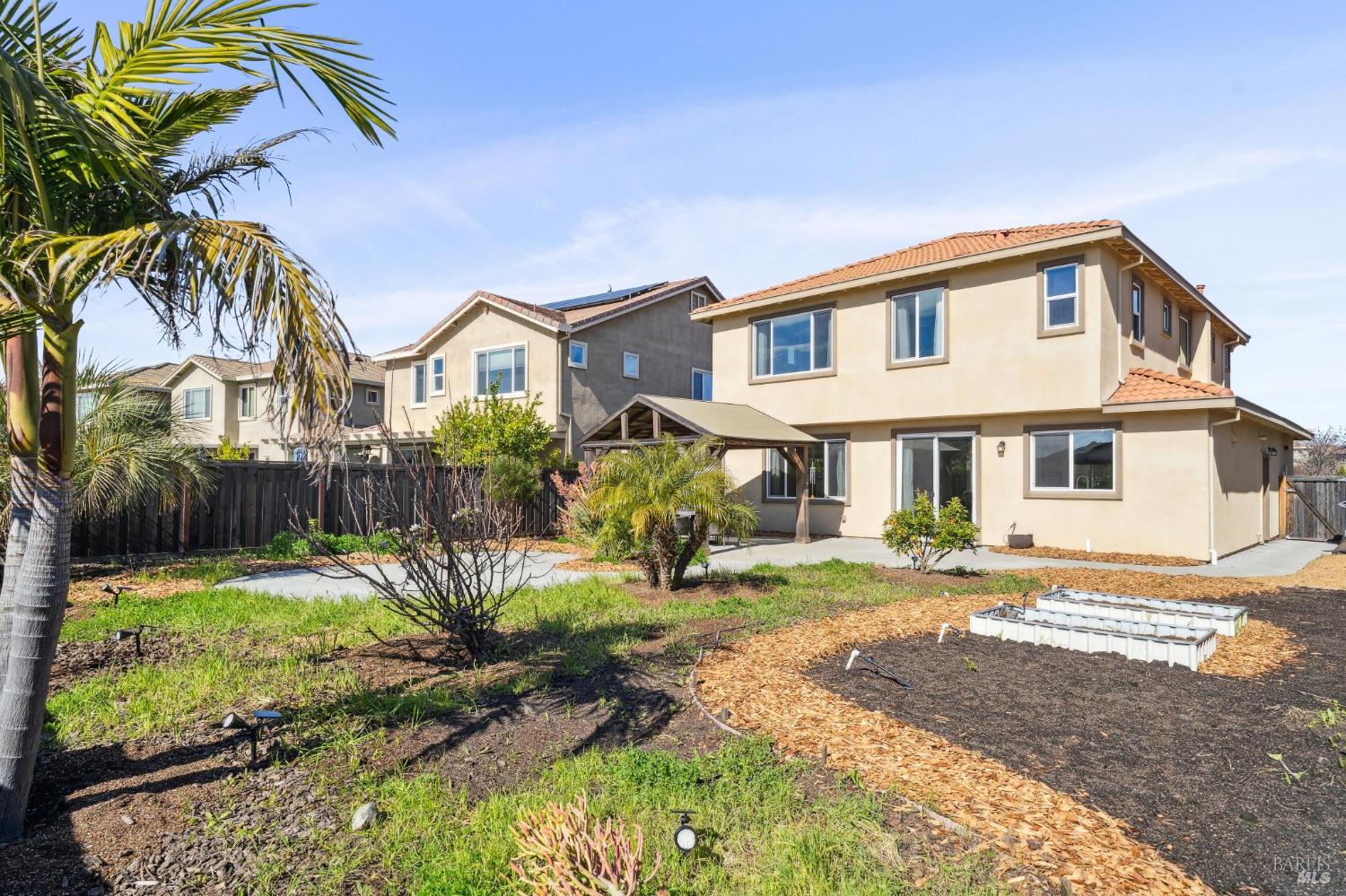 Welcome to this beautifully maintained 2017-built home offering an exceptionally versatile floor plan in a desirable Vacaville neighborhood with one standout feature that truly sets it apart: a rare oversized backyard in this subdivision. This spacious residence features four bedrooms plus a dedicated downstairs office, providing flexible living options ideal for multi-generational households, guests, or today's work-from-home lifestyle. The main level includes a private office conveniently located next to a full bathroom, making it an excellent option for a guest suite, extended family space, or potential fifth bedroom. The open-concept design showcases beautiful tile flooring, generous natural light, and seamless flow between the living, dining, and kitchen areas. The updated kitchen is well-appointed with new stainless steel appliances, ample counter space, and a large center island that opens effortlessly to the main living area perfect for both everyday living and entertaining. The family room leads directly to the backyard, creating easy indoor-outdoor connection. Upstairs, you'll find four bedrooms, and two full bathrooms, a conveniently located laundry room, and a spacious primary suite. The primary retreat offers an ensuite bathroom, walk-in closet. Step outside to your expansive, landscaped backyard a rare find for this neighborhood. Designed for both enjoyment and abundance, it features a multitude of mature fruit trees, raised garden beds for seasonal planting, and a charming gazebo perfect for outdoor dining or relaxing evenings. With more space than most homes in the subdivision, this yard offers privacy, room to entertain, and the opportunity to truly create your own outdoor sanctuary. Conveniently located near shopping, dining, and freeway access, this move-in ready home blends comfort, flexibility, and long-term value all with a backyard you simply won't find everywhere else.