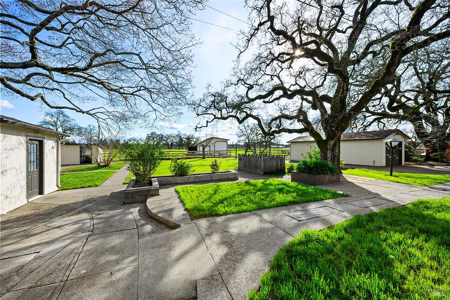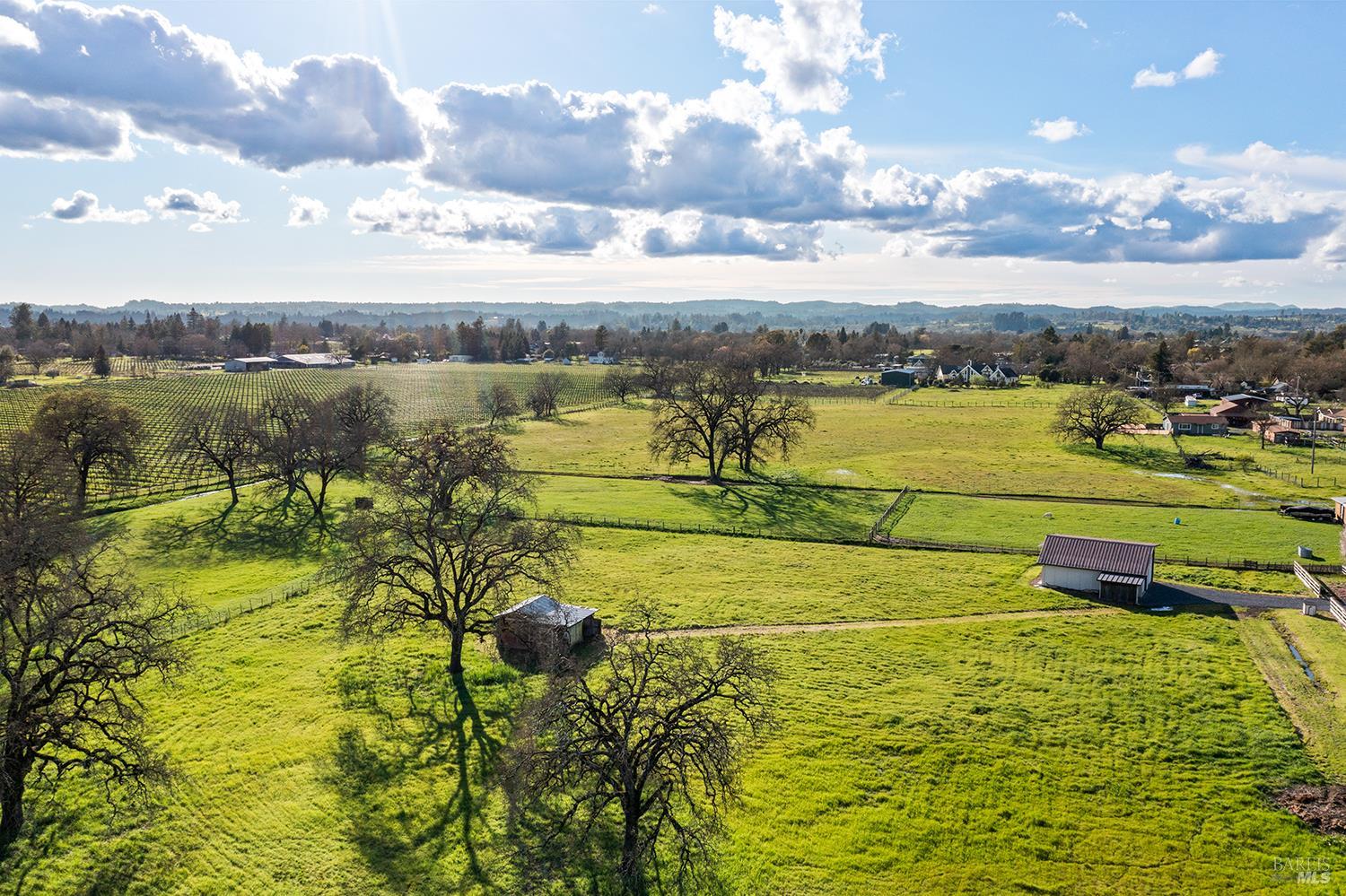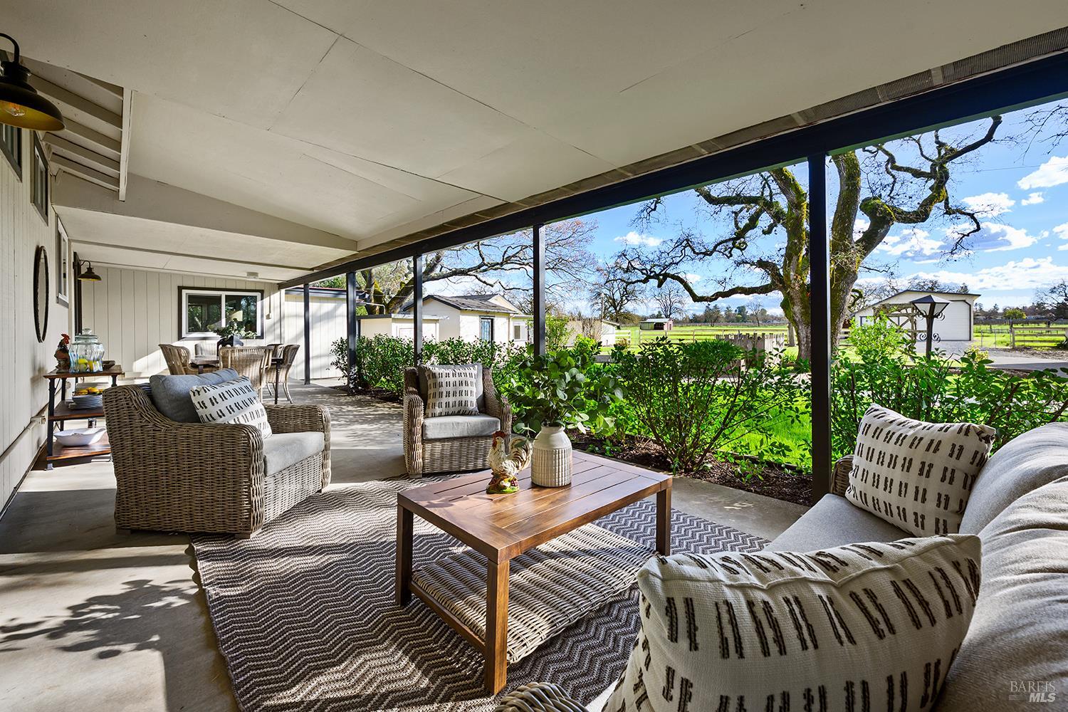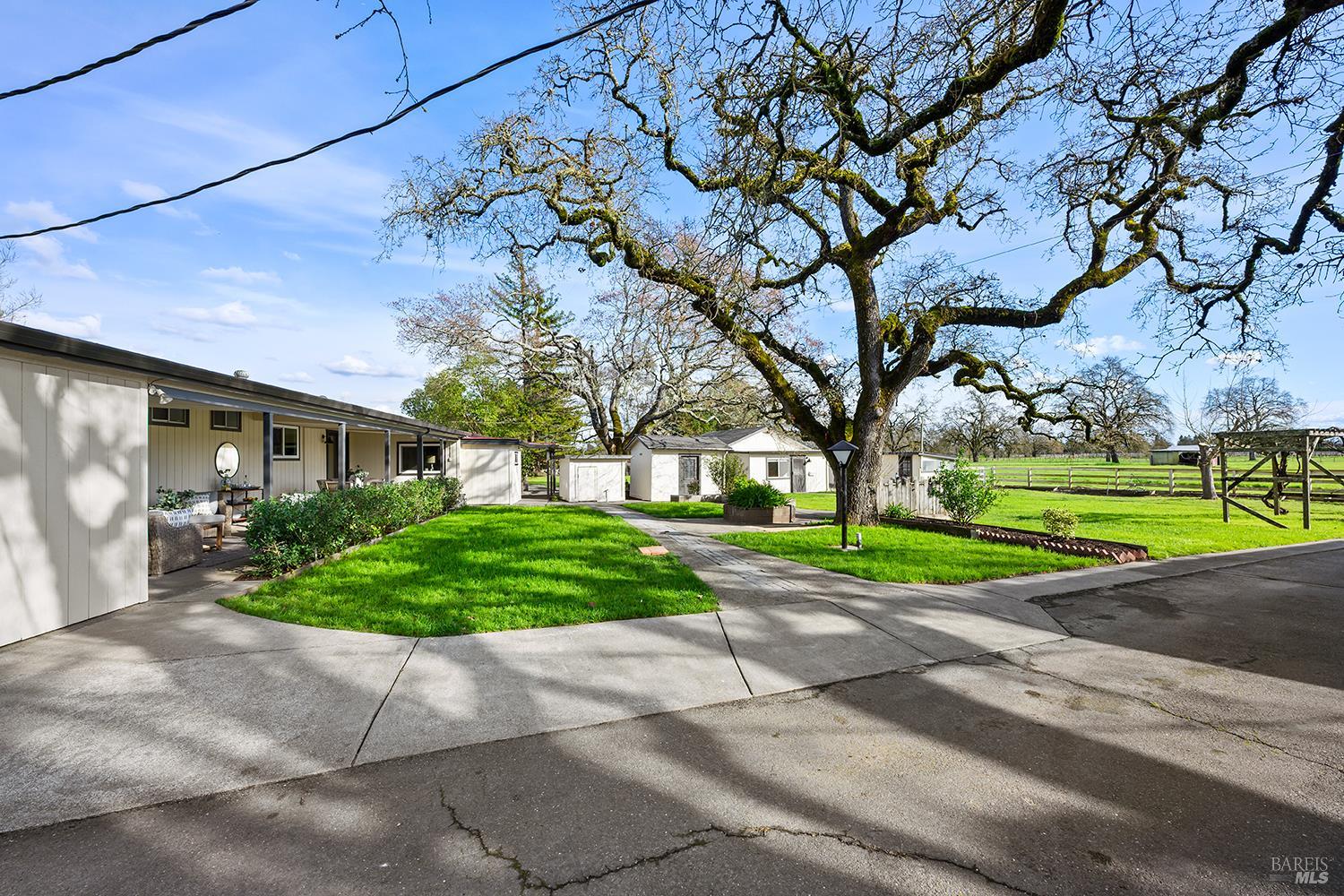 Set up for generational living, this beautifully refreshed sprawling single-story home is located at the end of a quiet country lane on 3.85+/- pristine acres. Set amidst majestic oaks, the main home as set up will accommodate two separate living situations, and then there is a detached finished flex space that can serve as an ideal home office, or could be guest quarters for the occasional visitor. There is a barn perfectly suited for the gentleman farmer, and two additional sizable outbuildings that could serve as car or RV storage, or even just as workshops. Horses, cows, goats or sheep would be happy on this level parcel in the middle of Sonoma County's premier Russian River Wine Country. This is peace and serenity at its finest close to all conveniences.