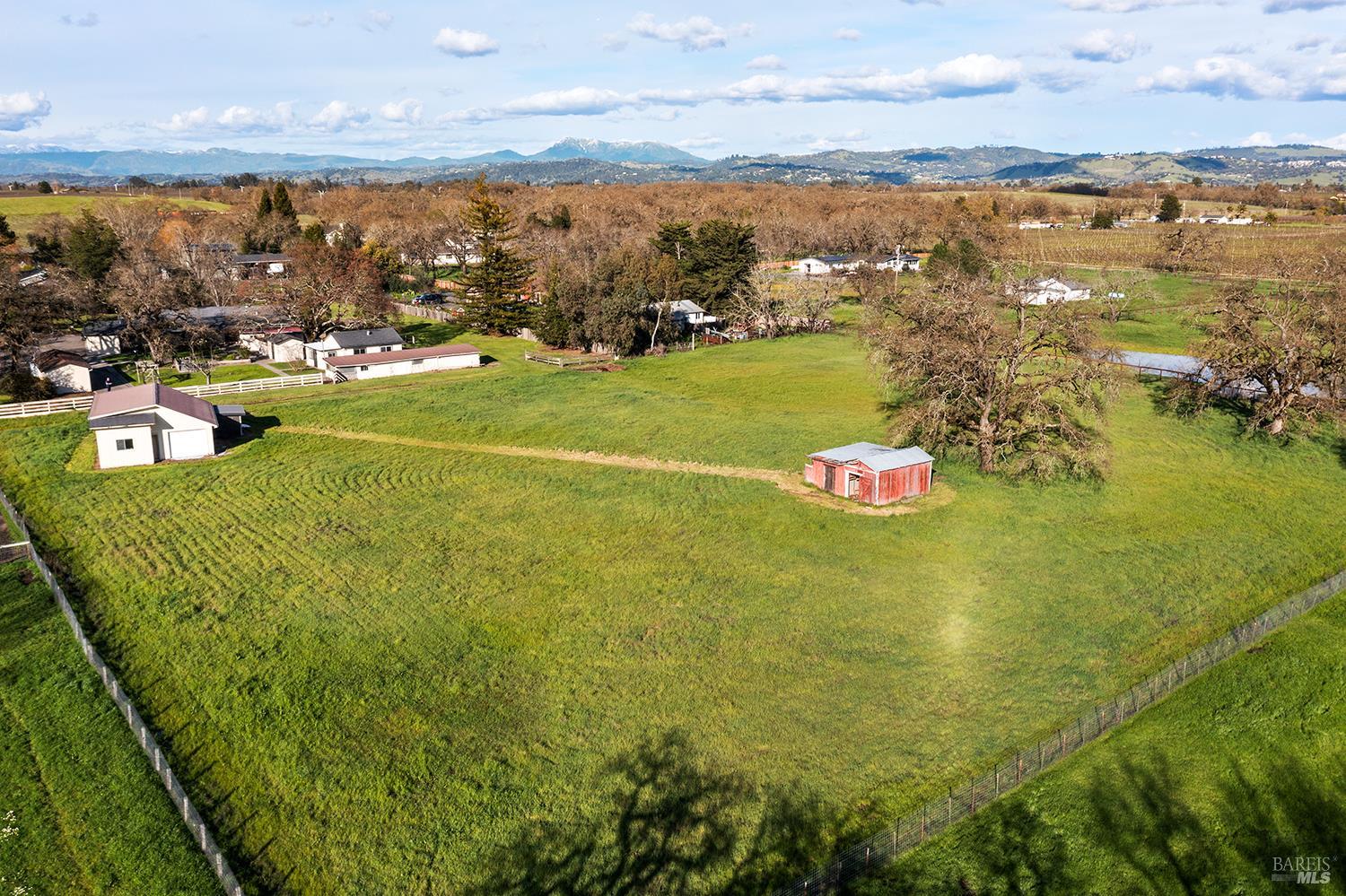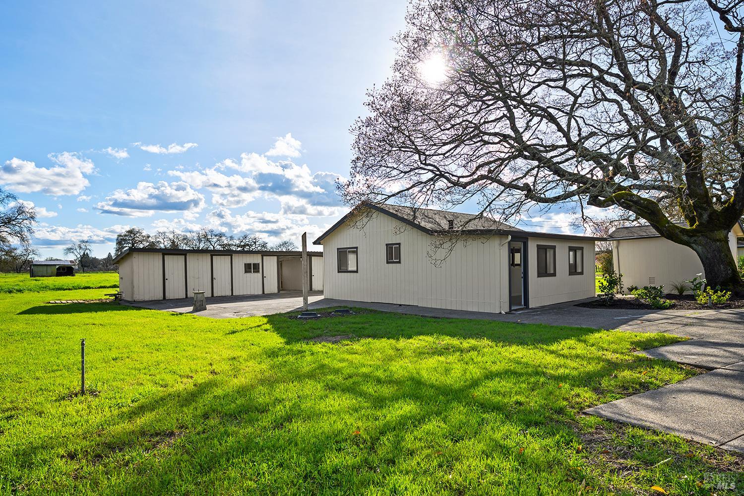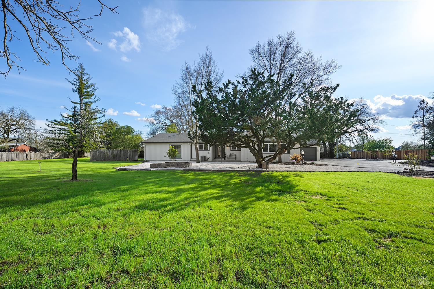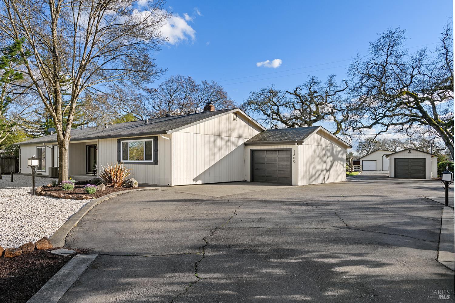 Set up for generational living, this beautifully refreshed sprawling single-story home is located at the end of a quiet country lane on 3.85+/- pristine acres. Set amidst majestic oaks, the main home as set up will accommodate two separate living situations, and then there is a detached finished flex space that can serve as an ideal home office, or could be guest quarters for the occasional visitor. There is a barn perfectly suited for the gentleman farmer, and two additional sizable outbuildings that could serve as car or RV storage, or even just as workshops. Horses, cows, goats or sheep would be happy on this level parcel in the middle of Sonoma County's premier Russian River Wine Country. This is peace and serenity at its finest close to all conveniences.