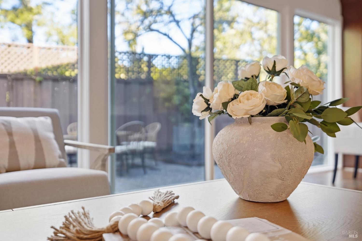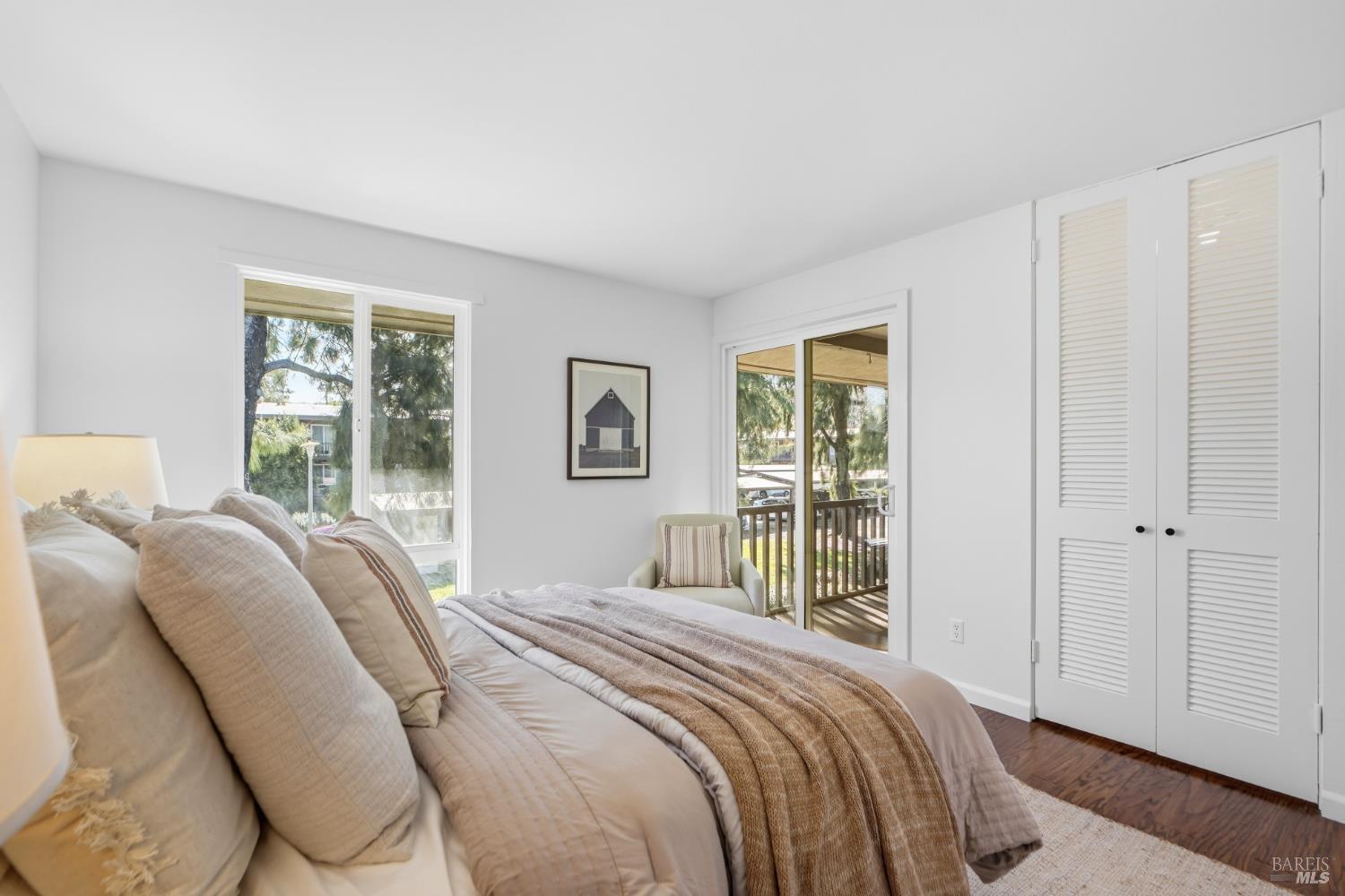 This beautifully updated end-unit condo in desirable Terra Linda offers comfort, style and an unbeatable location. This home is surrounded by mature trees and features a large private patio, ideal for outdoor dining, gardening or simply relaxing in your own peaceful retreat. Inside, you'll find fresh paint, newer dual-pane windows, solid core interior doors, upgraded AC, and a furnace for modern comfort and peace of mind. The inviting living area showcases custom built-in shelving, creating both character and functional storage. The kitchen is equipped with updated appliances, and a Nest thermostat for energy-conscious comfort year-round. Also on the main level is a recently updated bathroom. Upstairs, the primary bedroom includes a generous walk-in closet and an attached covered deck to enjoy warm evenings or morning coffee. Two additional bedrooms, an updated bathroom with a double vanity sink and washer and dryer are also conveniently located upstairs for everyday ease. This well-maintained community offers fantastic amenities including three swimming pools, tennis courts, EV chargers, beautifully landscaped grounds, a dedicated covered parking spot and tons of guest parking. Located near trails, shopping, Scotty's Market, easy highway access, and within the Miller Creek School District, this home combines lifestyle and practicality.