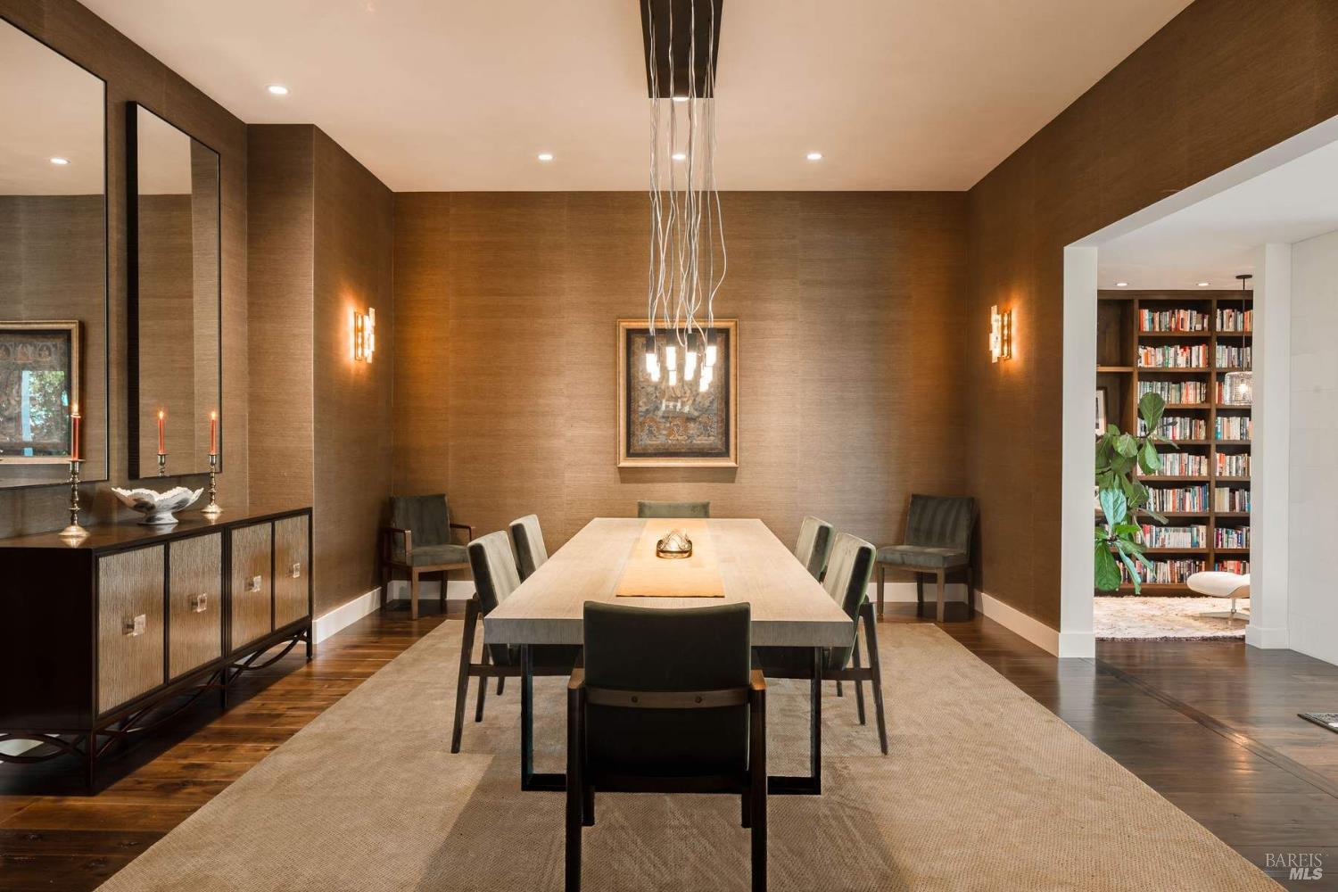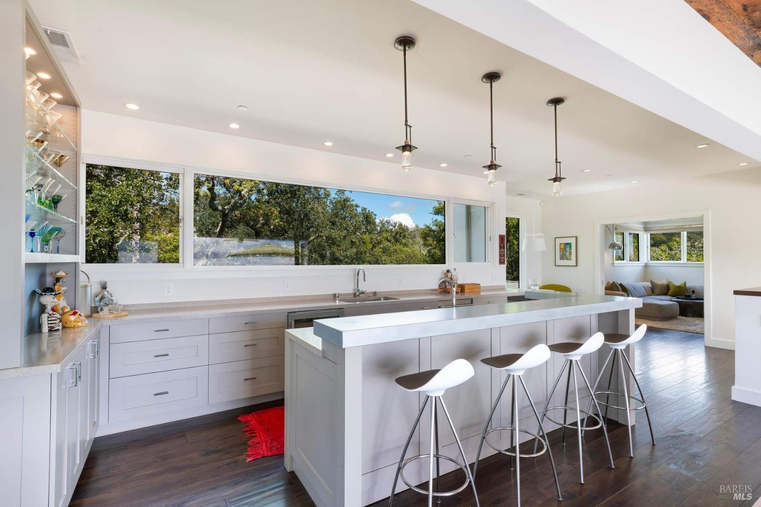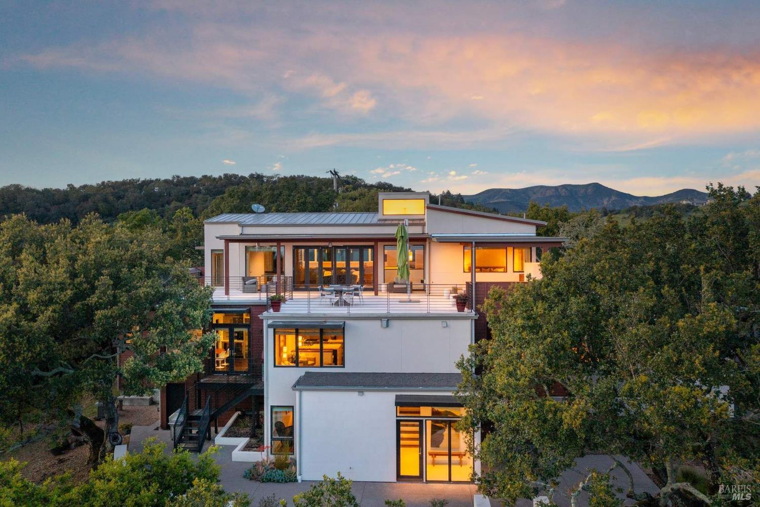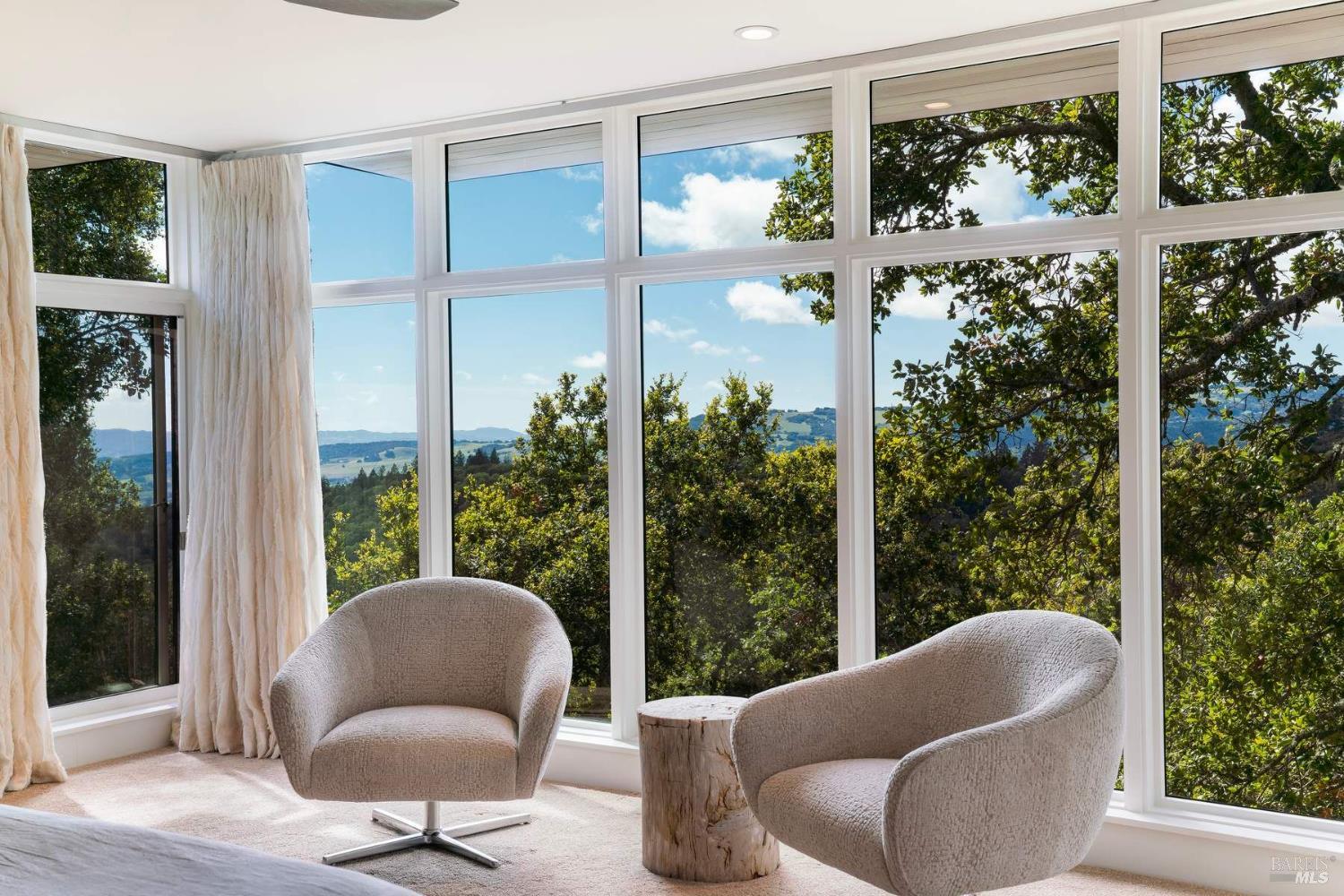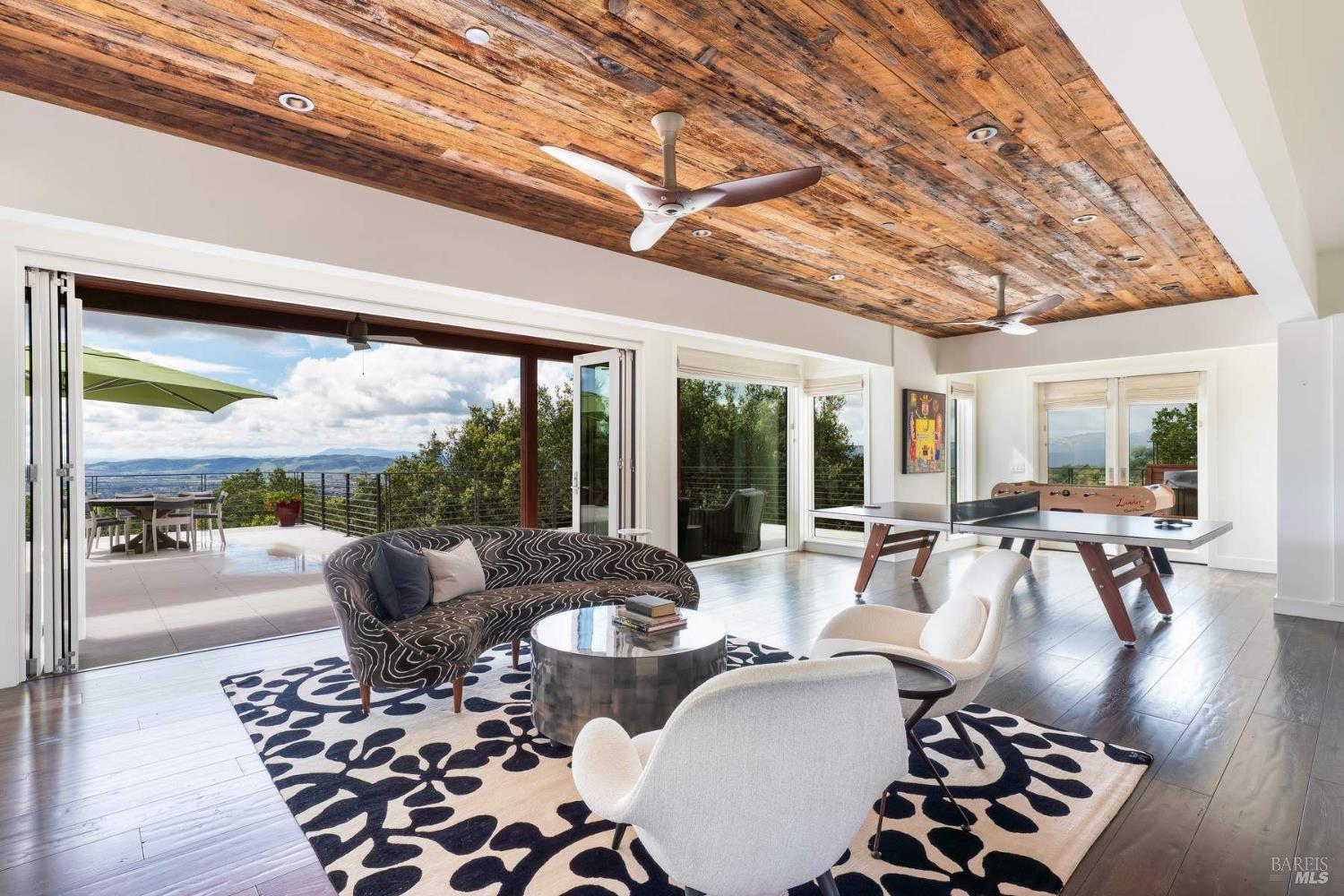 Just minutes from Sonoma Plaza, this contemporary estate spans approximately 15 acres, offering a rare opportunity to experience modern luxury immersed in the breathtaking landscapes of Sonoma Valley. With uninterrupted panoramic views reaching to the San Francisco skyline, vast mountain ranges, and the region's legendary big sky, this property embodies refined wine country living. The residence, spanning approximately 6,500 square feet, is designed to celebrate light, volume, and connection. Expansive living and dining areas flow effortlessly together, creating a seamless balance between elegant entertaining and refined everyday life. The gourmet kitchenfeaturing state-of-the-art appliances, custom cabinetry, and a generous center islandserves as the vibrant social heart of the home. Three private bedroom suites each offer serene comfort and captivating views, while the primary suite indulges with a spa-inspired bath featuring a walk-in rain shower, dual vanities, and spacious dressing areas. Two elegant powder rooms complement the main living spaces. For leisure and entertainment, a dedicated media room and a game and lounge area with a full bar provide space for gathering. Oversized glass doors open to an expansive patio designed for starlit evenings, where a dramatic fireplace frames sweeping vistas from the Sonoma hills to the San Francisco skyline. A detached 1,697-square-foot studio with multiple office space and a half-bath offers remarkable versatility ideal for creative pursuits, professional use, or future conversion into a guest house or ADU. Resort-style amenities elevate the experience: a 40x20-foot pool with a 60-foot swim lane, water slide & cabana with half bath. Additional amenities include, hot tub, sauna, outdoor fire pit , temperature controlled wine cellar and a tennis court. An open meadow celebrates Sonoma's natural rhythm. Here, modern architecture and California landscape come together in harmony, a private retreat of light, space, and possibility, where every day feels like a world apart.