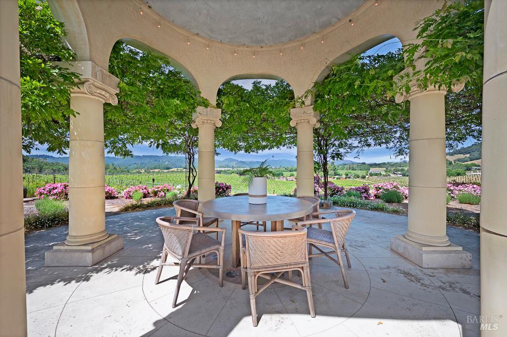 Perched atop a sun-kissed knoll in the rolling hills of Healdsburg just minutes from the famed Plaza, this breathtaking gated estate radiates the timeless romance of the Italian countryside. Sweeping 360 views of vine-draped valleys and golden hills create a setting straight from a Tuscan dream. The main residence is a harmonious blend of rustic charm and modern luxury, with warm stucco walls, clay tile roof, and stone paths winding through fragrant gardens and olive trees. Inside, soaring ceilings, a private elevator, butler's kitchen, and wine cellar evoke refined living. French doors open to patios perfect for dining under the stars, while the sparkling pool, spa, and full bath changing room invite leisurely afternoons. A 1-bedroom guest cottage offers serene vineyard views and private repose. Across 23.5 acres, life flourishes with vegetable and flower gardens, fruit trees, and two chicken coops. This is a place to gather, savor, and dream where every detail whispers romance, rooted in the heart of wine country.