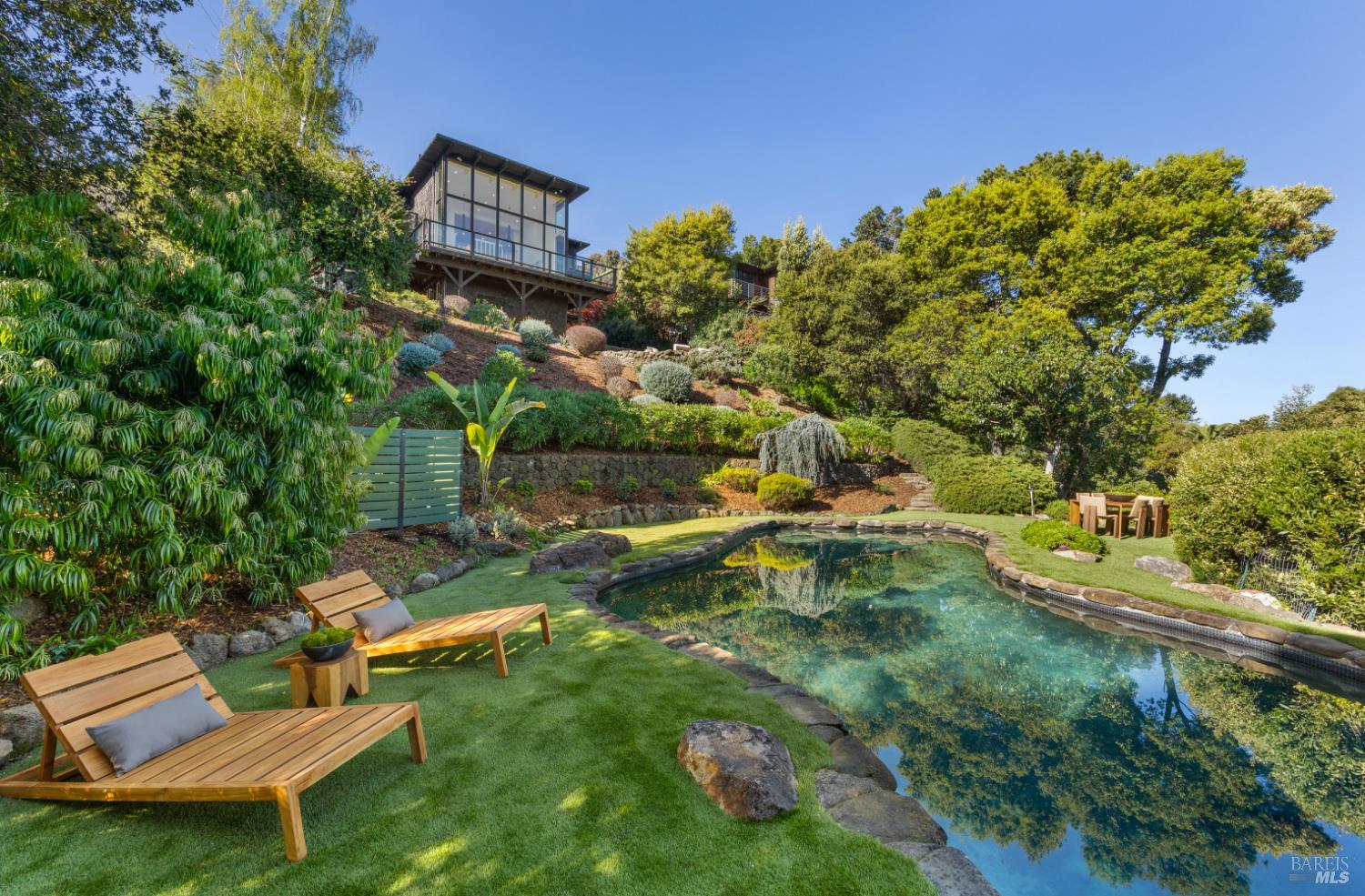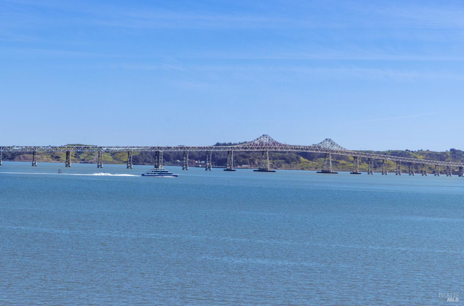 Set behind a private gate with sweeping bay views from nearly every room. Vacation at home on the Marin Bayshore with steps from your backyard leading down to the water. The architecturally stunning living room connects to the outdoors, creating an idyllic setting for both entertaining and everyday living. Soaring ceilings and dramatic floor-to-ceiling windows frame breathtaking views of the bay, while light hardwood floors, chic wicker pendants, and sliding doors leading to the deck create an airy, coastal feel. The updated kitchen features quartz countertops, a center island, high-end stainless steel appliances, and a breakfast nook with built-in bench seating. A versatile family room on the main level opens to a covered deck and includes a stylish half bath. Upstairs, the landing overlooks captivating bay and bridge views and leads to the private primary suite and two oversized bedrooms. The primary features a view deck, a walk-in closet, and a beautifully remodeled bath with heated floors, dual sinks, a soaking tub, and a shower. Lower level fitness room or office with exterior access. The outdoors feature meandering pathways, turf lawns, a patio, and a striking pool overlooking the bay. Rare waterfront setting only minutes to Ring Mountain Open Space.