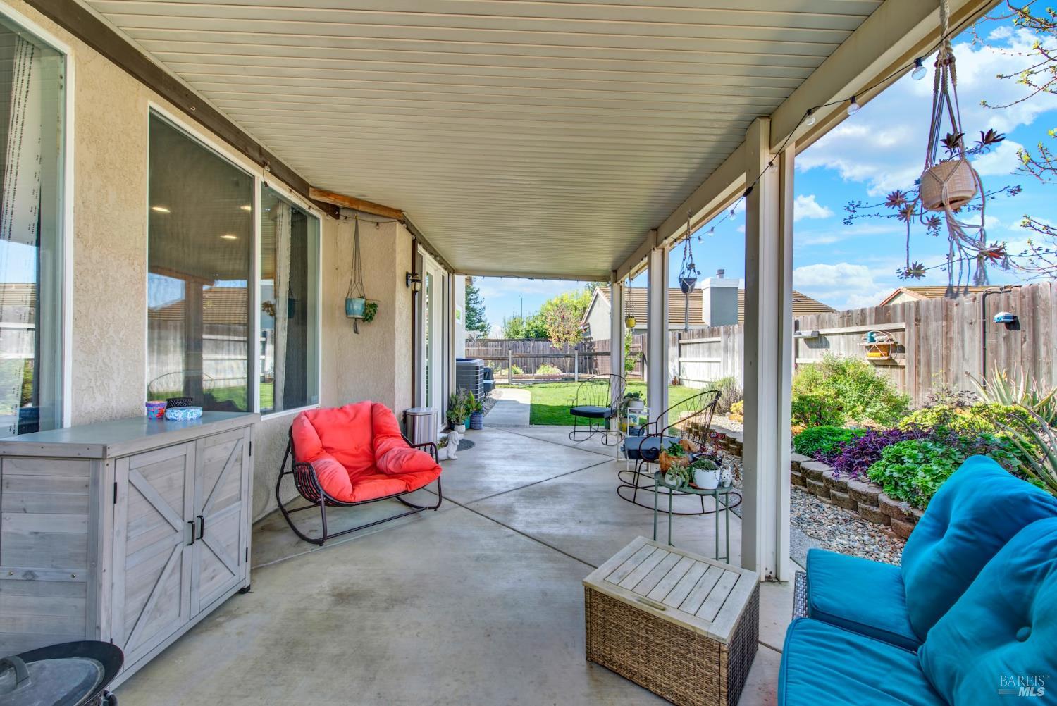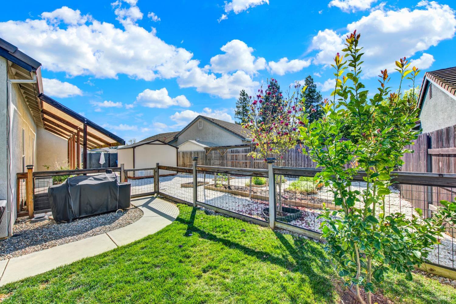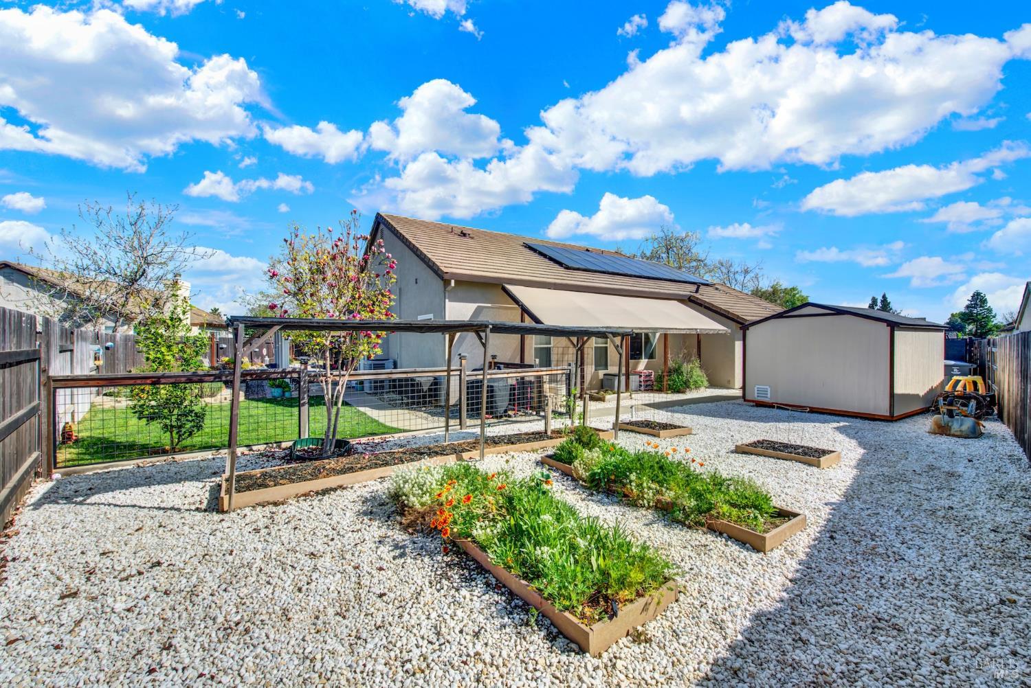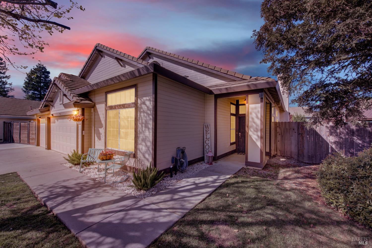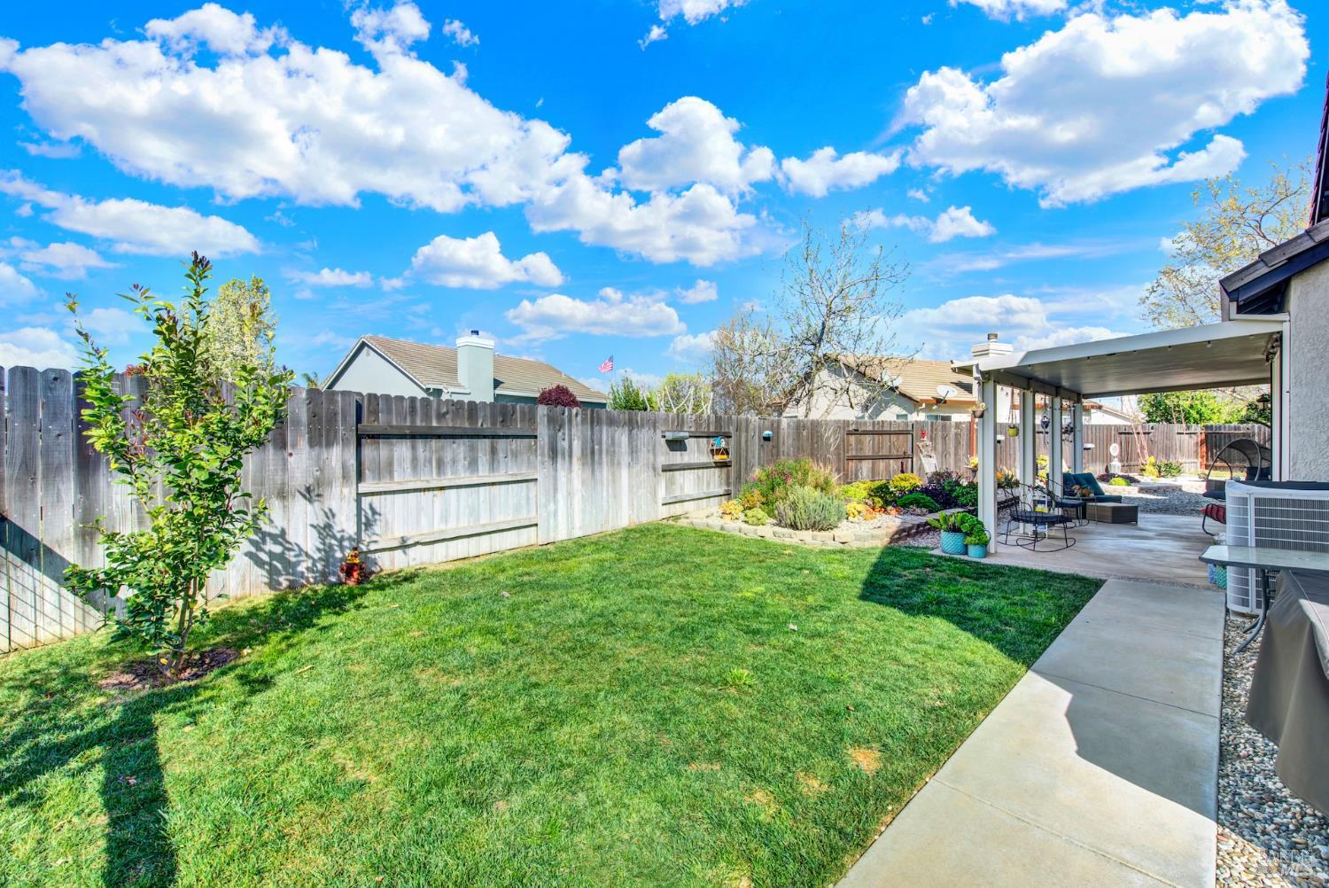 Discover this beautiful single-story home featuring a bright and open floor plan with soaring 10-foot ceilings that create a spacious and inviting feel. Updated plank flooring flows through much of the home, adding warmth and modern style throughout the living areas. The sunny eat-in kitchen opens directly to the family room, making it perfect for everyday living and entertaining. A cozy fireplace provides a welcoming focal point for relaxing evenings at home. Additional highlights include owned solar, dual-pane windows, tile flooring in the kitchen and bathrooms, and a spacious three-car garage. The property also offers possible RV parking for added convenience. Step outside to an oversized backyard with a covered patio that's ideal for entertaining guests or enjoying outdoor dining. The yard also features raised garden beds and cozy pergola, while still leaving plenty of room for your own creativity and future possibilities. Close to shopping, dining and freeway access.