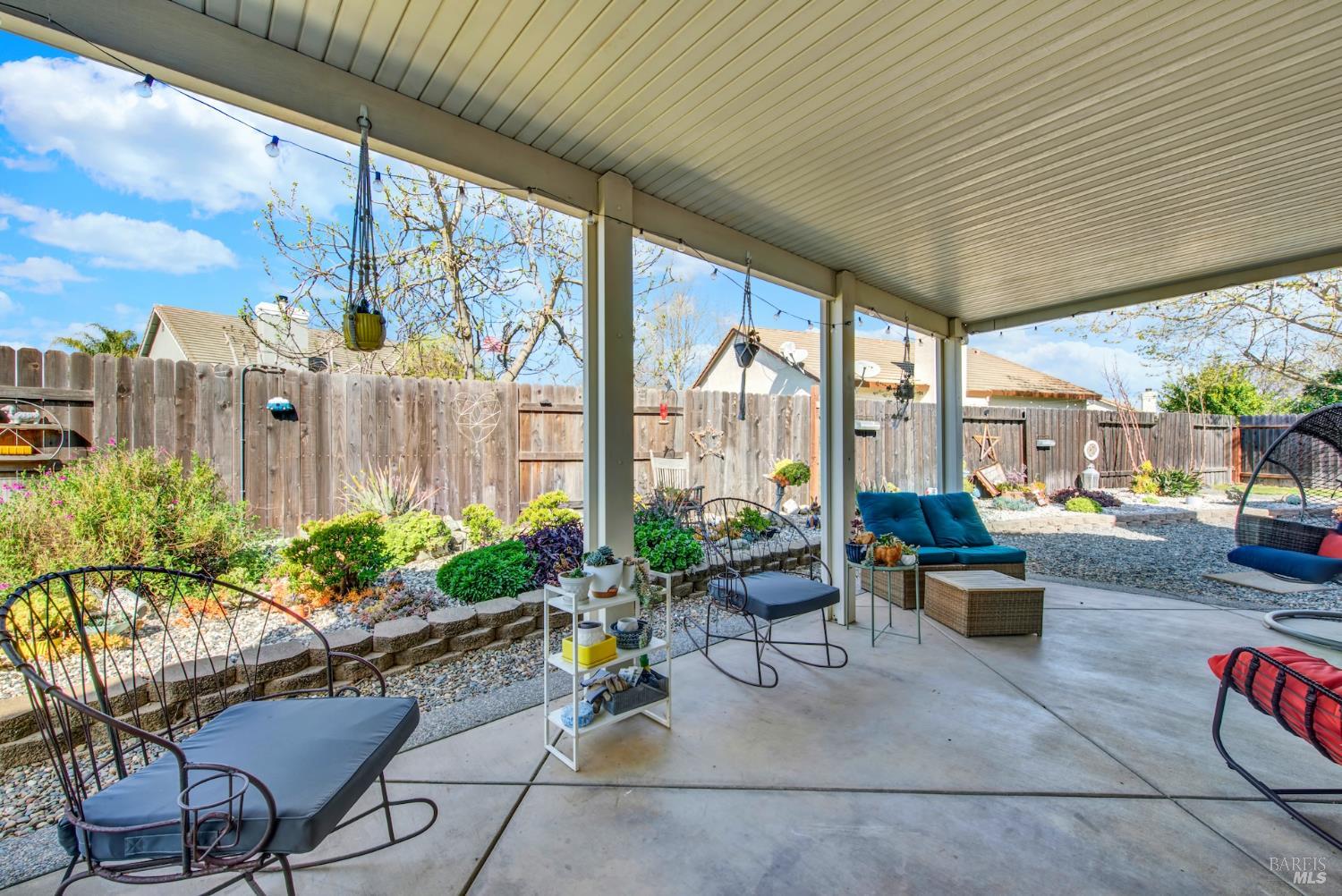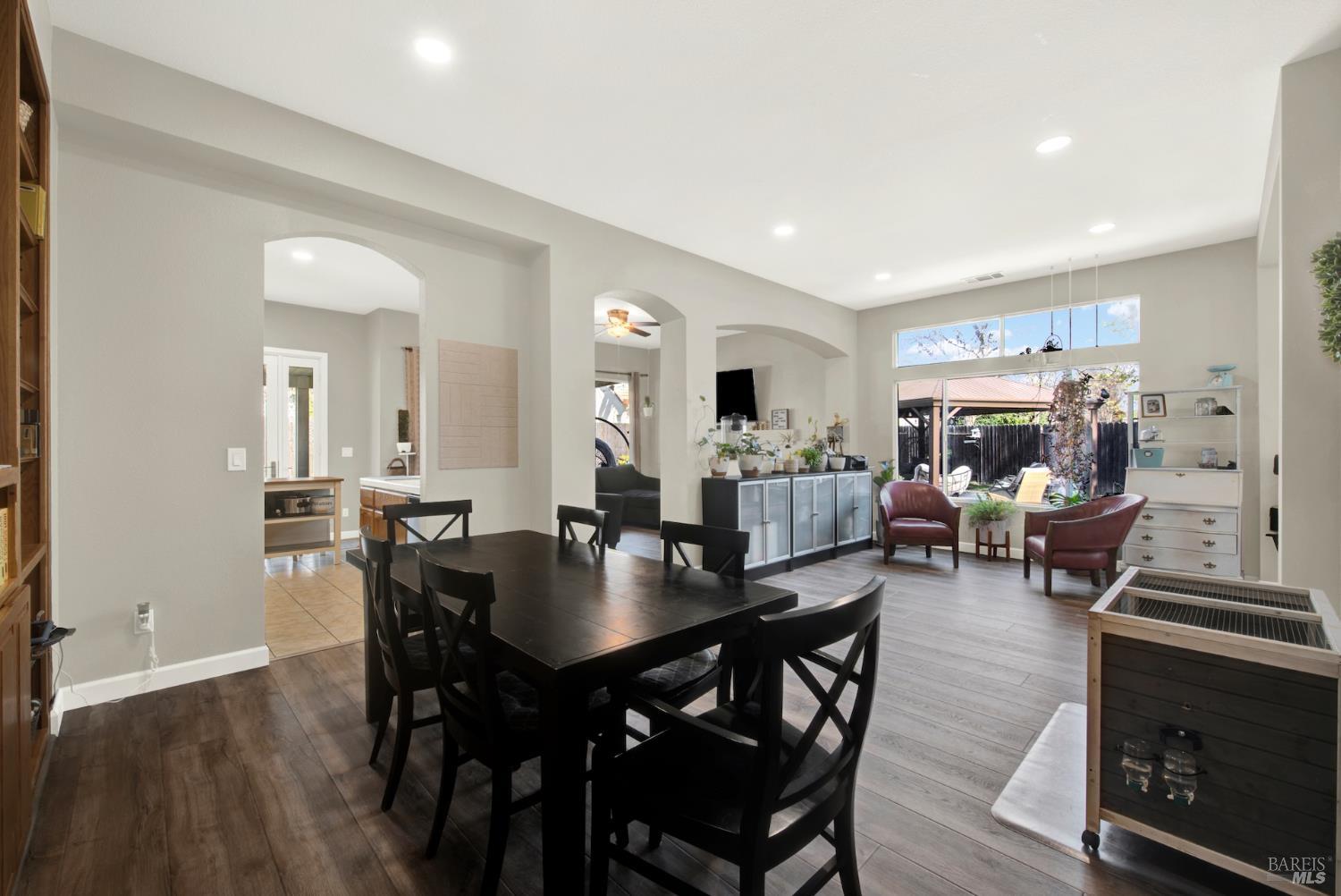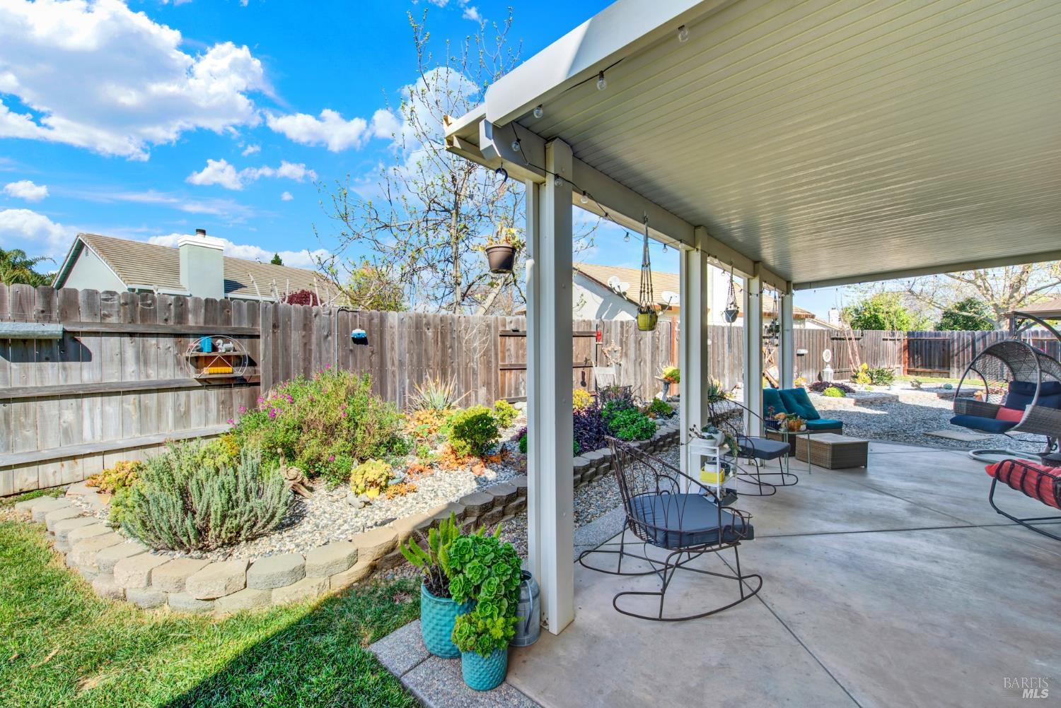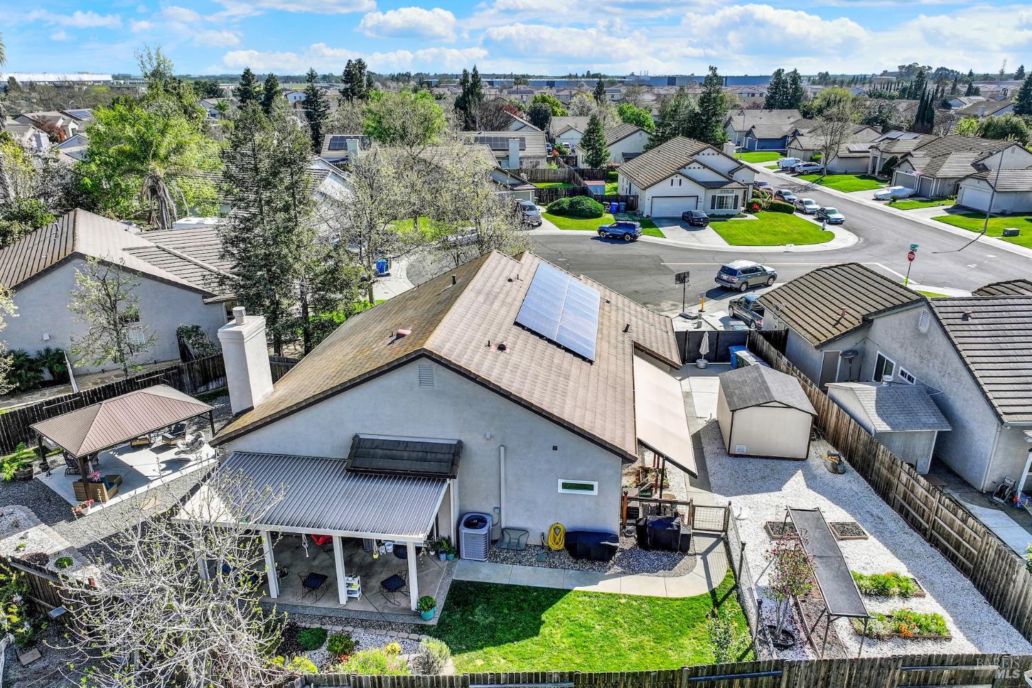 Discover this beautiful single-story home featuring a bright and open floor plan with soaring 10-foot ceilings that create a spacious and inviting feel. Updated plank flooring flows through much of the home, adding warmth and modern style throughout the living areas. The sunny eat-in kitchen opens directly to the family room, making it perfect for everyday living and entertaining. A cozy fireplace provides a welcoming focal point for relaxing evenings at home. Additional highlights include owned solar, dual-pane windows, tile flooring in the kitchen and bathrooms, and a spacious three-car garage. The property also offers possible RV parking for added convenience. Step outside to an oversized backyard with a covered patio that's ideal for entertaining guests or enjoying outdoor dining. The yard also features raised garden beds and cozy pergola, while still leaving plenty of room for your own creativity and future possibilities. Close to shopping, dining and freeway access.