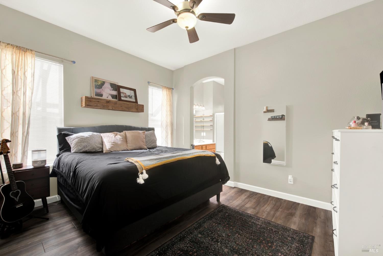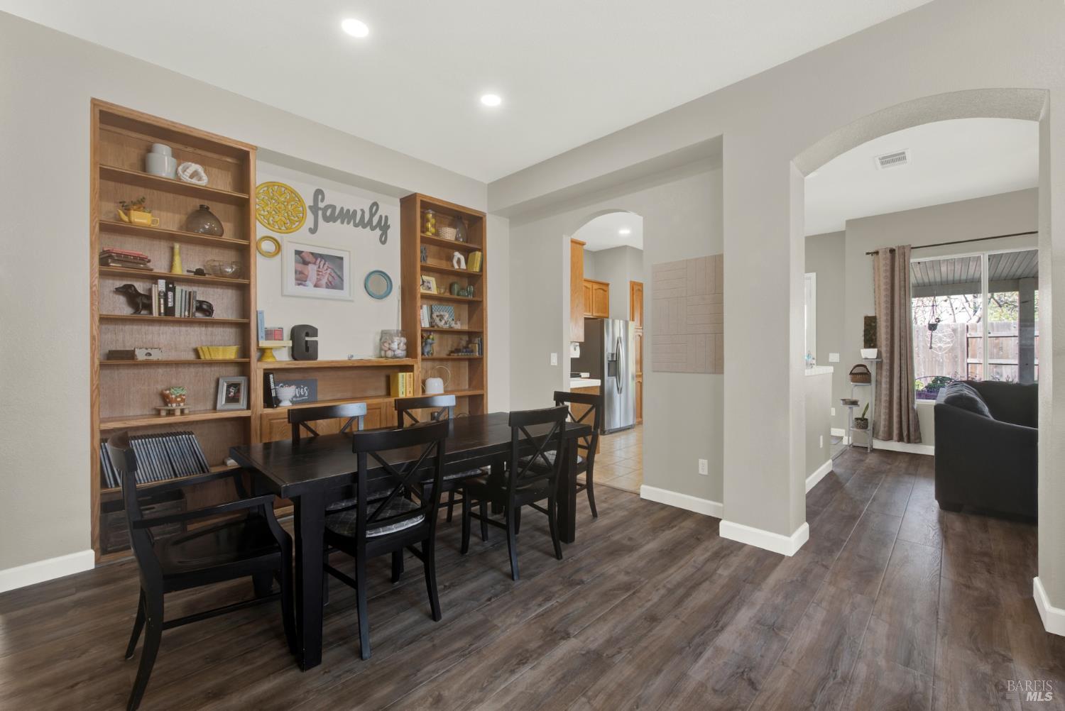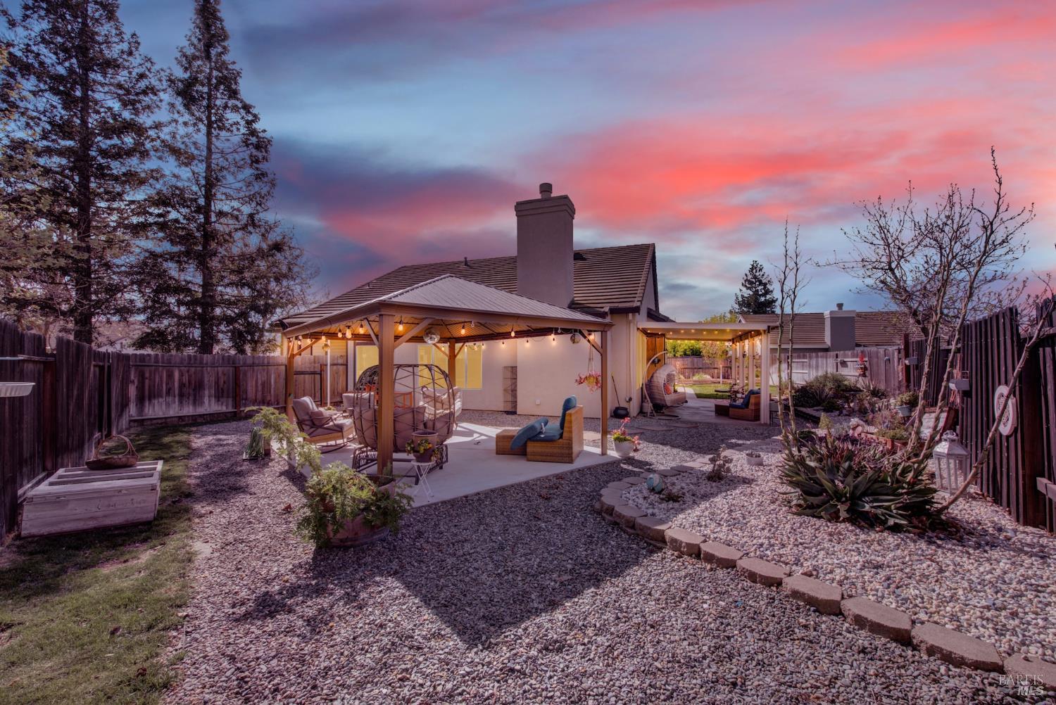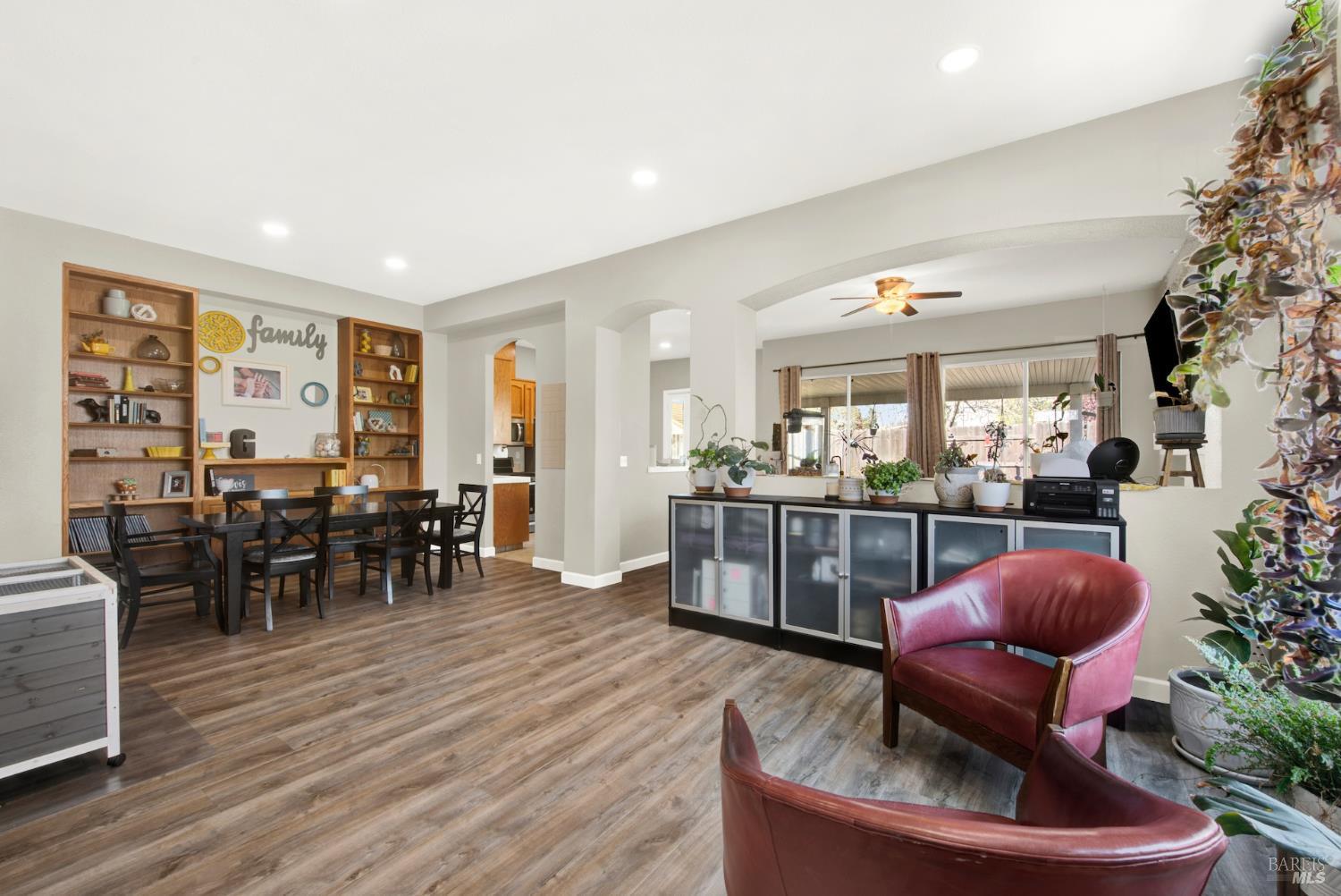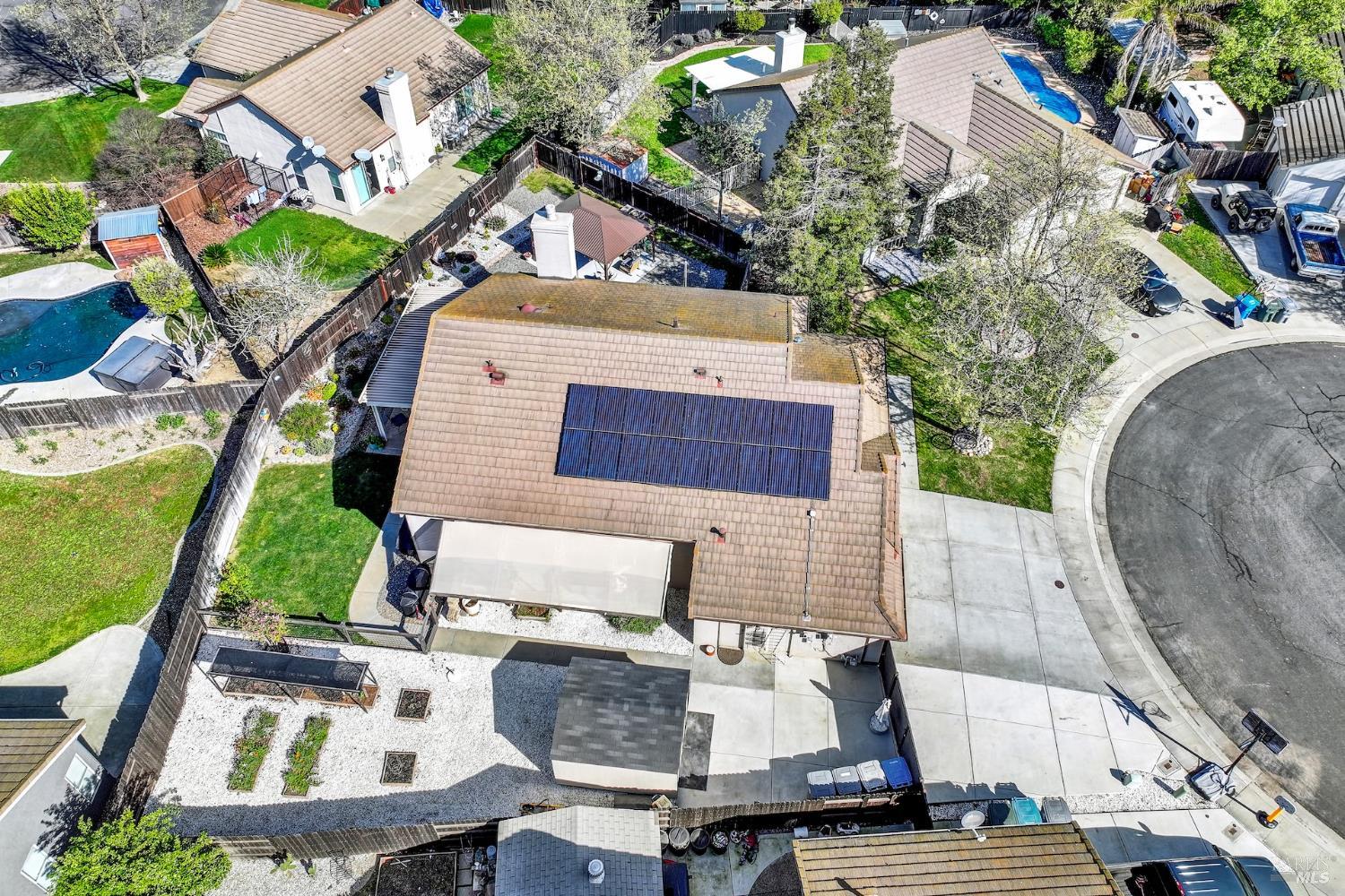 Discover this beautiful single-story home featuring a bright and open floor plan with soaring 10-foot ceilings that create a spacious and inviting feel. Updated plank flooring flows through much of the home, adding warmth and modern style throughout the living areas. The sunny eat-in kitchen opens directly to the family room, making it perfect for everyday living and entertaining. A cozy fireplace provides a welcoming focal point for relaxing evenings at home. Additional highlights include owned solar, dual-pane windows, tile flooring in the kitchen and bathrooms, and a spacious three-car garage. The property also offers possible RV parking for added convenience. Step outside to an oversized backyard with a covered patio that's ideal for entertaining guests or enjoying outdoor dining. The yard also features raised garden beds and cozy pergola, while still leaving plenty of room for your own creativity and future possibilities. Close to shopping, dining and freeway access.