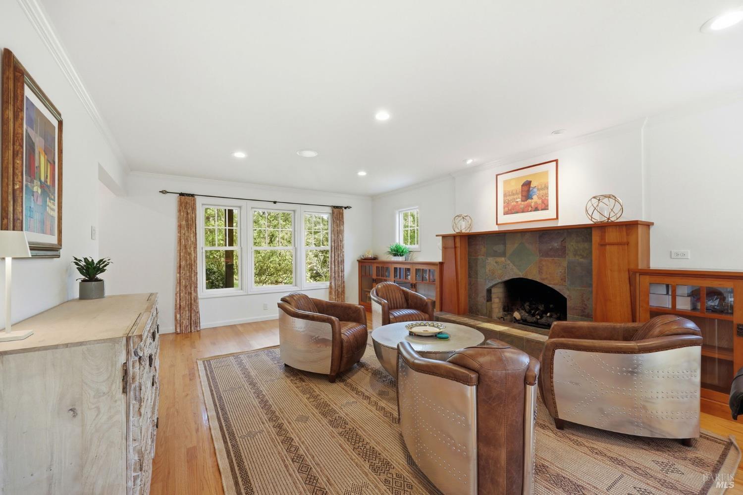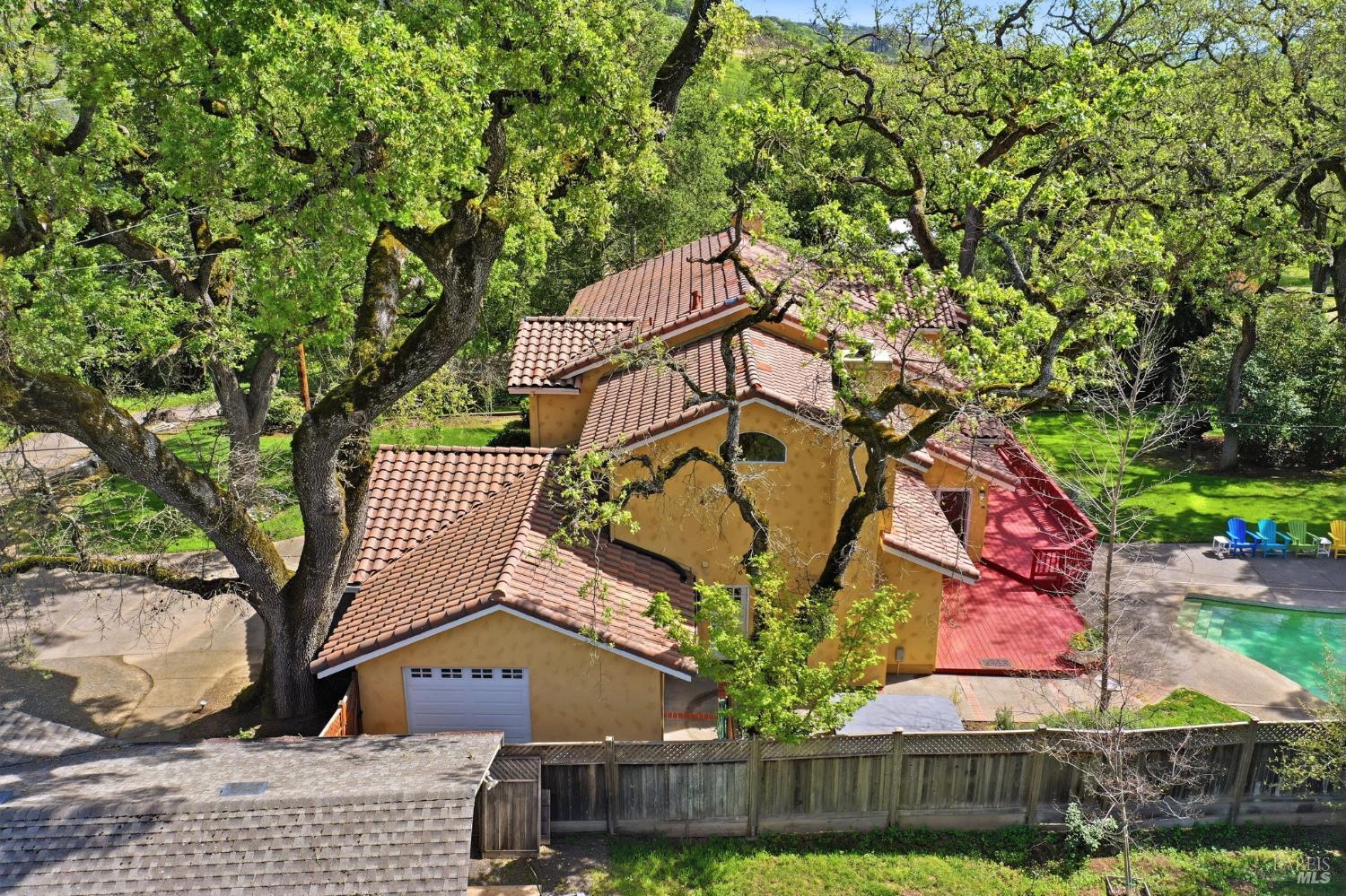 Poised on the edge of Sonoma's legendary Valley of the Moon, this extensively remodeled and expanded Tuscan-style residence (rebuilt in 2003) offers timeless sophistication and effortless casual Sonoma County living! Tucked among mature oak trees on over a half an acre, the parcel offers a rare sense of privacy and tranquility while just minutes from the conveniences of Santa Rosa. Light-filled interiors capture sweeping views of trees and surrounding vineyards, creating a peaceful spa-like feeling! The home's inviting interior balances warmth and elegance with rich hardwood floors, two fireplaces, and thoughtfully designed living spaces that flow seamlessly from one room to the next. Custom built-in bookcases, entertainment cabinetry and cozy study nooks add both charm and functionality throughout. At the heart of the home, the chef's kitchen is designed for both everyday living and memorable gatherings. Premium appliances include a Viking six-burner gas range, KitchenAid dual wall oven with microwave, Sub-Zero built-in refrigerator, and a Sub-Zero 132-bottle dual-zone wine refrigerator, an ideal complement to life in Wine Country. The expansive primary suite offers privacy with a generously sized bedroom, walk-in closet with custom organizers and drawers and a spa-inspired bath featuring a soaking Jacuzzi tub and elegant travertine shower. Upstairs Media Retreat could also function as the 4th bedroom. Updated energy-efficient LED lighting throughout enhances the home's warm ambiance while multiple living areas and flexible workspace including a dedicated downstairs office that can serve as a guest suite provide comfort and versatility for modern living. Outdoor living is equally exceptional. Spacious decking overlooks lush lawns and a sparkling in-ground pool, while a separate poolside pavilion creates the ultimate entertaining setting with a gas BBQ, covered dining area with heater and indoor kitchenette for easy hosting. Surrounded by mature oaks and vineyard views, the property embraces the relaxed elegance of indoor-outdoor Wine Country living. Tidy 2 car garage + workshop bay w/roll top door. This is more than a home...it's your daily escape into tranquility, luxury, and the best of Northern California's wine country lifestyle!