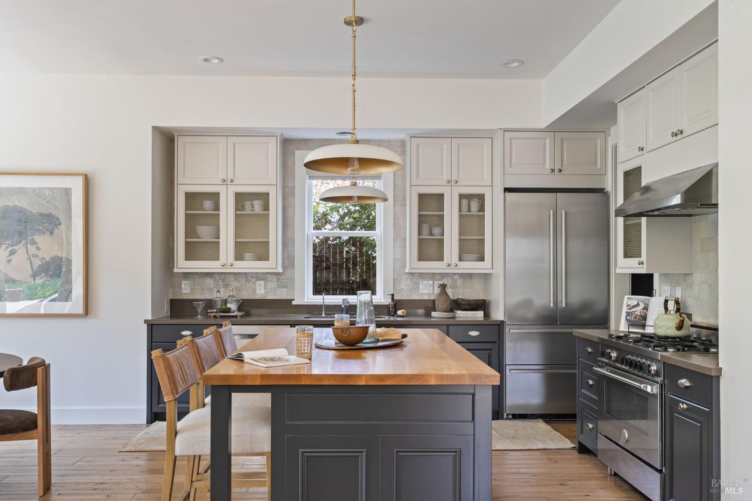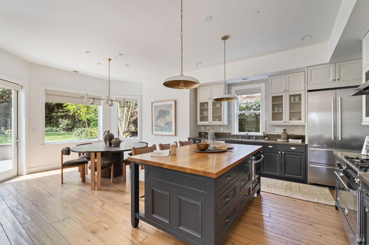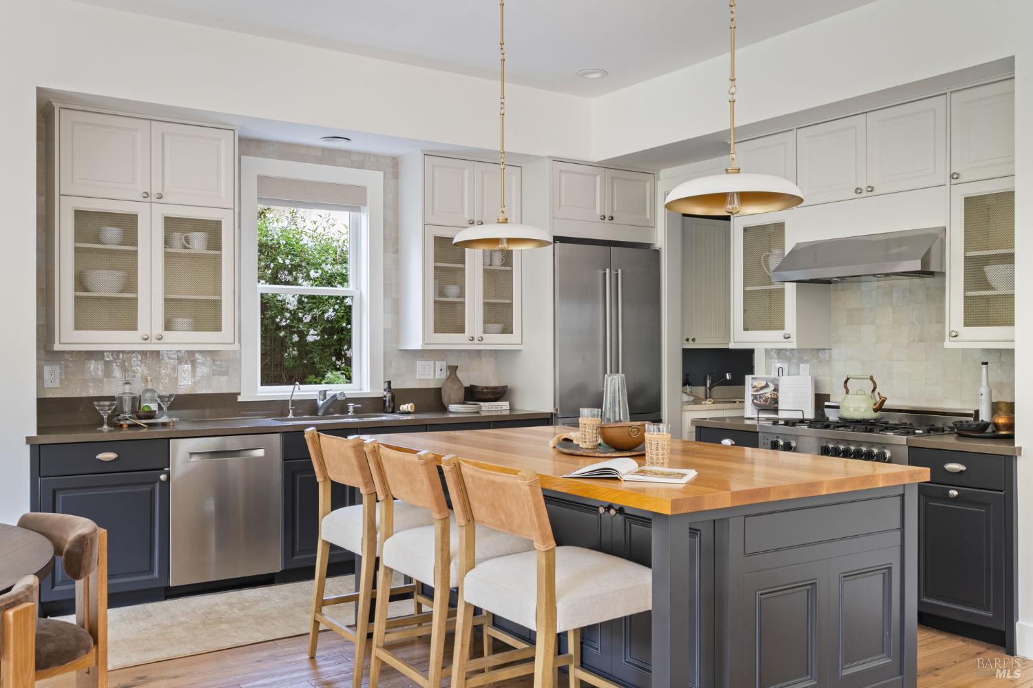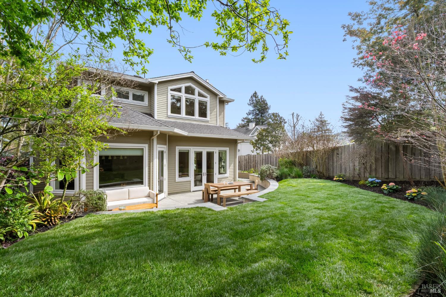 Located on a storybook corner in Corte Madera, 35 Palm captures timeless charm with classic curb appeal. Built in 2009 and thoughtfully remodeled, the home welcomes you with a white picket fence, a front porch framed by white-trimmed windows, and a quiet streetscape that feels both picturesque and inviting. Inside, hardwood floors run throughout generous living spaces bathed in natural light. Just off the entry, a cozy media room features floor-to-ceiling built-in bookshelves, while the main living room impresses with high ceilings, a rustic wood fireplace, and glass doors that open directly to the backyard. The kitchen serves as the heart of the home a large butcher block island with bar seating anchors the space, complemented by professional-grade appliances including a F.W. Bertazzoni gas range, Liebherr refrigerator, and dishwasher. An adjacent dining area creates easy flow for everyday meals or gatherings. Upstairs, the primary suite offers vaulted ceilings, treetop views, and outlooks toward the Corte Madera-Larkspur path. The en-suite bath includes a double-sink vanity, soaking tub, walk-in shower, and an organized walk-in closet. Three additional bedrooms, each with natural light and generous closet space, share a full bathroom with tub-over-shower. The sunny backyard is freshly landscaped with a paved patio ideal for outdoor dining, a flat lawn, and raised garden beds filled with herbs and vegetables. A meandering gravel lane leads directly to the Corte Madera-Larkspur path, where neighbors pass on walks, runs, and bike rides. The attached two-car garage is currently outfitted as a fully equipped workshop with floor-to-ceiling custom cabinetry, a rolling hook ladder, and a large central work table a highly versatile creative space. Living at 35 Palm offers the balance of neighborhood charm and everyday convenience that defines Corte Madera. Parks, schools, and local restaurants are just a short distance away, and the broader Marin community is always within easy reach. From morning rides along the path to evenings dining in nearby Larkspur, the lifestyle here is grounded in nature, community, and the easy rhythm of Marin living.