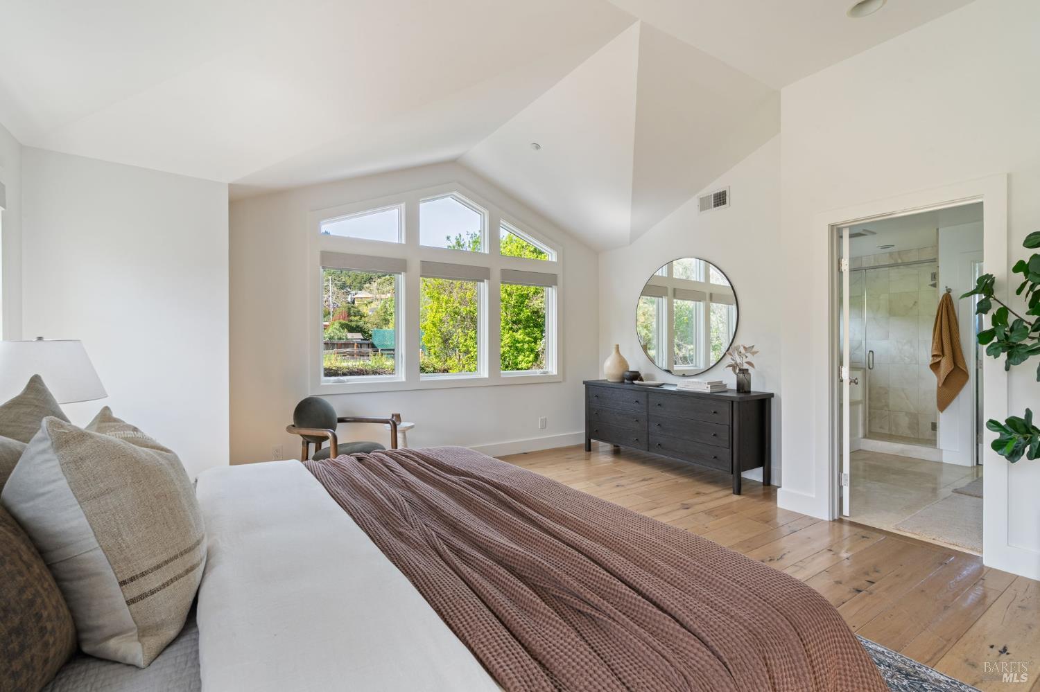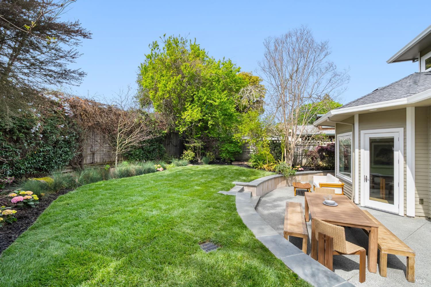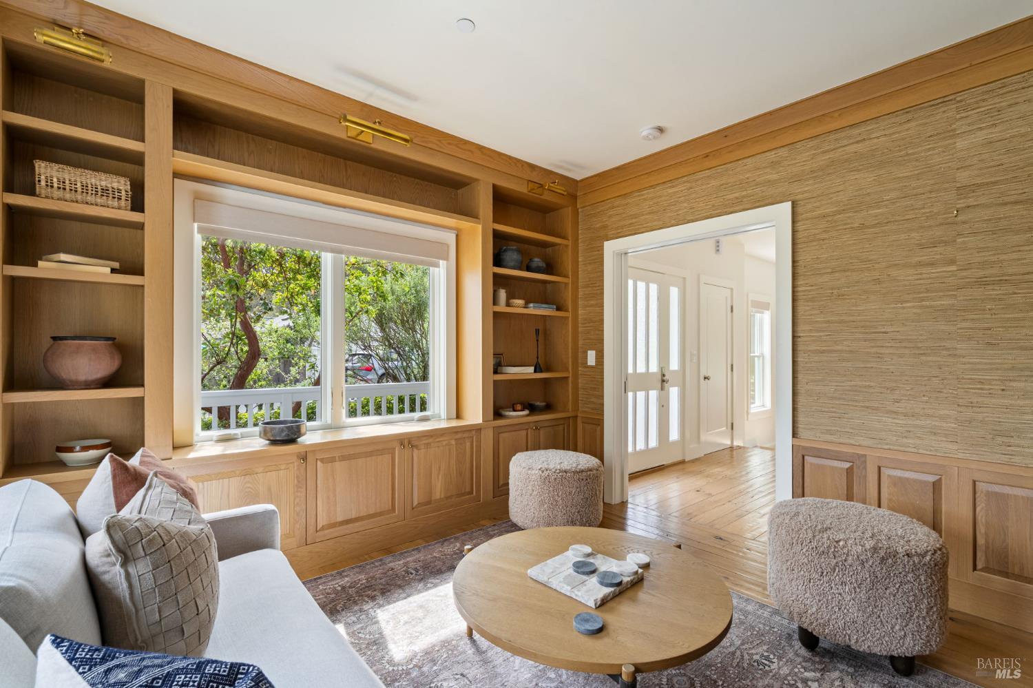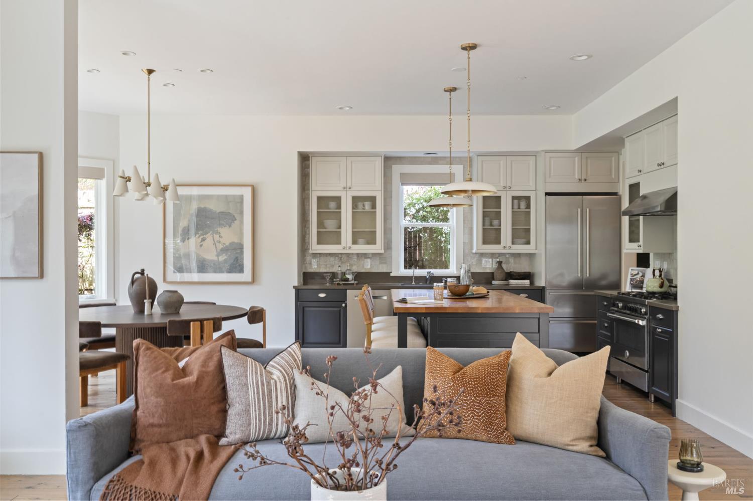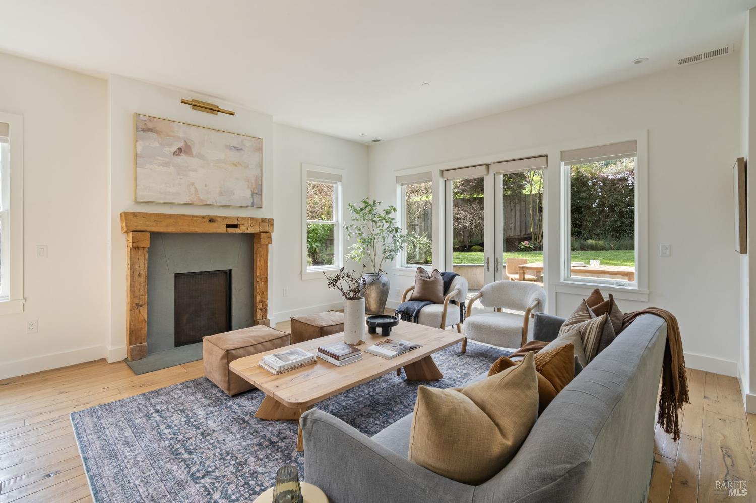 Located on a storybook corner in Corte Madera, 35 Palm captures timeless charm with classic curb appeal. Built in 2009 and thoughtfully remodeled, the home welcomes you with a white picket fence, a front porch framed by white-trimmed windows, and a quiet streetscape that feels both picturesque and inviting. Inside, hardwood floors run throughout generous living spaces bathed in natural light. Just off the entry, a cozy media room features floor-to-ceiling built-in bookshelves, while the main living room impresses with high ceilings, a rustic wood fireplace, and glass doors that open directly to the backyard. The kitchen serves as the heart of the home a large butcher block island with bar seating anchors the space, complemented by professional-grade appliances including a F.W. Bertazzoni gas range, Liebherr refrigerator, and dishwasher. An adjacent dining area creates easy flow for everyday meals or gatherings. Upstairs, the primary suite offers vaulted ceilings, treetop views, and outlooks toward the Corte Madera-Larkspur path. The en-suite bath includes a double-sink vanity, soaking tub, walk-in shower, and an organized walk-in closet. Three additional bedrooms, each with natural light and generous closet space, share a full bathroom with tub-over-shower. The sunny backyard is freshly landscaped with a paved patio ideal for outdoor dining, a flat lawn, and raised garden beds filled with herbs and vegetables. A meandering gravel lane leads directly to the Corte Madera-Larkspur path, where neighbors pass on walks, runs, and bike rides. The attached two-car garage is currently outfitted as a fully equipped workshop with floor-to-ceiling custom cabinetry, a rolling hook ladder, and a large central work table a highly versatile creative space. Living at 35 Palm offers the balance of neighborhood charm and everyday convenience that defines Corte Madera. Parks, schools, and local restaurants are just a short distance away, and the broader Marin community is always within easy reach. From morning rides along the path to evenings dining in nearby Larkspur, the lifestyle here is grounded in nature, community, and the easy rhythm of Marin living.