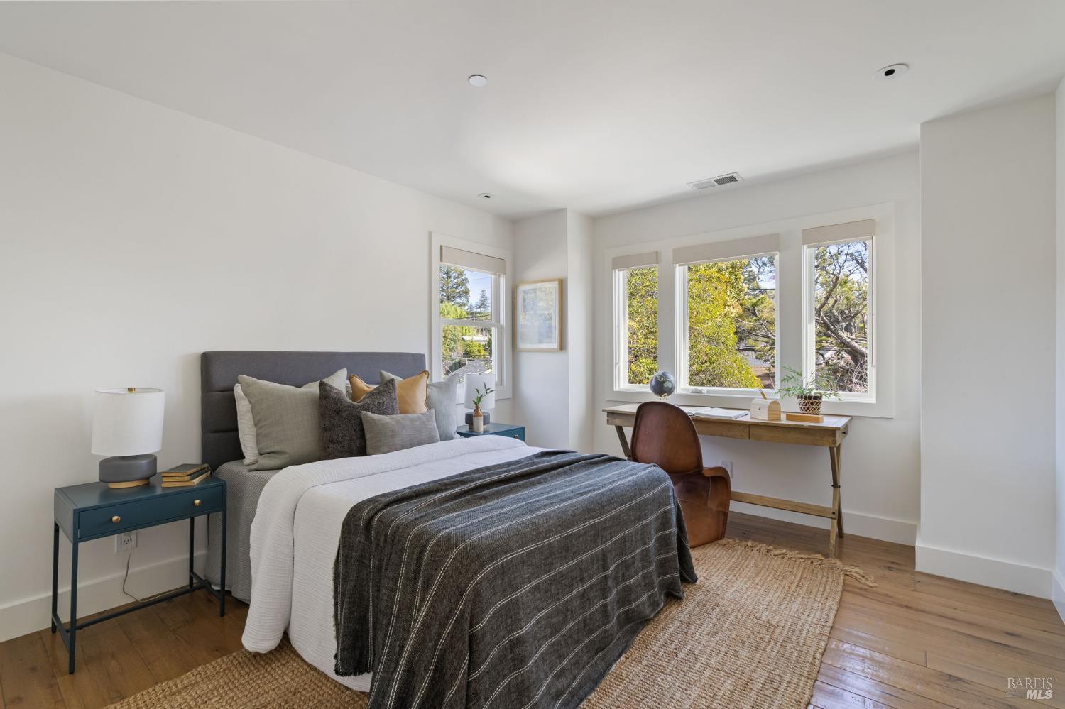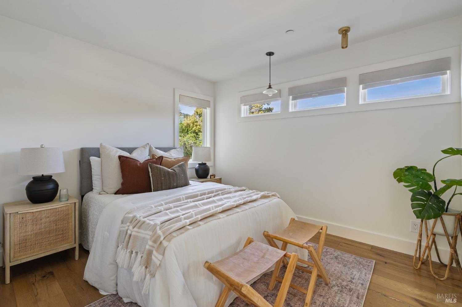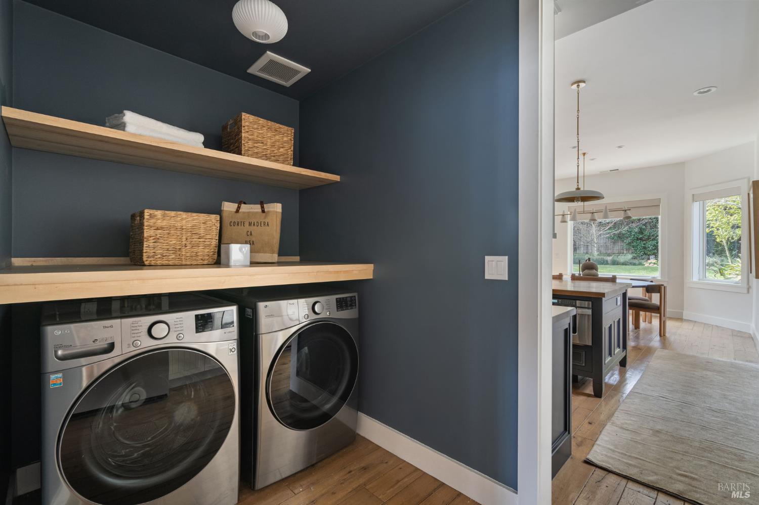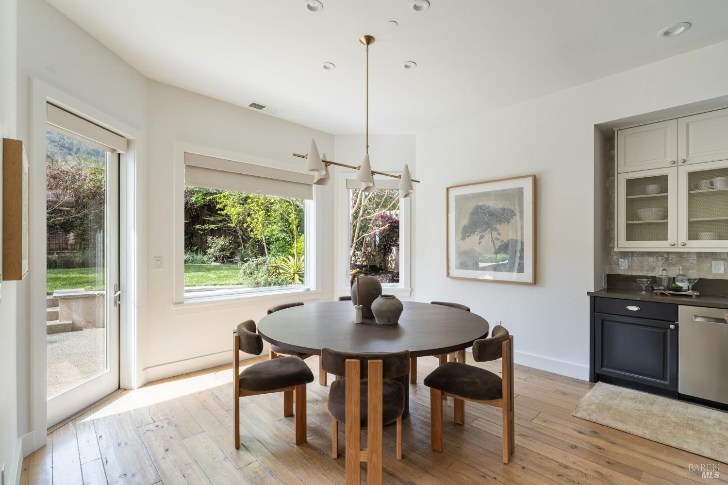 Located on a storybook corner in Corte Madera, 35 Palm captures timeless charm with classic curb appeal. Built in 2009 and thoughtfully remodeled, the home welcomes you with a white picket fence, a front porch framed by white-trimmed windows, and a quiet streetscape that feels both picturesque and inviting. Inside, hardwood floors run throughout generous living spaces bathed in natural light. Just off the entry, a cozy media room features floor-to-ceiling built-in bookshelves, while the main living room impresses with high ceilings, a rustic wood fireplace, and glass doors that open directly to the backyard. The kitchen serves as the heart of the home a large butcher block island with bar seating anchors the space, complemented by professional-grade appliances including a F.W. Bertazzoni gas range, Liebherr refrigerator, and dishwasher. An adjacent dining area creates easy flow for everyday meals or gatherings. Upstairs, the primary suite offers vaulted ceilings, treetop views, and outlooks toward the Corte Madera-Larkspur path. The en-suite bath includes a double-sink vanity, soaking tub, walk-in shower, and an organized walk-in closet. Three additional bedrooms, each with natural light and generous closet space, share a full bathroom with tub-over-shower. The sunny backyard is freshly landscaped with a paved patio ideal for outdoor dining, a flat lawn, and raised garden beds filled with herbs and vegetables. A meandering gravel lane leads directly to the Corte Madera-Larkspur path, where neighbors pass on walks, runs, and bike rides. The attached two-car garage is currently outfitted as a fully equipped workshop with floor-to-ceiling custom cabinetry, a rolling hook ladder, and a large central work table a highly versatile creative space. Living at 35 Palm offers the balance of neighborhood charm and everyday convenience that defines Corte Madera. Parks, schools, and local restaurants are just a short distance away, and the broader Marin community is always within easy reach. From morning rides along the path to evenings dining in nearby Larkspur, the lifestyle here is grounded in nature, community, and the easy rhythm of Marin living.