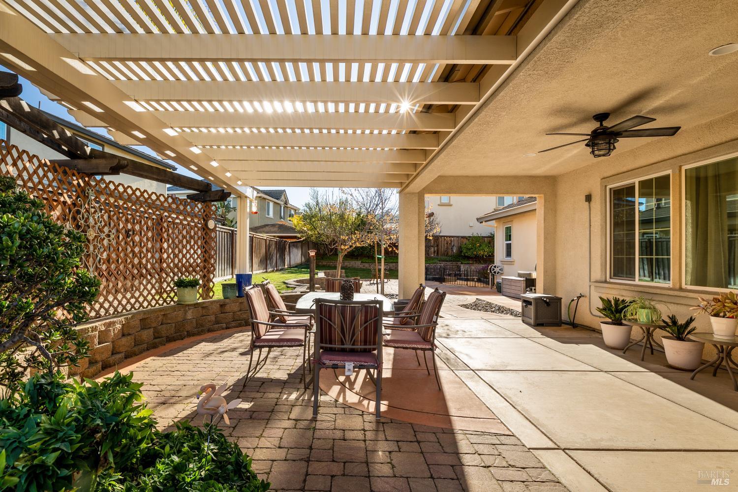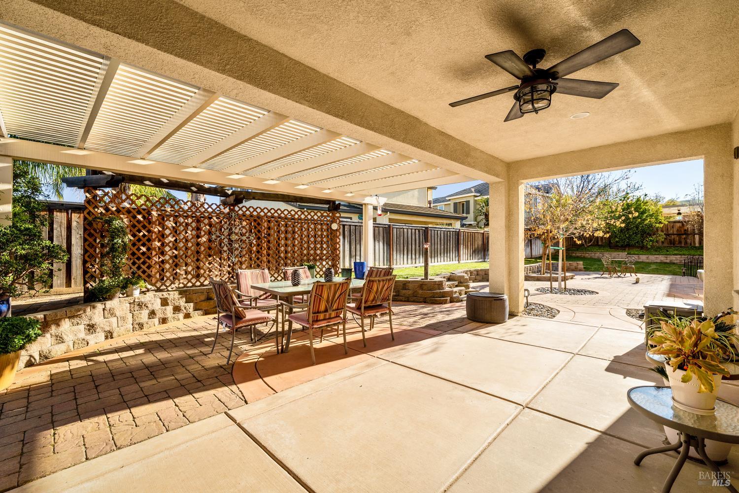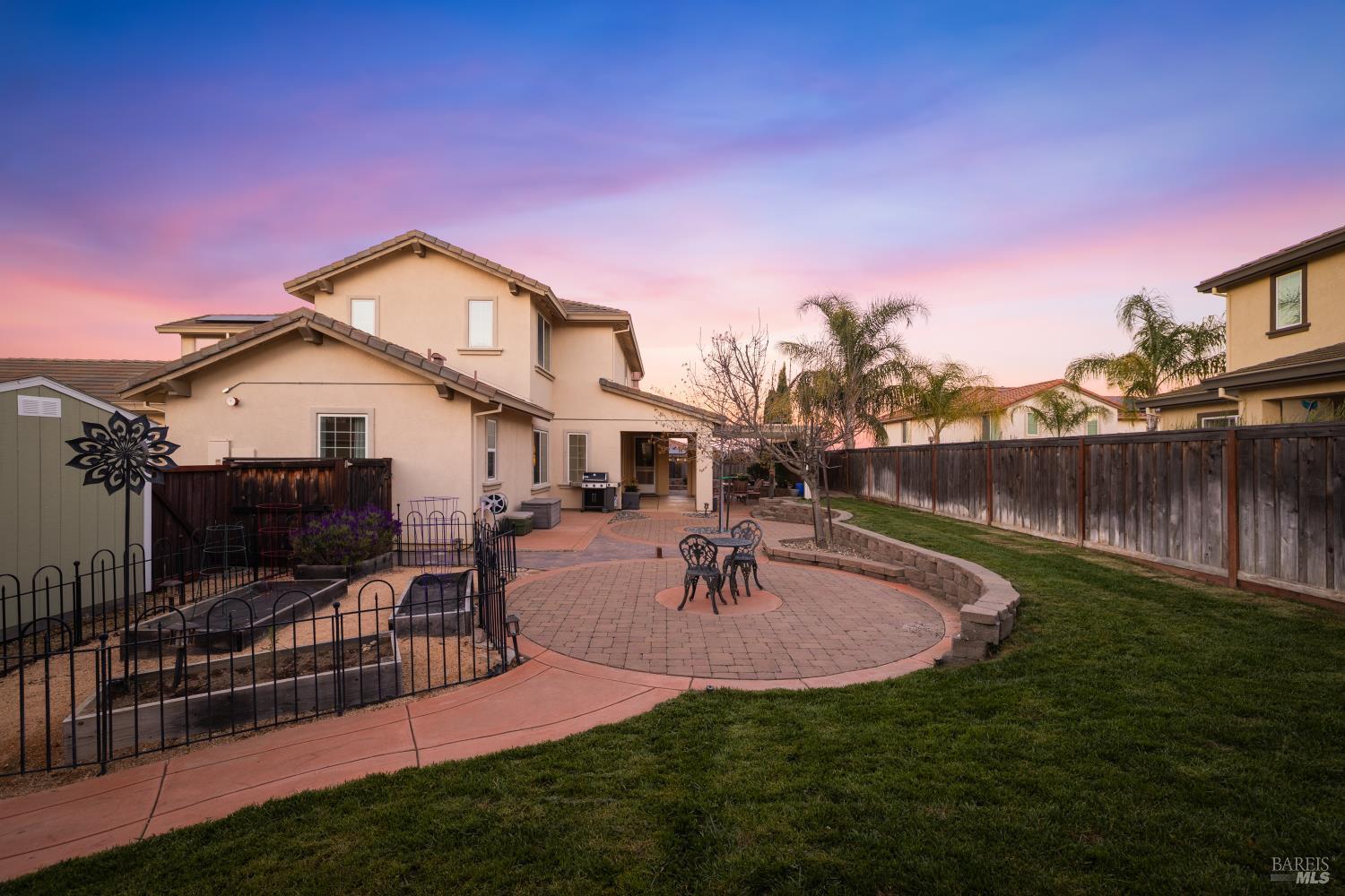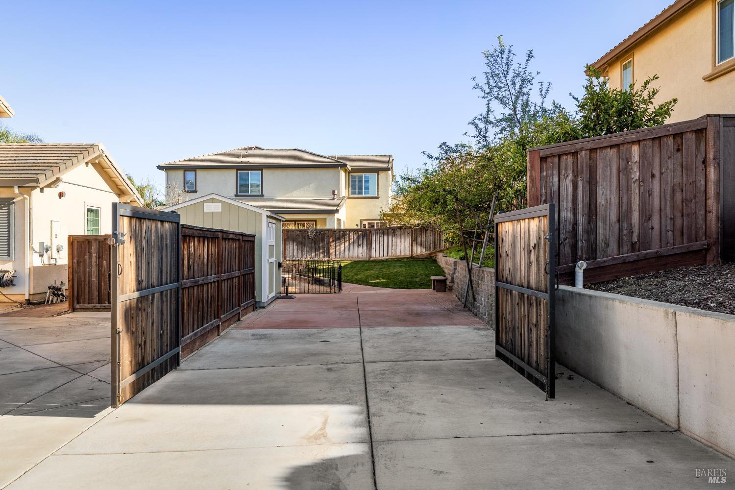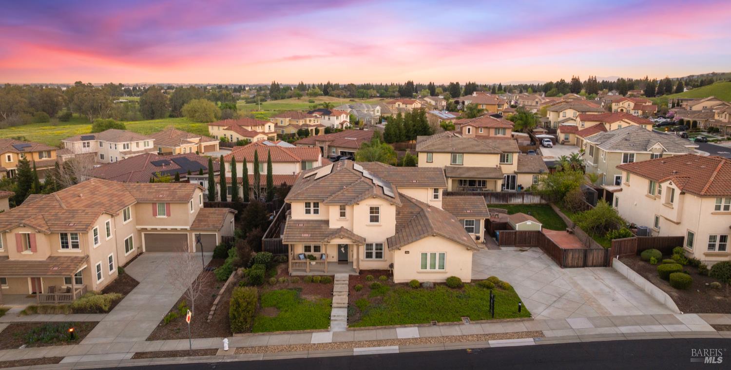 Tucked into Vacaville's highly sought after Cheyenne community in Browns Valley, this exceptional luxury residence with owned solar offers nearly 4,000 sq ft of beautifully designed living space on over a quarter acre premium lot with a 3-car garage and expanded driveway featuring pull through RV parking and backyard gate access. The impressive floorplan includes 6 bedrooms and 4.5 baths with 2 bedrooms on the main level including a private ensuite ideal for guests or multigenerational living plus an additional room (6th bedroom option) with exterior access, ideal for a home office, gym or playroom. The heart of the home is a stunning chef's kitchen with an oversized island with sink and bar seating, granite countertops, gas cooktop with hood, built-in double oven, newly installed dishwasher and built-in microwave as well as a spacious butler's pantry with wine storage and massive walk-in pantry, all opening to a large breakfast area and inviting great room with a gas fireplace. Elegant formal living and dining rooms create beautiful entertaining spaces while upstairs features 4 additional bedrooms including a luxurious primary suite with a spa-style bathroom with soaking tub, glass oversized shower, dual vanities and 2-walk in closets, plus a convenient upstairs laundry room with cabinetry and laundry closet. Interior upgrades include luxury vinyl plank flooring, recessed lighting, chandeliers, dual zone HVAC and a finished garage with epoxy flooring. The private backyard features a massive 13'x22' patio overhang with electrical and ceiling fan that anchors the space, creating the perfect setting for shaded gatherings and relaxed evenings. Additionally, retaining walls, garden, grass and patio areas, 8'x10' Tuff Shed and expansive side yards maximize the lot. Energy efficient features include dual pane windows, an upgraded tankless water heater and water softener. Located just minutes from parks, a top-ranked fitness center with a pool, shopping, dining and freeway access, this extraordinary Browns Valley home offers luxury living, space and flexibility in one of Vacaville's most desirable neighborhoods.