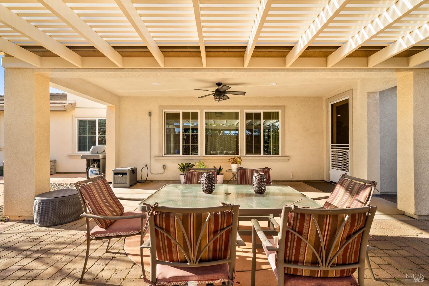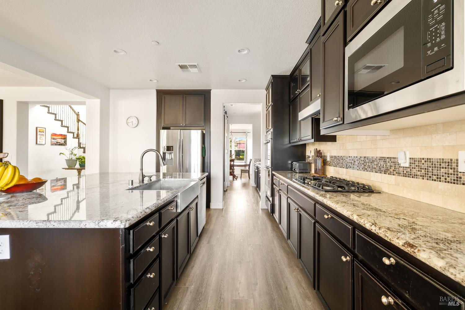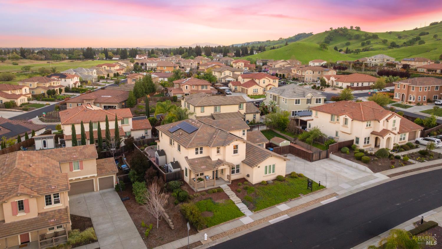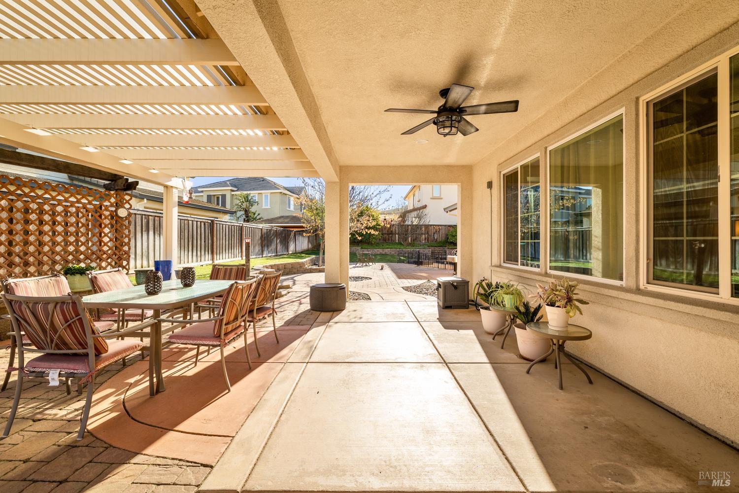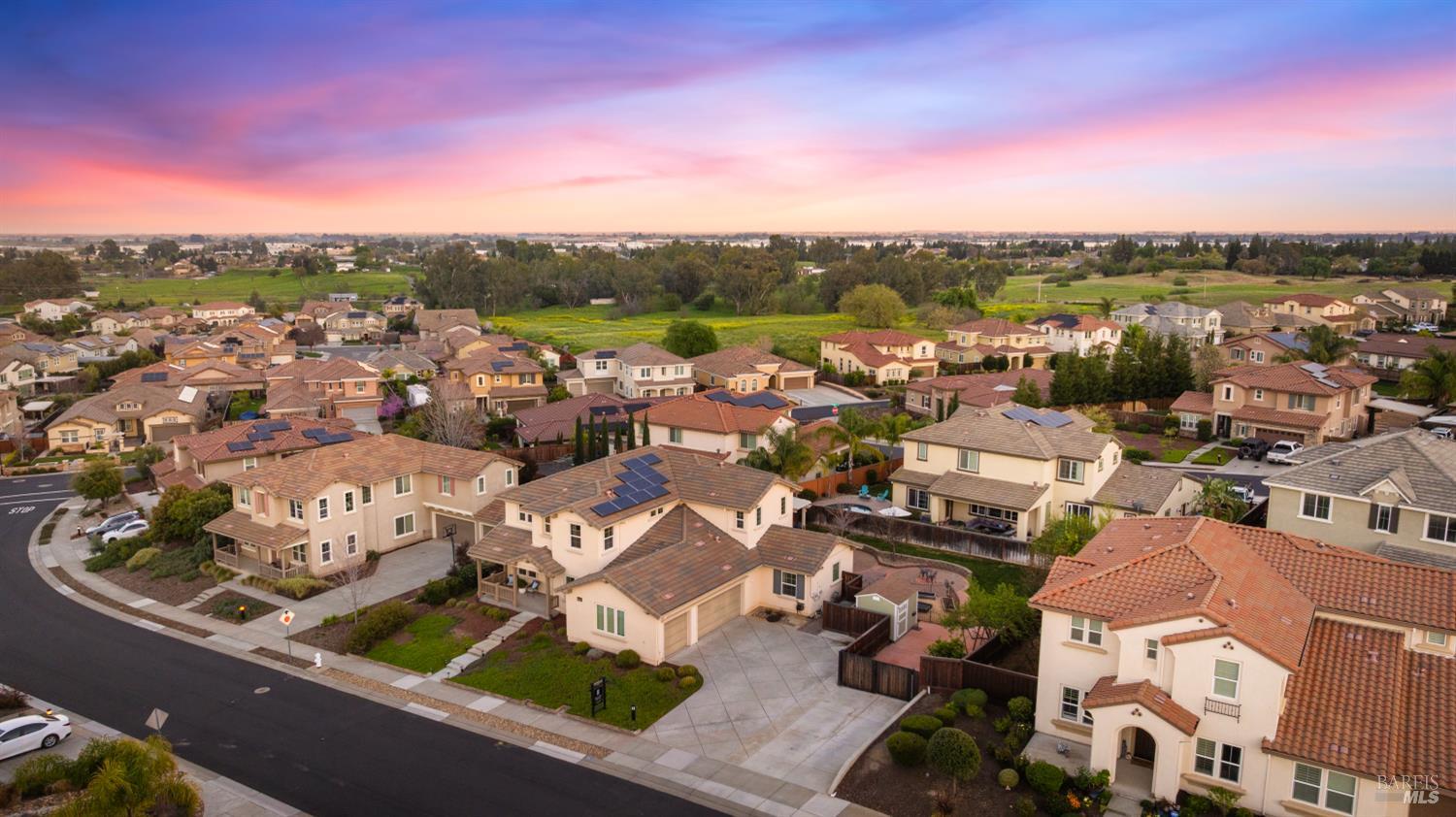Tucked into Vacaville's highly sought after Cheyenne community in Browns Valley, this exceptional luxury residence with owned solar offers nearly 4,000 sq ft of beautifully designed living space on over a quarter acre premium lot with a 3-car garage and expanded driveway featuring pull through RV parking and backyard gate access. The impressive floorplan includes 6 bedrooms and 4.5 baths with 2 bedrooms on the main level including a private ensuite ideal for guests or multigenerational living plus an additional room (6th bedroom option) with exterior access, ideal for a home office, gym or playroom. The heart of the home is a stunning chef's kitchen with an oversized island with sink and bar seating, granite countertops, gas cooktop with hood, built-in double oven, newly installed dishwasher and built-in microwave as well as a spacious butler's pantry with wine storage and massive walk-in pantry, all opening to a large breakfast area and inviting great room with a gas fireplace. Elegant formal living and dining rooms create beautiful entertaining spaces while upstairs features 4 additional bedrooms including a luxurious primary suite with a spa-style bathroom with soaking tub, glass oversized shower, dual vanities and 2-walk in closets, plus a convenient upstairs laundry room with cabinetry and laundry closet. Interior upgrades include luxury vinyl plank flooring, recessed lighting, chandeliers, dual zone HVAC and a finished garage with epoxy flooring. The private backyard features a massive 13'x22' patio overhang with electrical and ceiling fan that anchors the space, creating the perfect setting for shaded gatherings and relaxed evenings. Additionally, retaining walls, garden, grass and patio areas, 8'x10' Tuff Shed and expansive side yards maximize the lot. Energy efficient features include dual pane windows, an upgraded tankless water heater and water softener. Located just minutes from parks, a top-ranked fitness center with a pool, shopping, dining and freeway access, this extraordinary Browns Valley home offers luxury living, space and flexibility in one of Vacaville's most desirable neighborhoods.