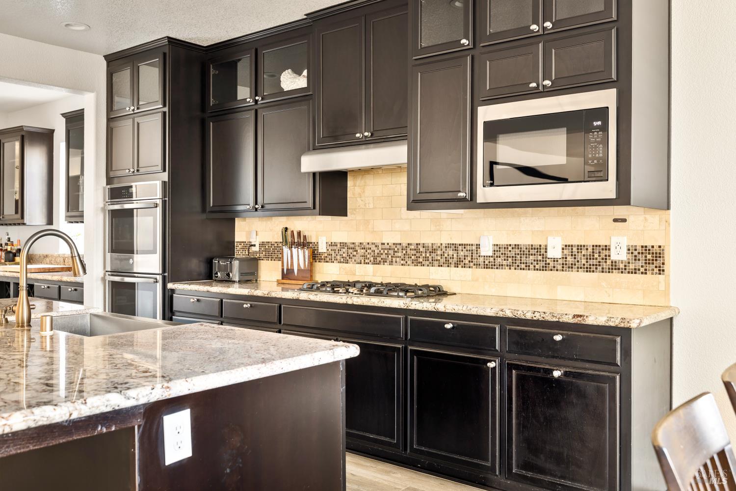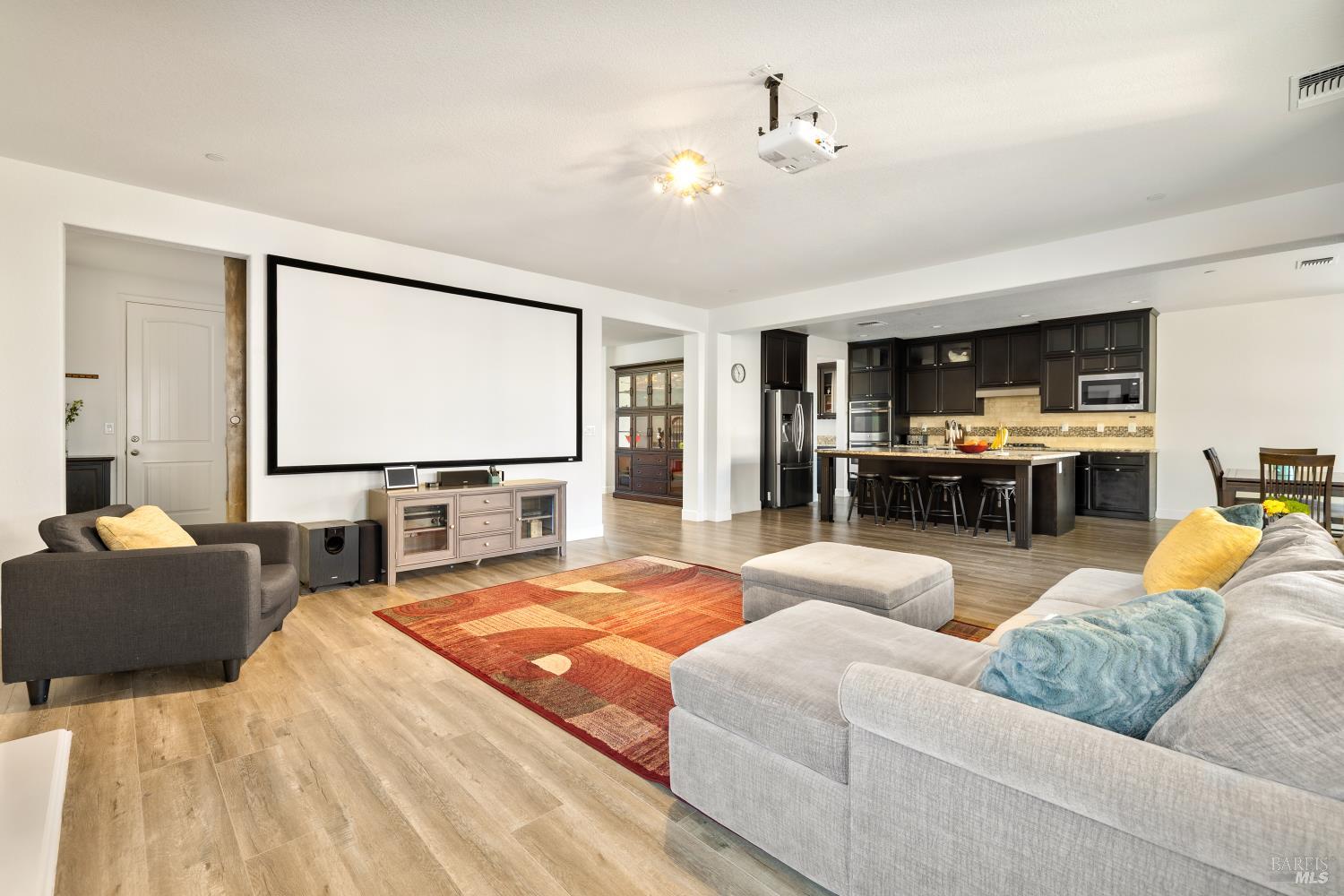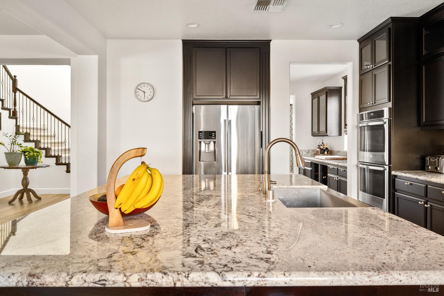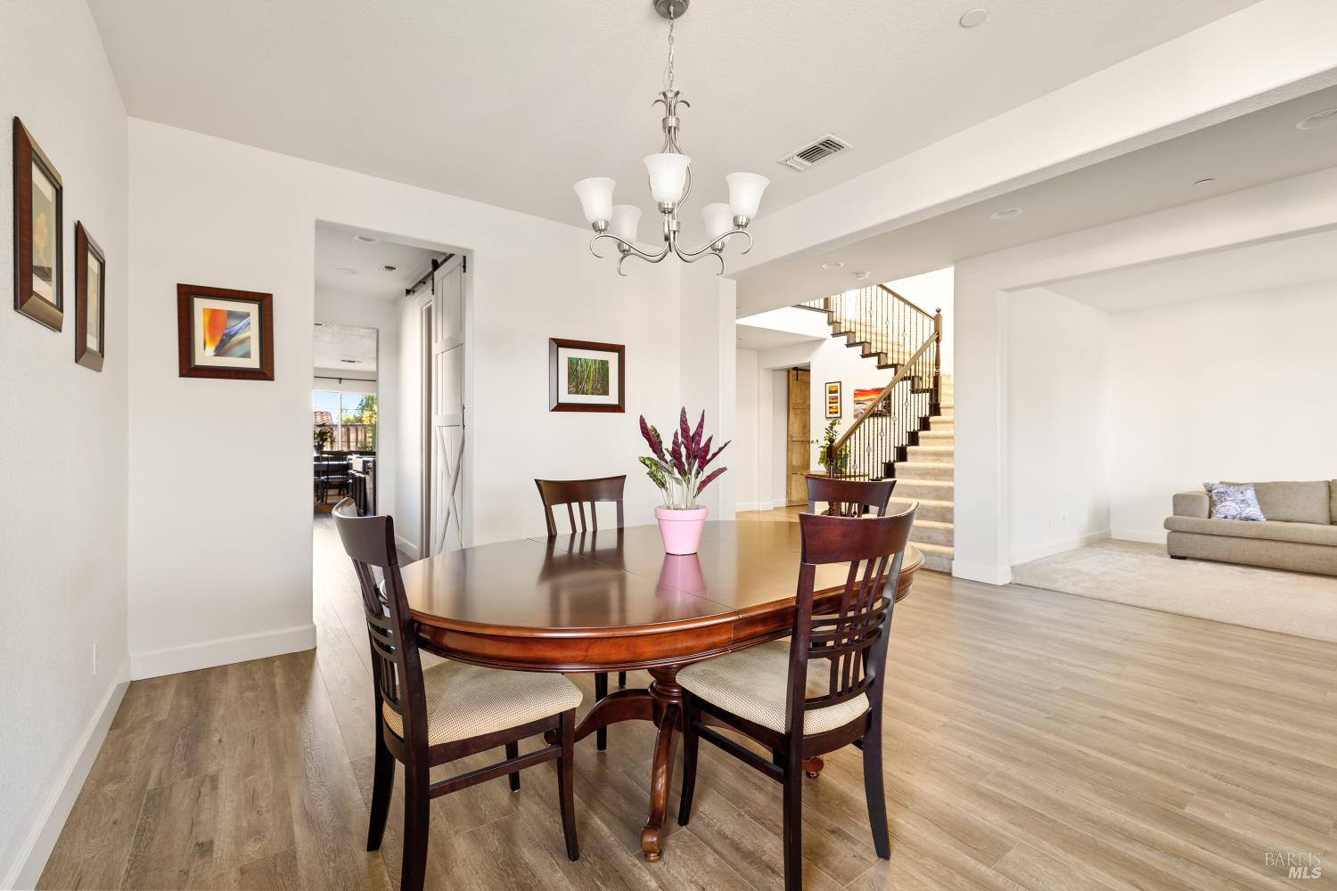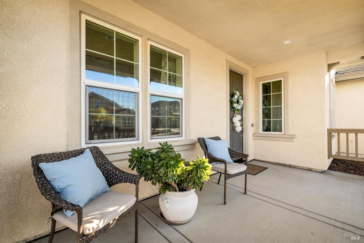 Tucked into Vacaville's highly sought after Cheyenne community in Browns Valley, this exceptional luxury residence with owned solar offers nearly 4,000 sq ft of beautifully designed living space on over a quarter acre premium lot with a 3-car garage and expanded driveway featuring pull through RV parking and backyard gate access. The impressive floorplan includes 6 bedrooms and 4.5 baths with 2 bedrooms on the main level including a private ensuite ideal for guests or multigenerational living plus an additional room (6th bedroom option) with exterior access, ideal for a home office, gym or playroom. The heart of the home is a stunning chef's kitchen with an oversized island with sink and bar seating, granite countertops, gas cooktop with hood, built-in double oven, newly installed dishwasher and built-in microwave as well as a spacious butler's pantry with wine storage and massive walk-in pantry, all opening to a large breakfast area and inviting great room with a gas fireplace. Elegant formal living and dining rooms create beautiful entertaining spaces while upstairs features 4 additional bedrooms including a luxurious primary suite with a spa-style bathroom with soaking tub, glass oversized shower, dual vanities and 2-walk in closets, plus a convenient upstairs laundry room with cabinetry and laundry closet. Interior upgrades include luxury vinyl plank flooring, recessed lighting, chandeliers, dual zone HVAC and a finished garage with epoxy flooring. The private backyard features a massive 13'x22' patio overhang with electrical and ceiling fan that anchors the space, creating the perfect setting for shaded gatherings and relaxed evenings. Additionally, retaining walls, garden, grass and patio areas, 8'x10' Tuff Shed and expansive side yards maximize the lot. Energy efficient features include dual pane windows, an upgraded tankless water heater and water softener. Located just minutes from parks, a top-ranked fitness center with a pool, shopping, dining and freeway access, this extraordinary Browns Valley home offers luxury living, space and flexibility in one of Vacaville's most desirable neighborhoods.