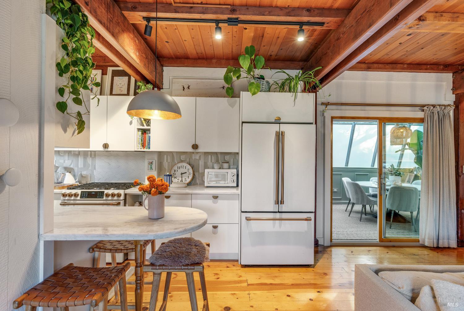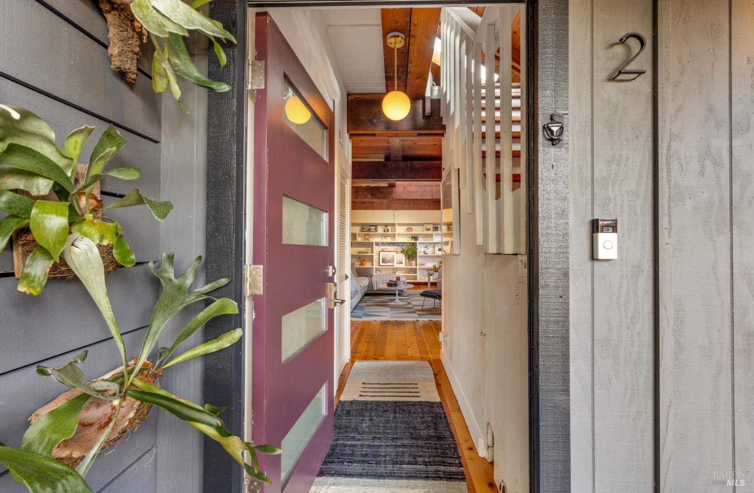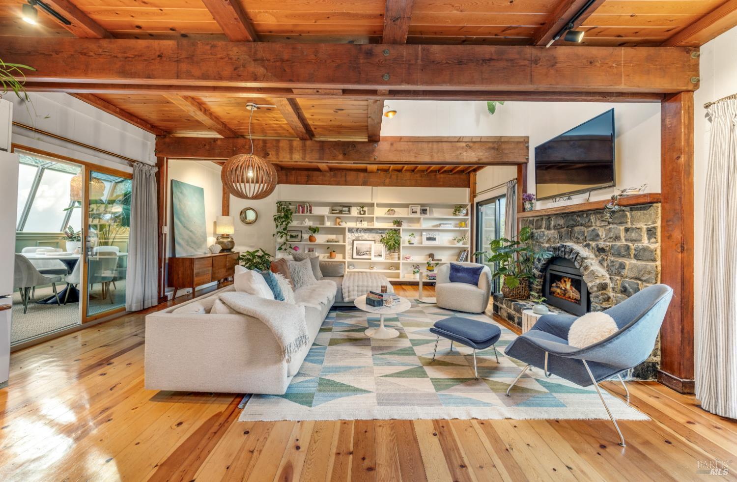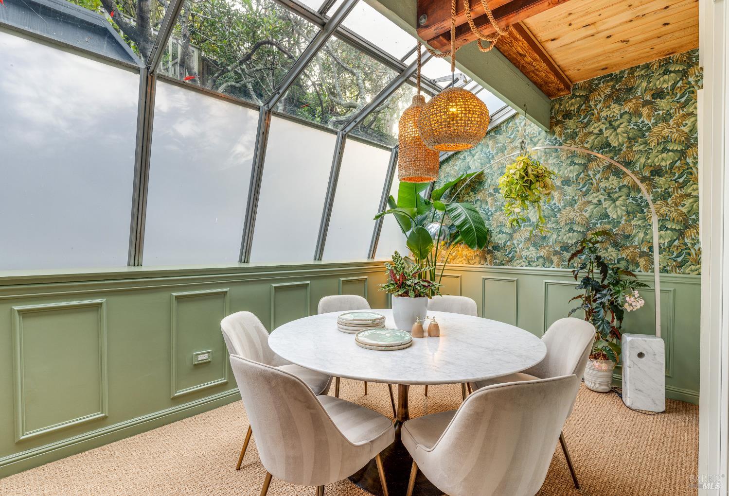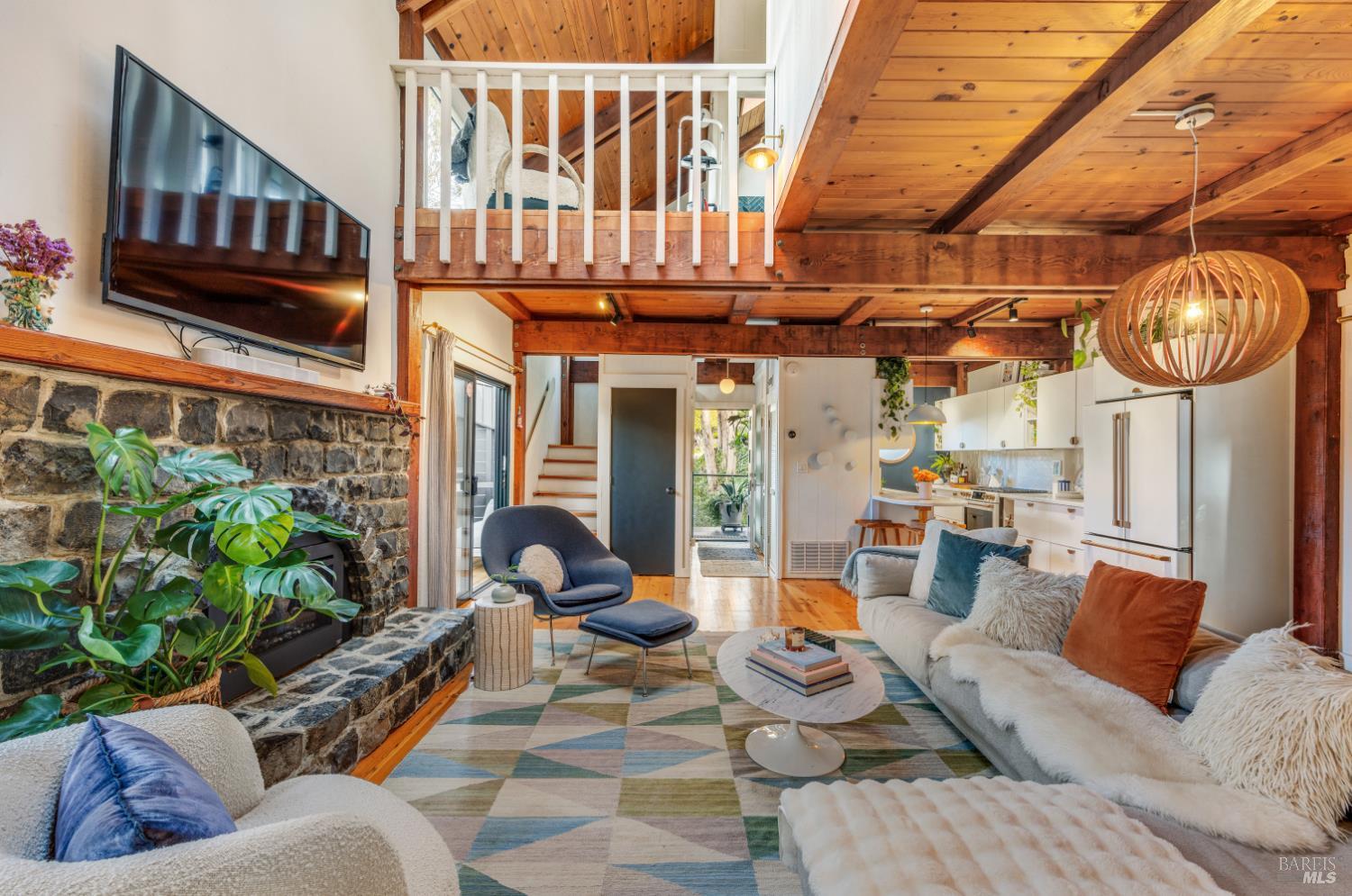 Prepare to fall in love with this 3BD/2.5BA peaceful, mid-century redwood retreat, a rare Sausalito sanctuary tucked into an expansive corner lot at the north end of town. Built in the 1960s, this soulful residence has been meticulously maintained by its limited three owners, and thoughtfully reimagined blending timeless mid-century architecture with a suite of sophisticated, designer-grade modern upgrades by present owner. The main level centers around a dramatic great room, where exposed wood beams, soaring ceilings, and a natural-stone hearth framing the gas fireplace provide a stunning backdrop of architectural character. Sunlight pours in through skylight and windows, creating a warm, inviting space that opens effortlessly to an expansive west-facing deck your private perch for sunsets, morning coffee, or entertaining under the trees. The connected signature sunroom/solarium is a plant-lover's paradise, offering skylights that open and a greenhouse-like ambiance that beautifully integrates indoor and outdoor living for this ultra flexible space. The remodeled galley style chef's kitchen is both functional and stylish, featuring gas range, crisp matte white cabinetry, elegant brass hardware, open shelving, sleek stone counters, and a charming circular window that perfectly frames the wooded surroundings. Private quarters & versatile spaces upstairs! Two spacious bedrooms offer vaulted ceilings and tranquil treetop views. The serene primary bedroom includes a loft-style office area an ideal private space for focused remote work, morning yoga or quiet reading. The detached studio (formerly the garage) presents a unique opportunity for flexible living or potential income. With soaring ceilings, abundant natural light, a heat/AC unit and its own full bathroom, this space is perfectly suited as a professional artist's workspace, home gym, luxurious guest suite, or a private executive office. Located just one block from the public tennis and pickleball courts, a par course, and a local park, this home sits within one of Sausalito's most beloved, community-oriented neighborhoods. Enjoy local amenities: shopping centers, reputable schools, public transit options, acclaimed restaurants, and scenic waterfront paths are all moments away, offering the quintessential Sausalito lifestyle.