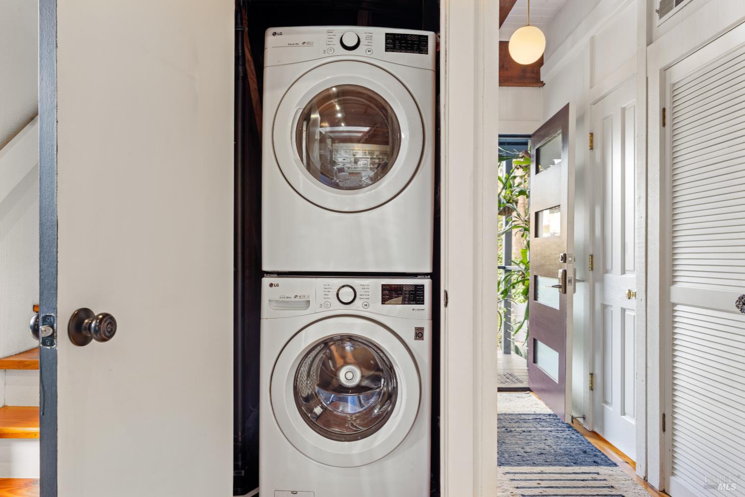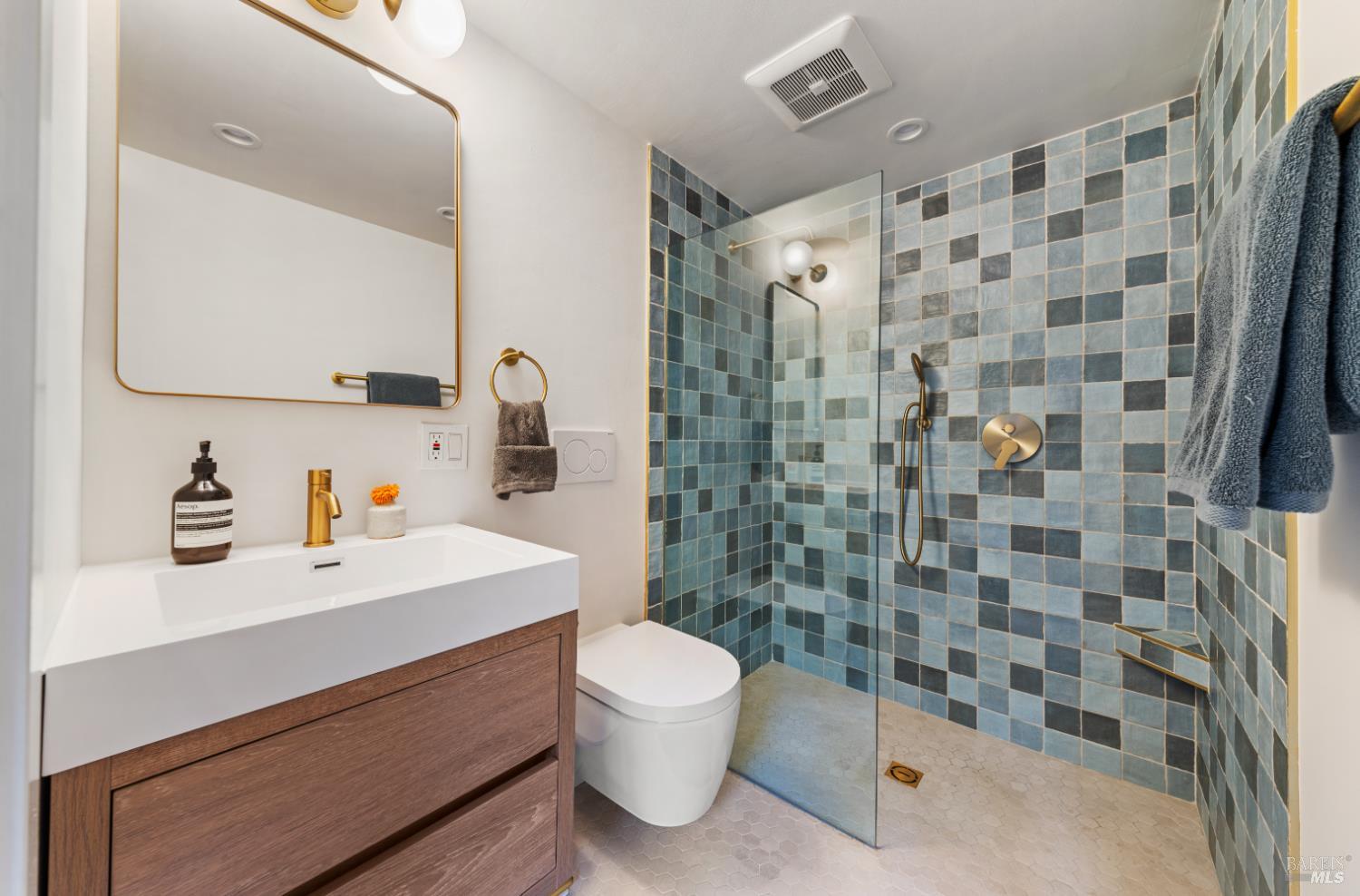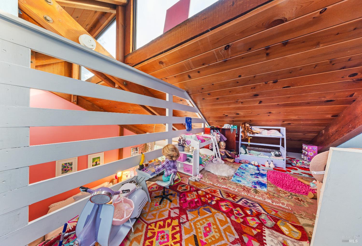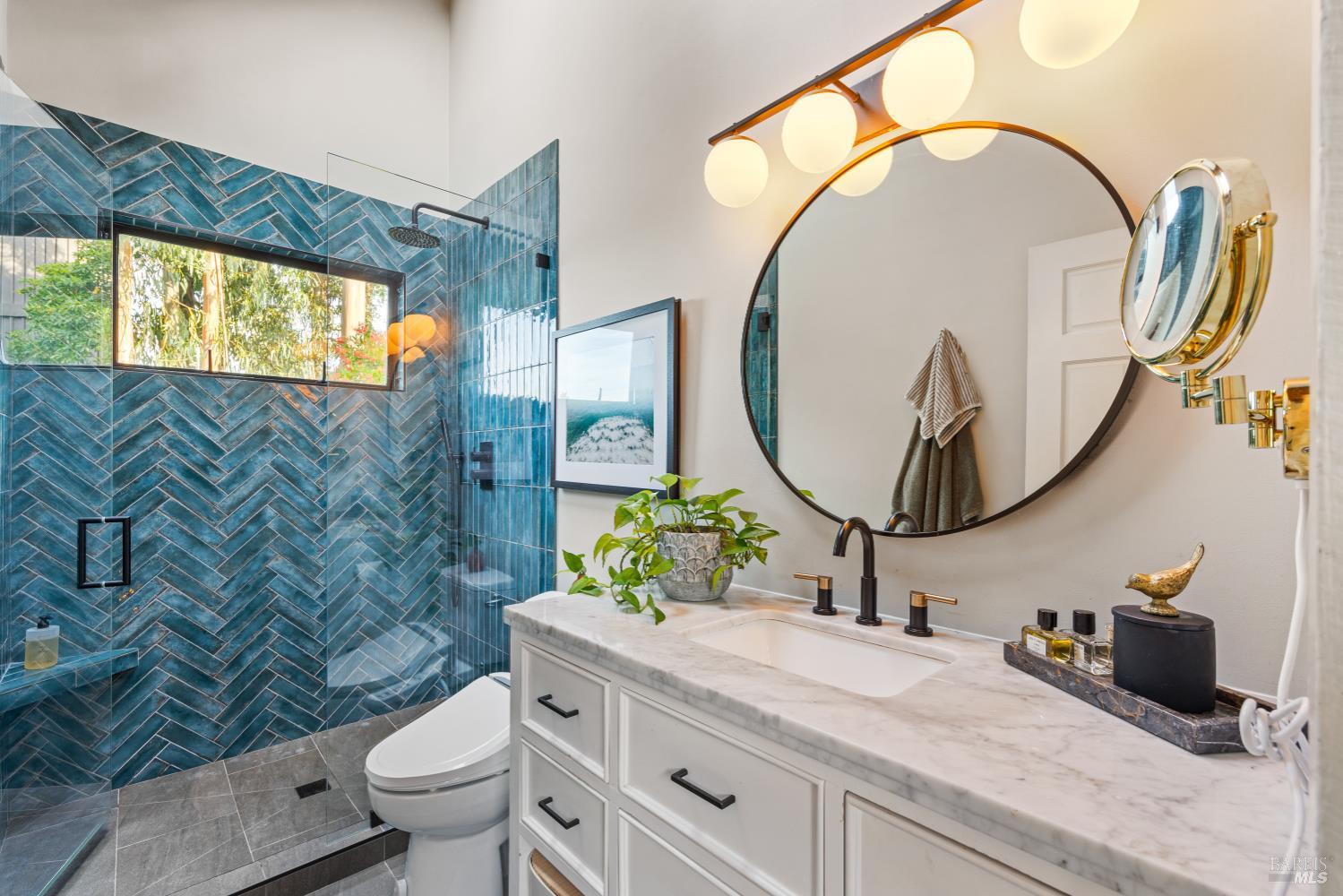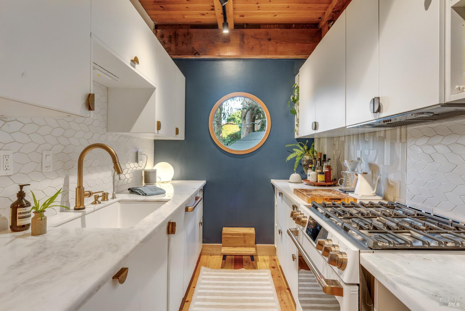Prepare to fall in love with this 3BD/2.5BA peaceful, mid-century redwood retreat, a rare Sausalito sanctuary tucked into an expansive corner lot at the north end of town. Built in the 1960s, this soulful residence has been meticulously maintained by its limited three owners, and thoughtfully reimagined blending timeless mid-century architecture with a suite of sophisticated, designer-grade modern upgrades by present owner. The main level centers around a dramatic great room, where exposed wood beams, soaring ceilings, and a natural-stone hearth framing the gas fireplace provide a stunning backdrop of architectural character. Sunlight pours in through skylight and windows, creating a warm, inviting space that opens effortlessly to an expansive west-facing deck your private perch for sunsets, morning coffee, or entertaining under the trees. The connected signature sunroom/solarium is a plant-lover's paradise, offering skylights that open and a greenhouse-like ambiance that beautifully integrates indoor and outdoor living for this ultra flexible space. The remodeled galley style chef's kitchen is both functional and stylish, featuring gas range, crisp matte white cabinetry, elegant brass hardware, open shelving, sleek stone counters, and a charming circular window that perfectly frames the wooded surroundings. Private quarters & versatile spaces upstairs! Two spacious bedrooms offer vaulted ceilings and tranquil treetop views. The serene primary bedroom includes a loft-style office area an ideal private space for focused remote work, morning yoga or quiet reading. The detached studio (formerly the garage) presents a unique opportunity for flexible living or potential income. With soaring ceilings, abundant natural light, a heat/AC unit and its own full bathroom, this space is perfectly suited as a professional artist's workspace, home gym, luxurious guest suite, or a private executive office. Located just one block from the public tennis and pickleball courts, a par course, and a local park, this home sits within one of Sausalito's most beloved, community-oriented neighborhoods. Enjoy local amenities: shopping centers, reputable schools, public transit options, acclaimed restaurants, and scenic waterfront paths are all moments away, offering the quintessential Sausalito lifestyle.
