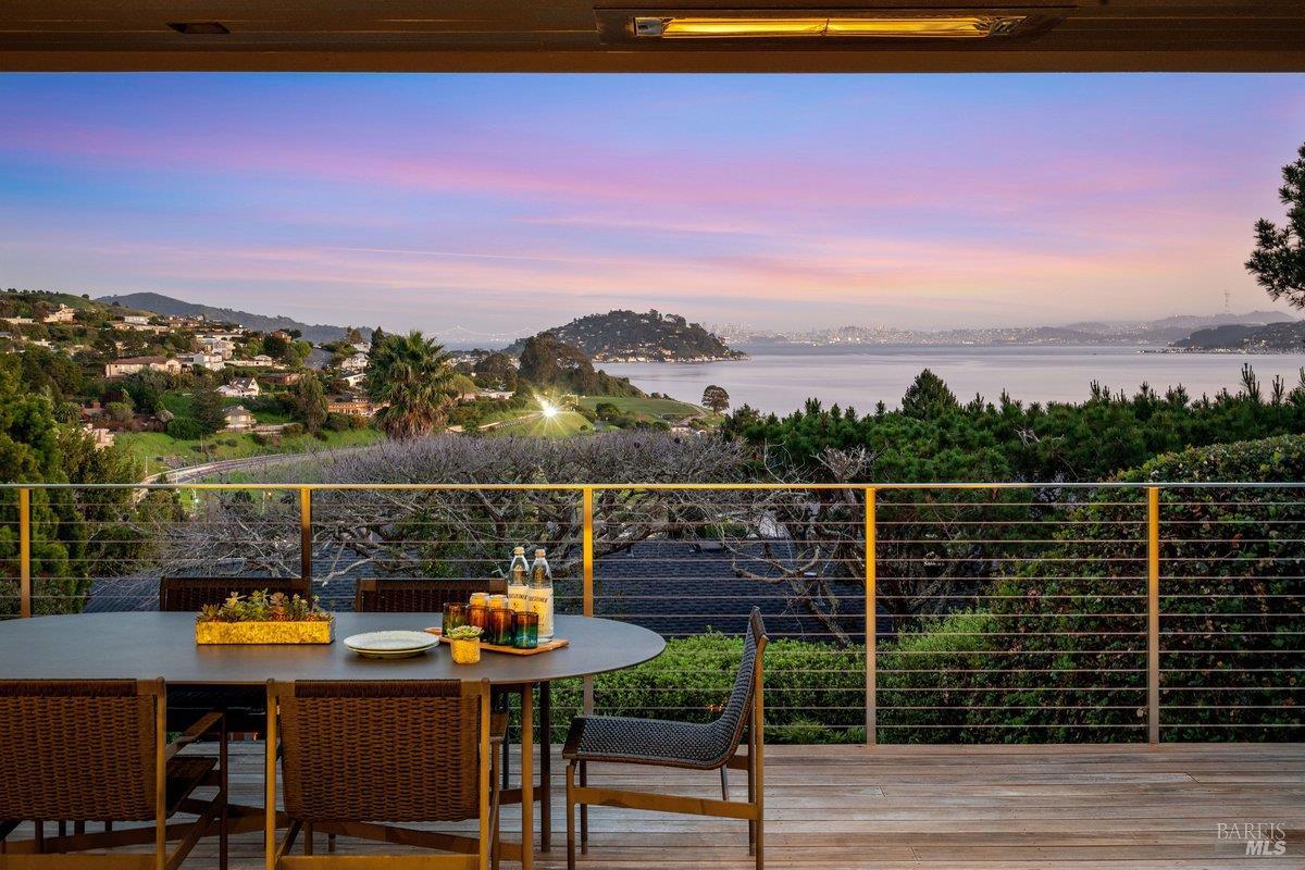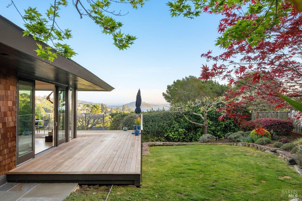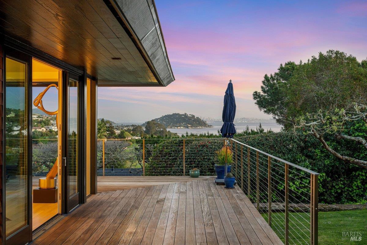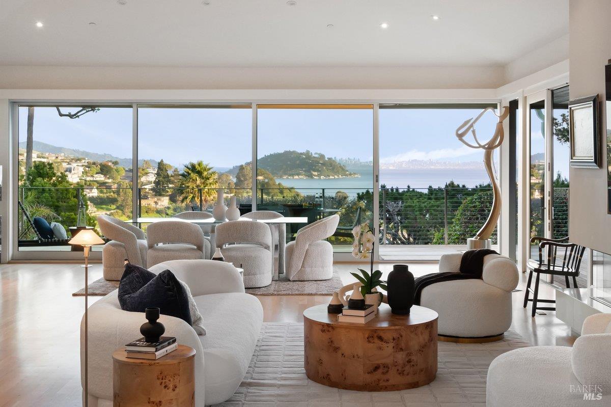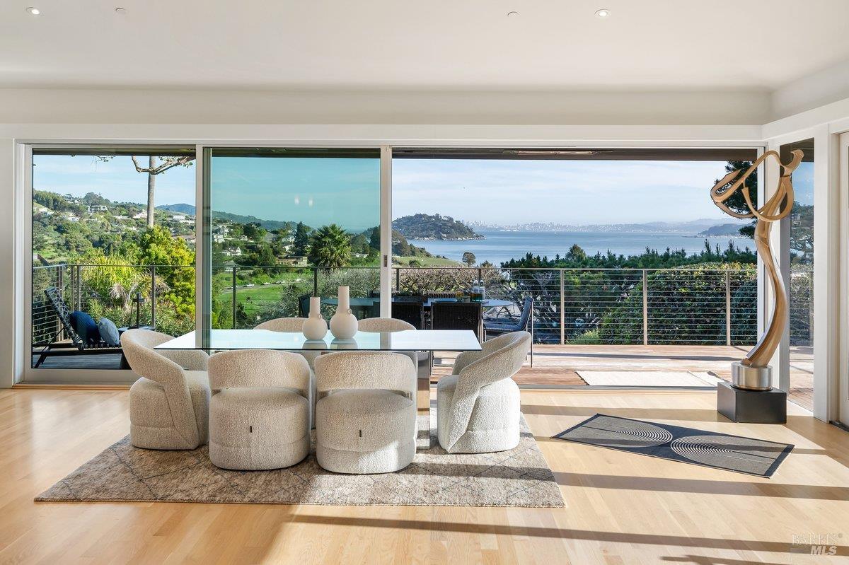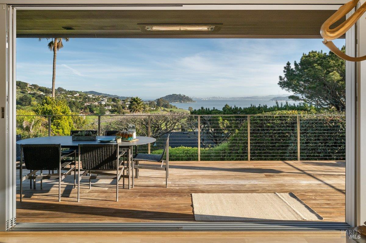 Perched on a private, oversized, south-facing lot, this beautifully updated contemporary Tiburon home captures sweeping views of the San Francisco Bay and City Skyline. Thoughtfully renovated and meticulously maintained, this home blends open-concept living, indoor-outdoor entertaining and flexible spaces ideal for families, remote work and multi-generational living. The main level functions comfortably as single-level living and features a light-filled open concept Great Room, Dining and Kitchen that flows seamlessly into a beautifully manicured garden. Graced with tall Fleetwood Sliding doors, an entire wall opens directly onto gorgeous Ipe decks with recessed heaters for enjoyment any time of the day. The Chef's kitchen features a large island graced with Brazilian Granite countertops and stainless steel appliances. A large walk-in pantry and mud room with custom built-ins and separate entry ensure that the needs of today's practical lifestyle are also met. The elegant primary suite also offers breathtaking views and is located down a light-filled hallway. No detail was spared in the striking renovated spa-like bath, dual custom closets, and built-in vanity. A private deck and hot tub completes this sophisticated retreat. There is an additional bedroom on this floor that has been outfitted as a home office with custom built-in desks and cabinetry. Downstairs are three additional bedrooms with wonderful light, views, high-ceilings along with two full baths, and a laundry room. Directly across a flat, grassy yard is a a detached 1-bedroom / 1-bath guest house with its own entrance that makes for the ultimate flex space as guest quarters, AuPair unit, secondary home office or workout room. Environmentally friendly features include owned solar, a battery back-up and EV charger in the 2-car detached garage. This home provides a rare combination of convenience and comfort for long-term livability through multiple stages of life. The coveted Reedlands neighborhood offers easy access to Blackies' Pasture, the Cove Shopping Center and Highway 101.